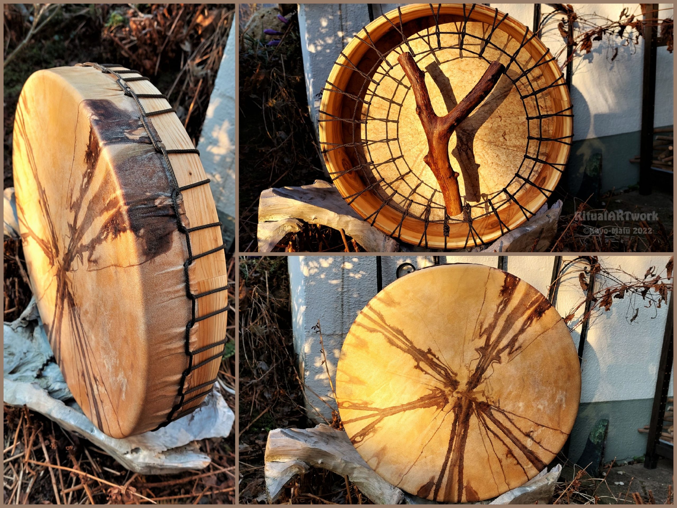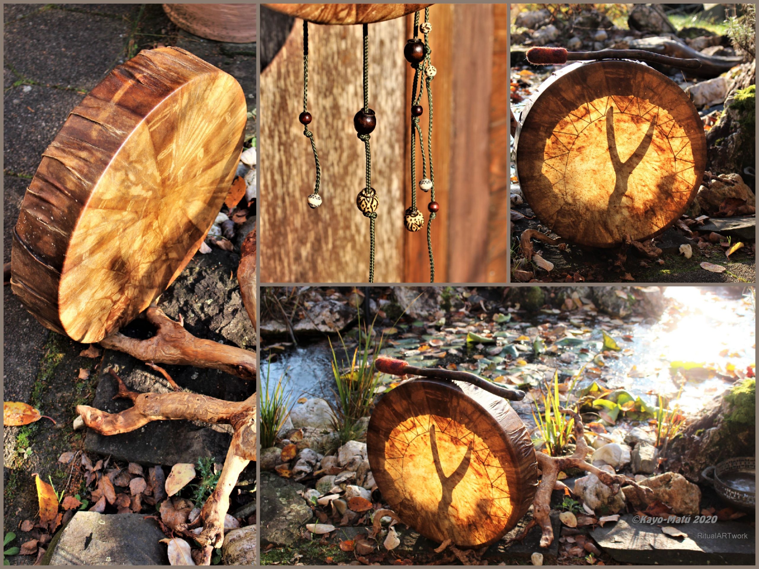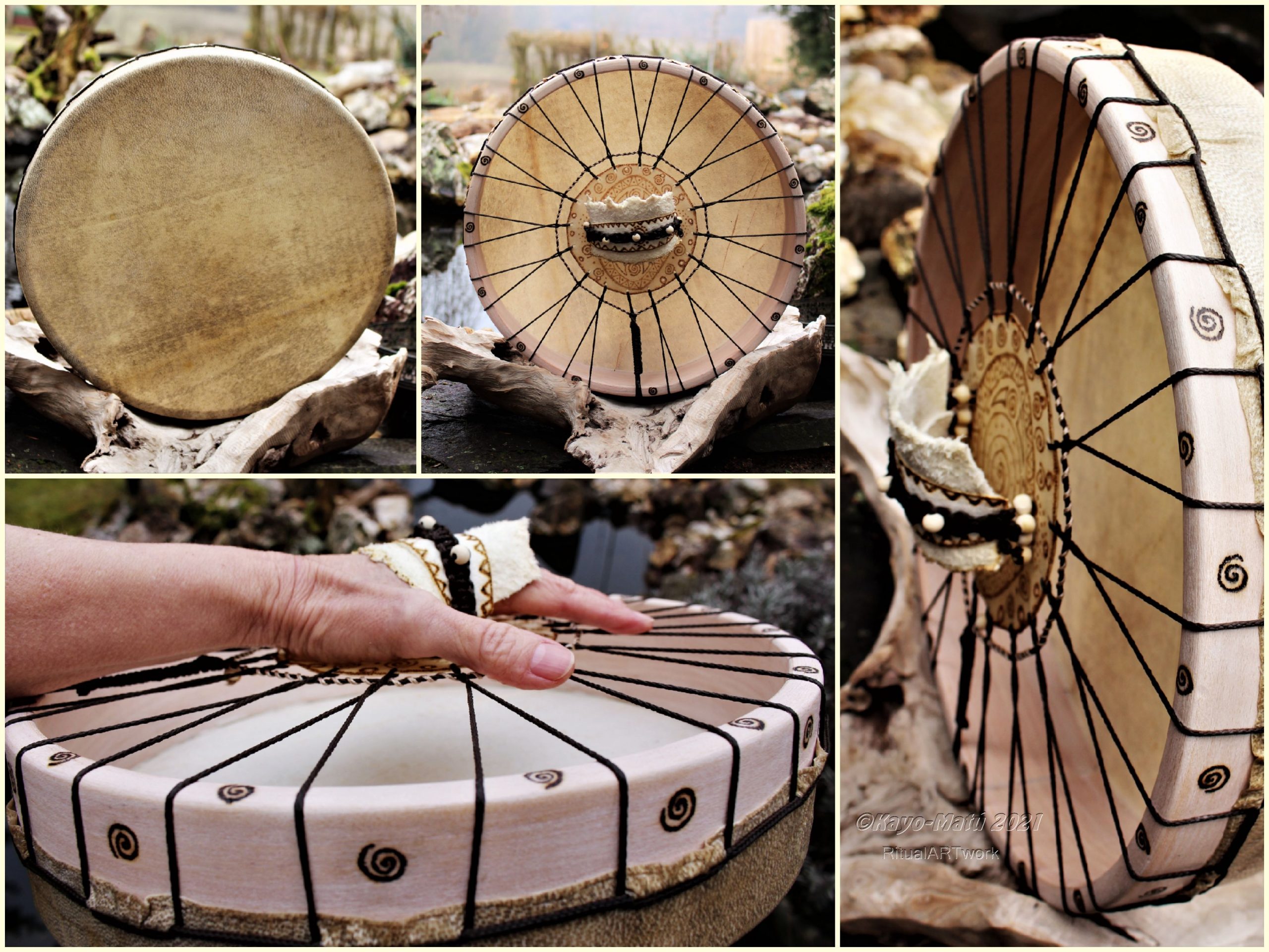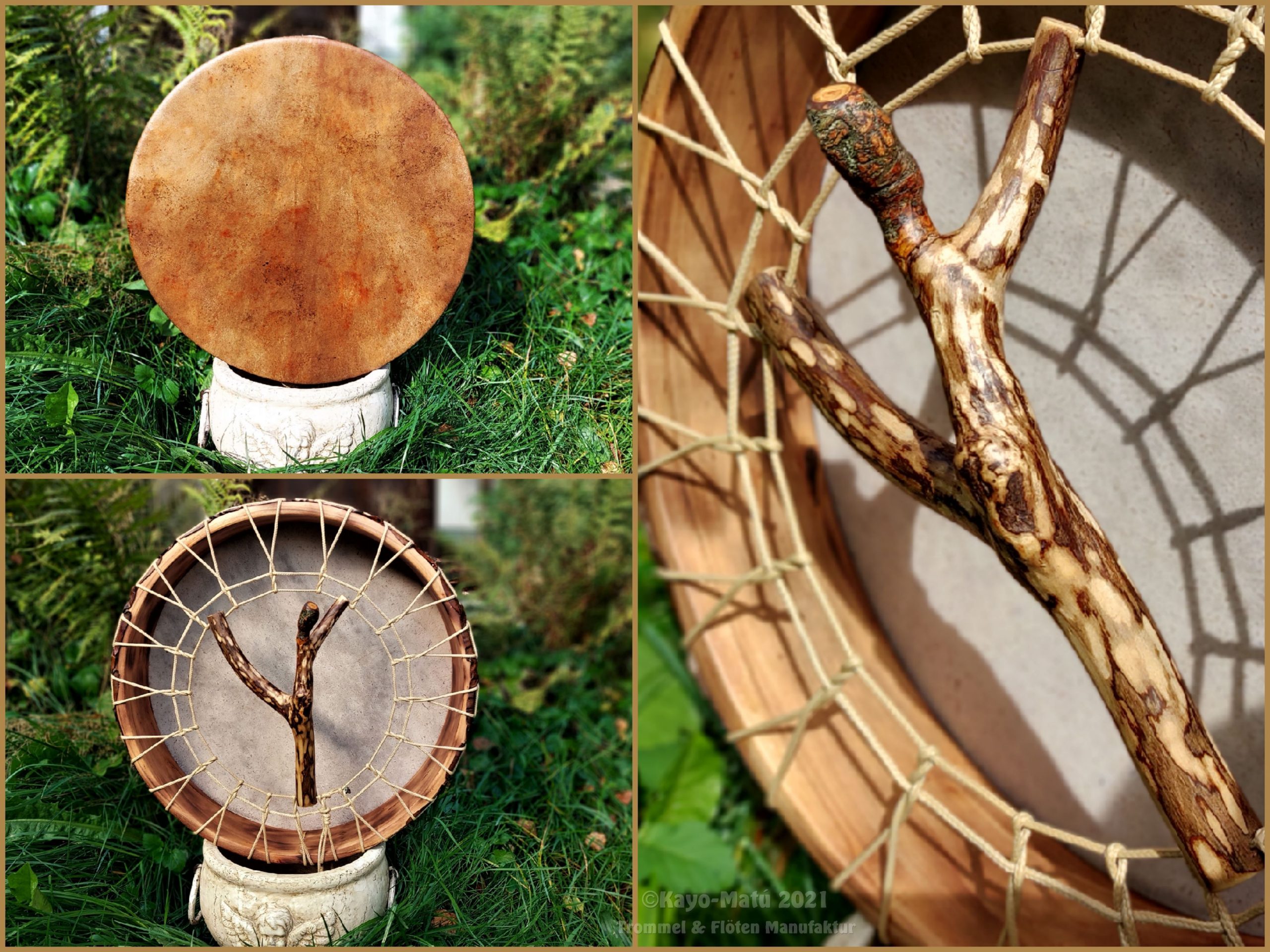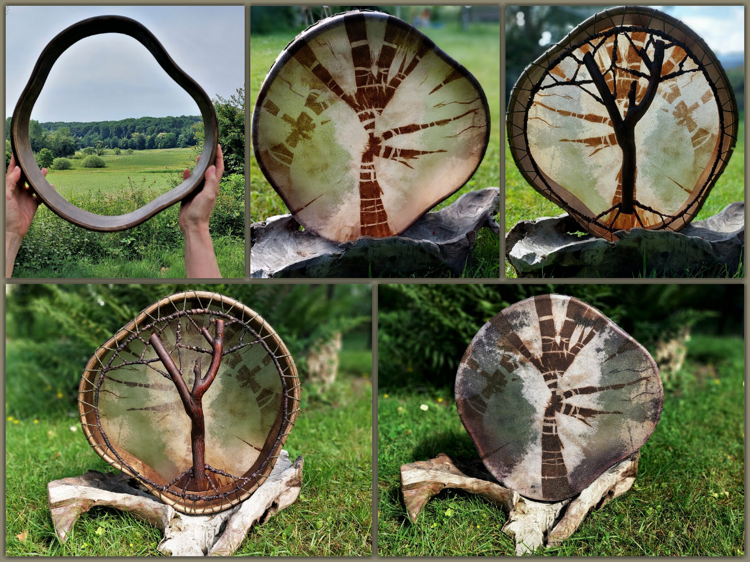 ► Ur-Form Trommeln – Selbst entworfene Trommelrahmen in Form eines natürlichen Baumstammes mit Handschuh als Halterung
