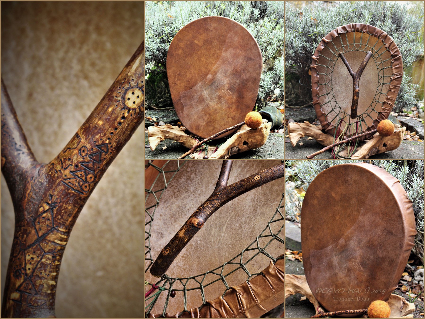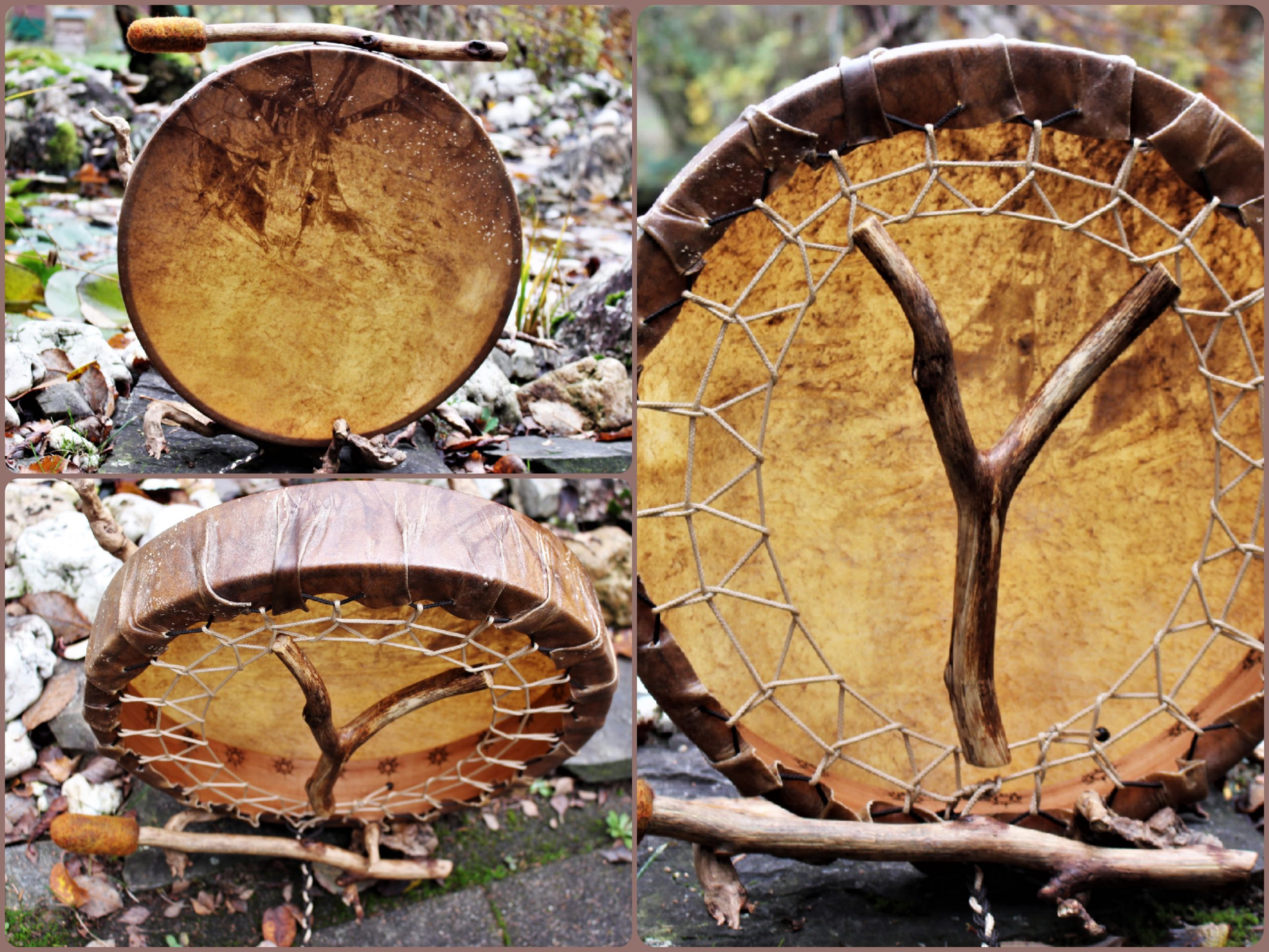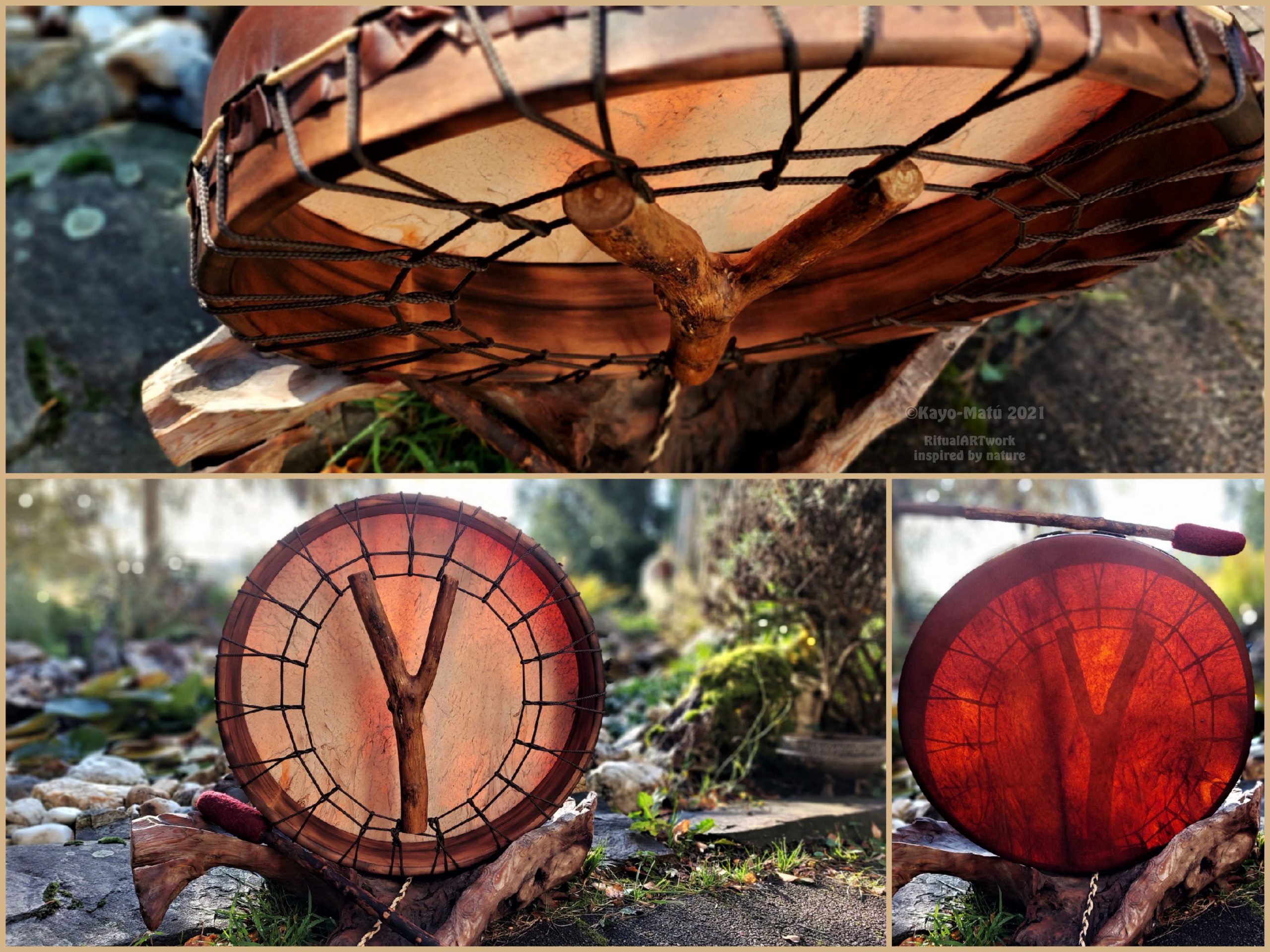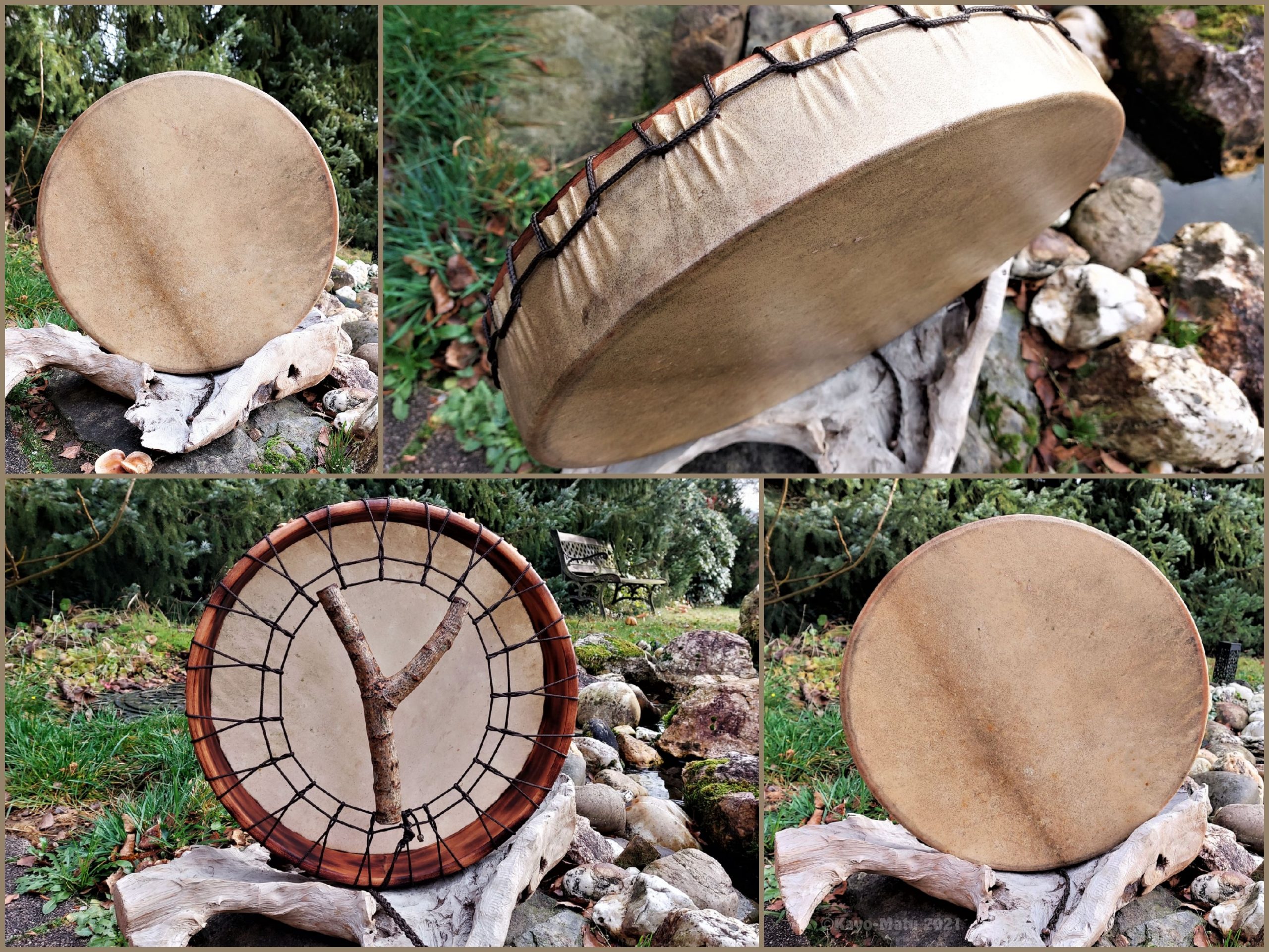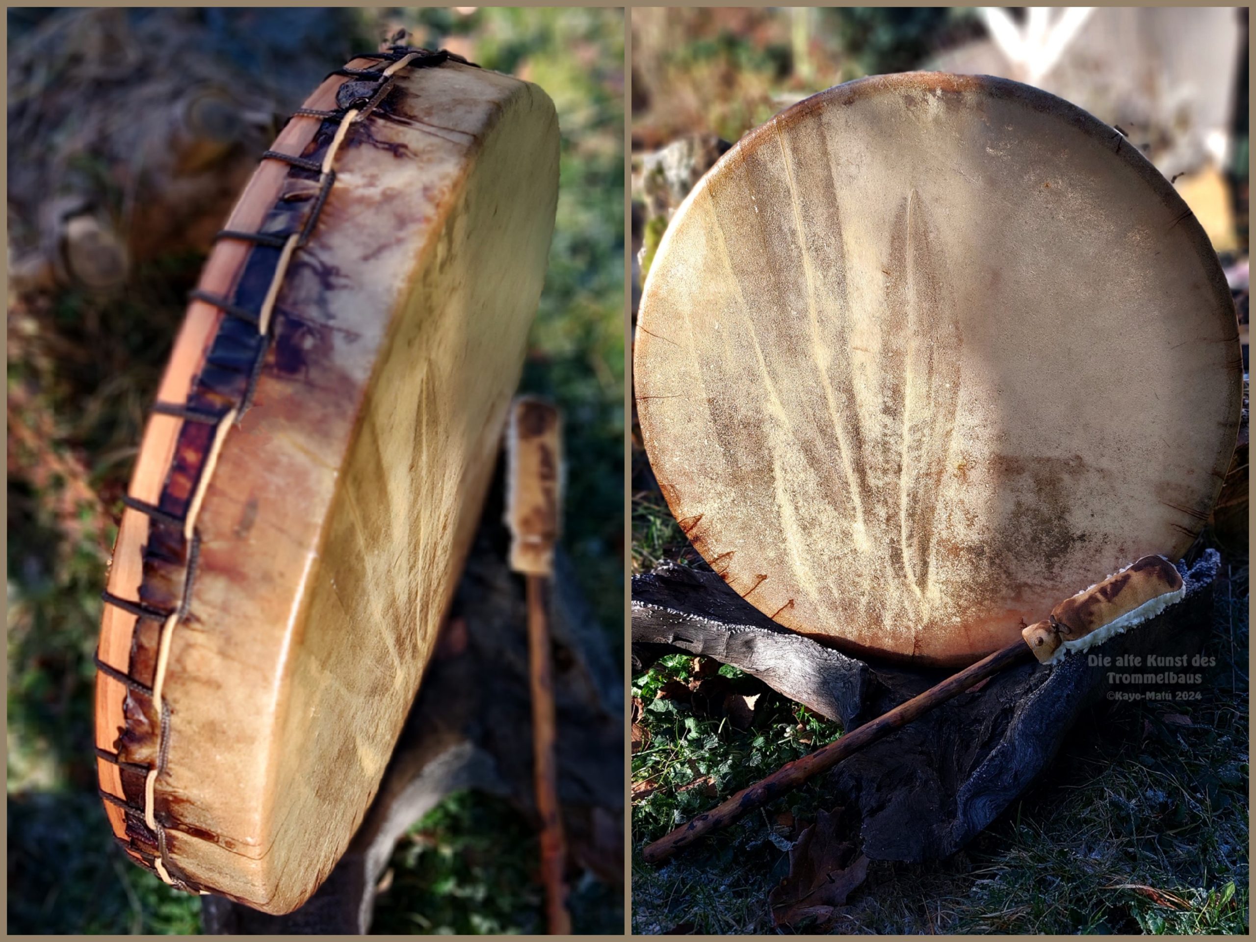 ► Ur-Form Trommeln – Selbst entworfene Trommelrahmen in Form eines natürlichen Baumstammes mit Handschuh als Halterung