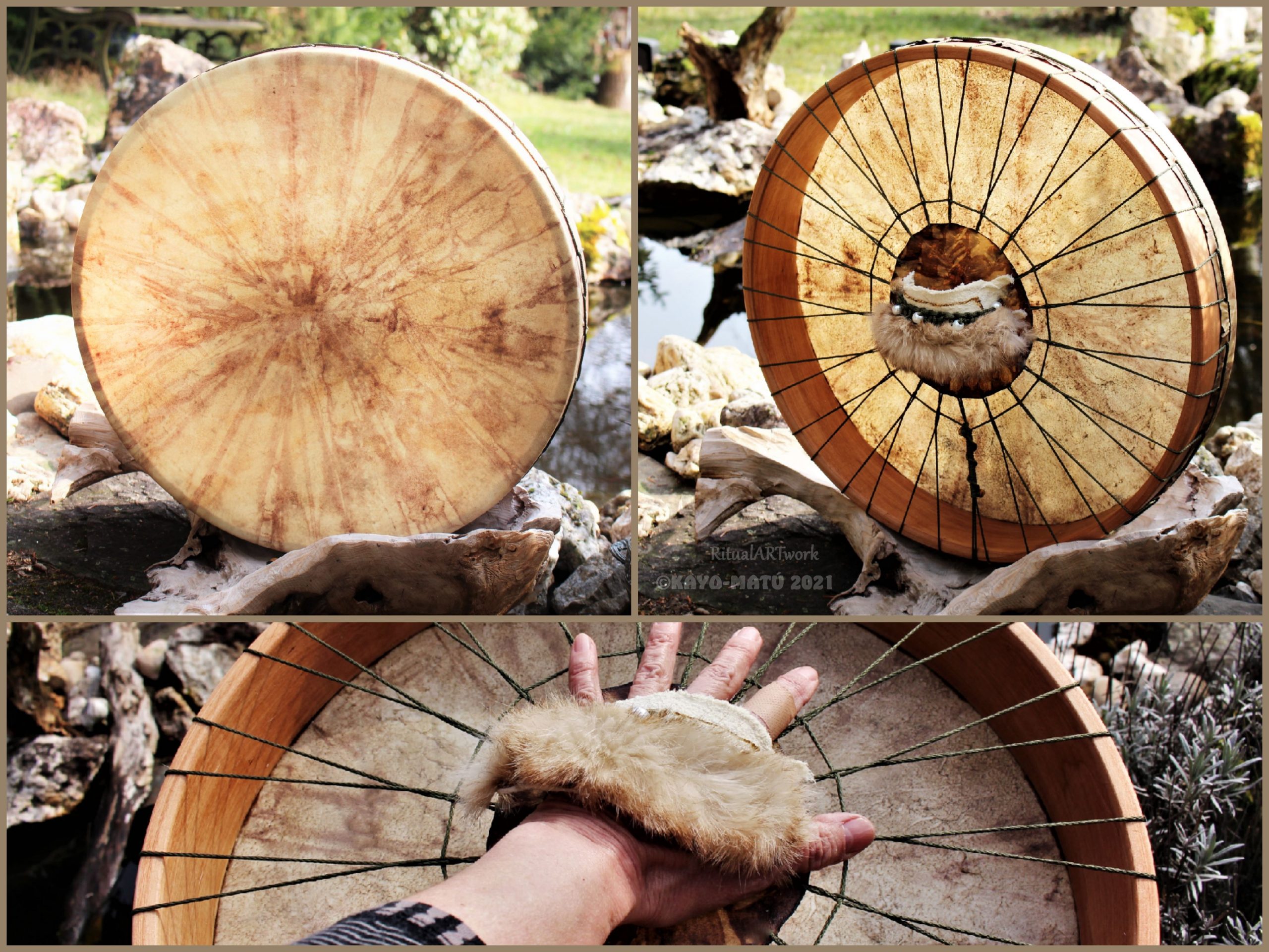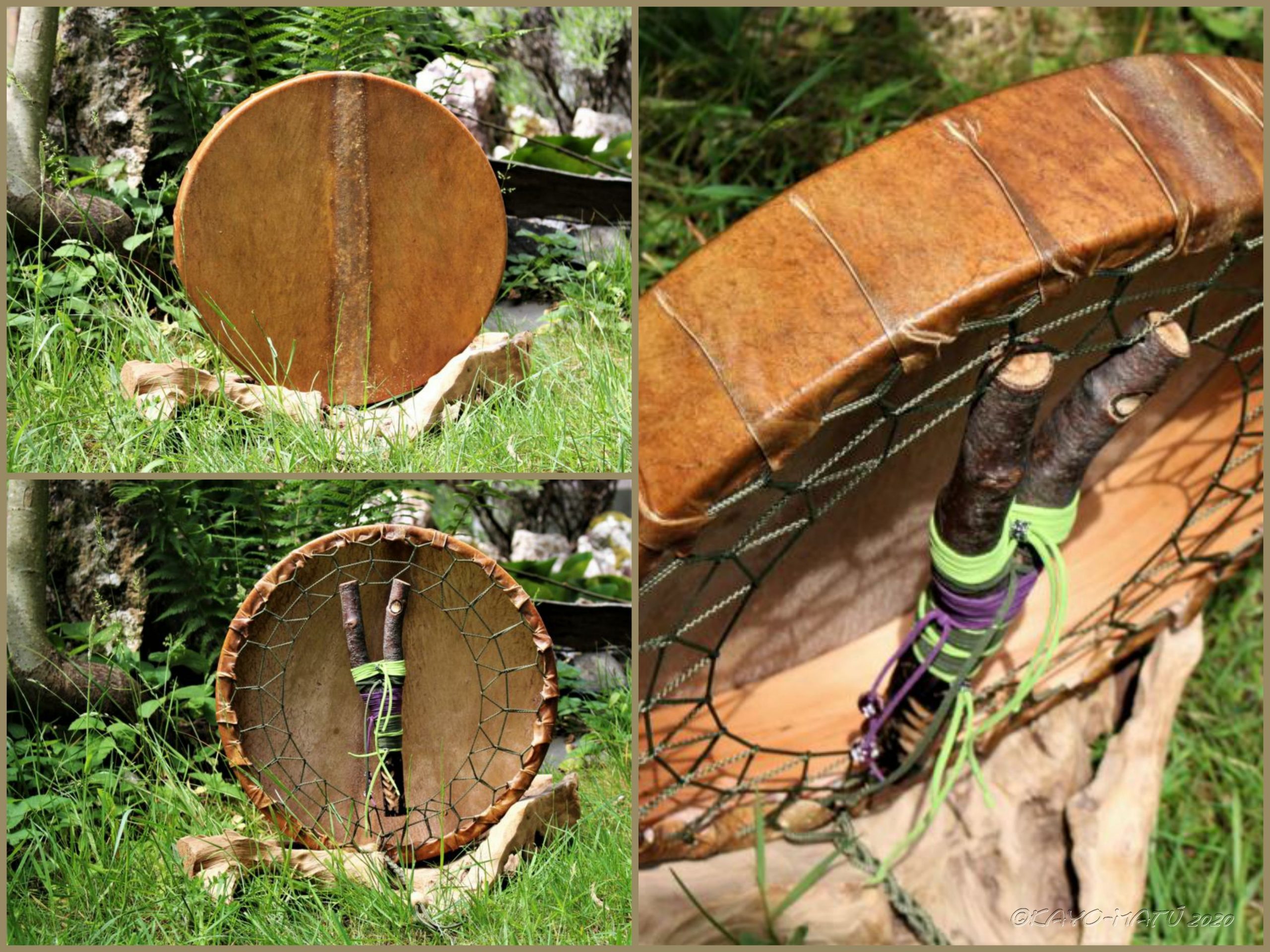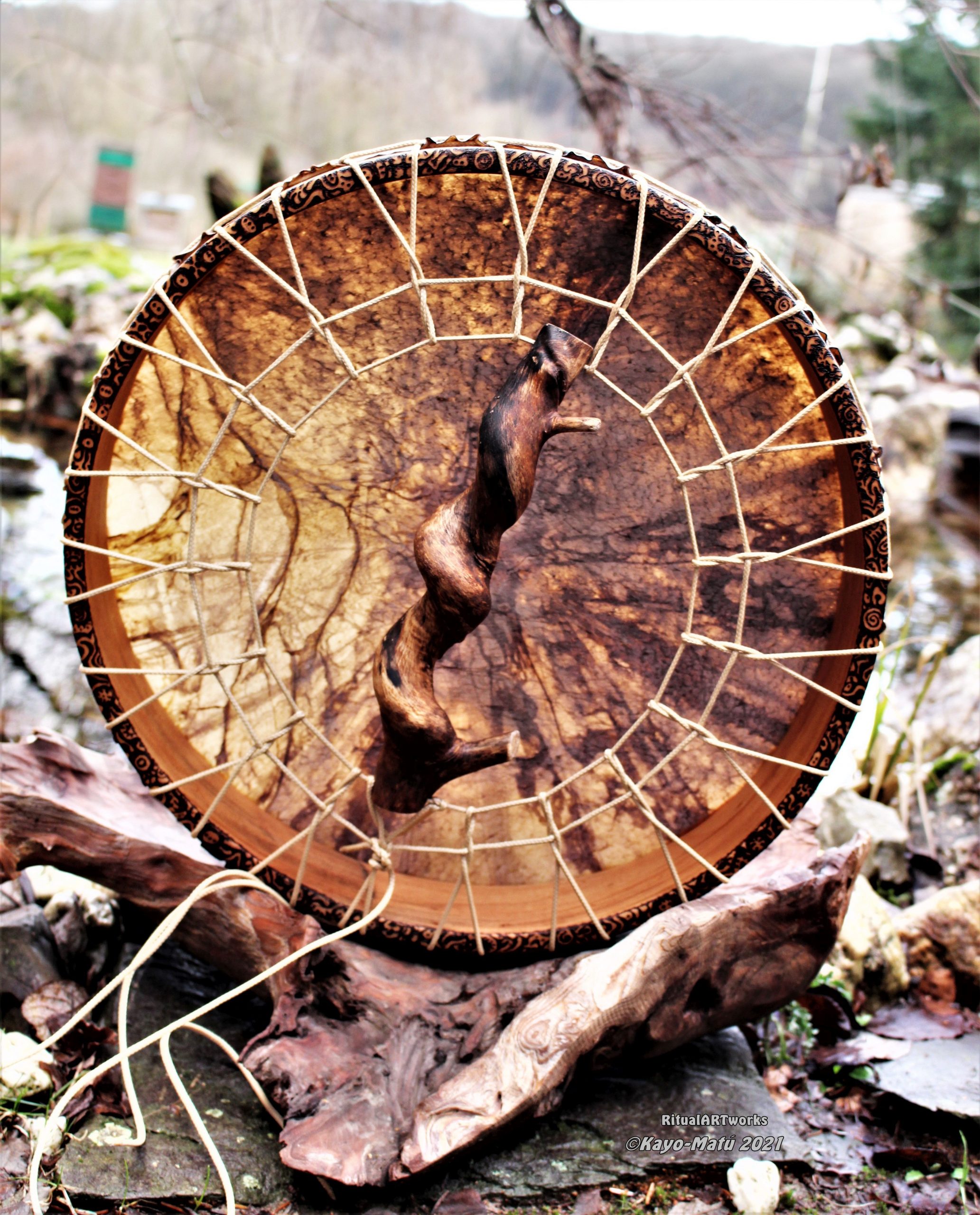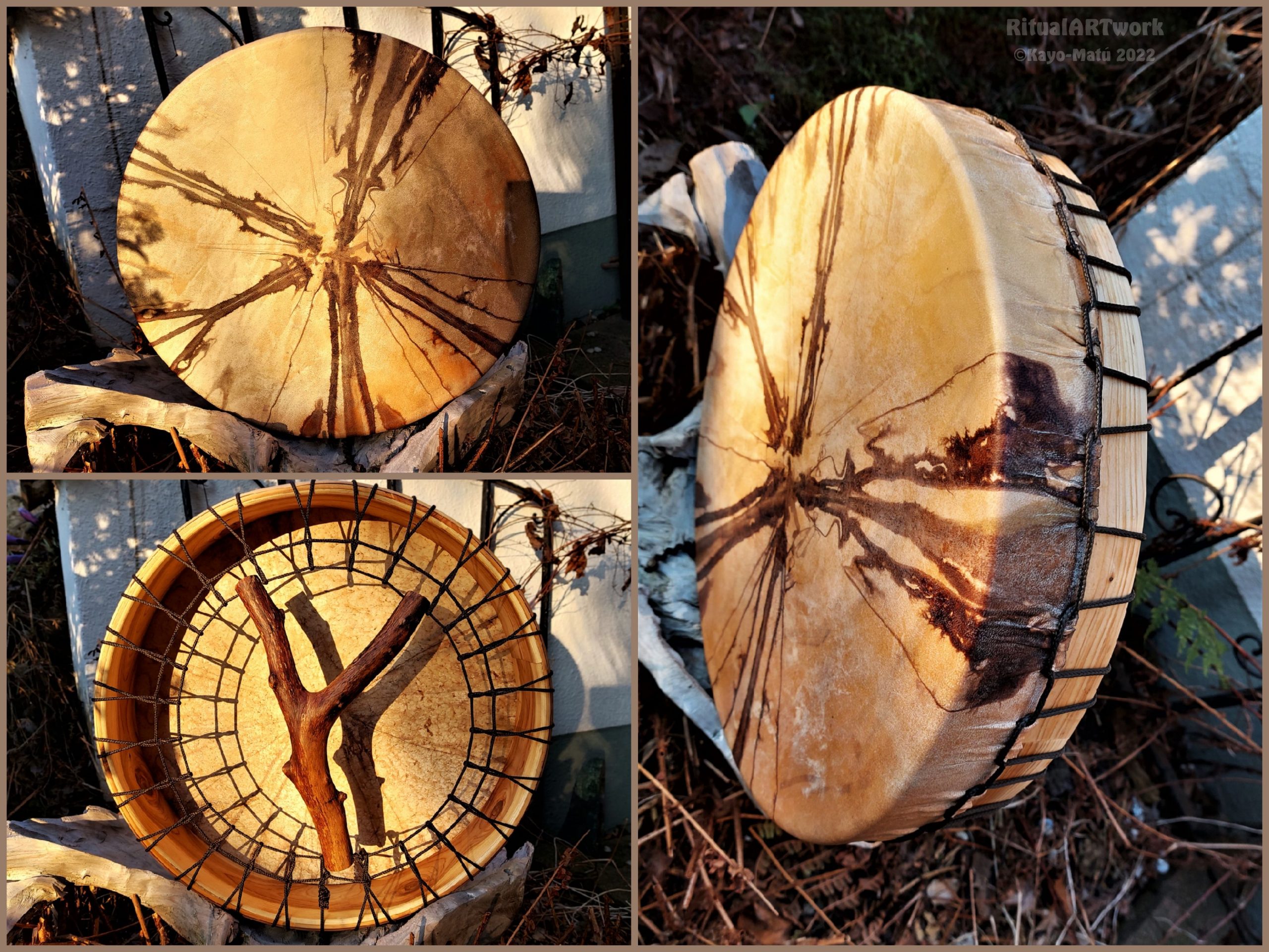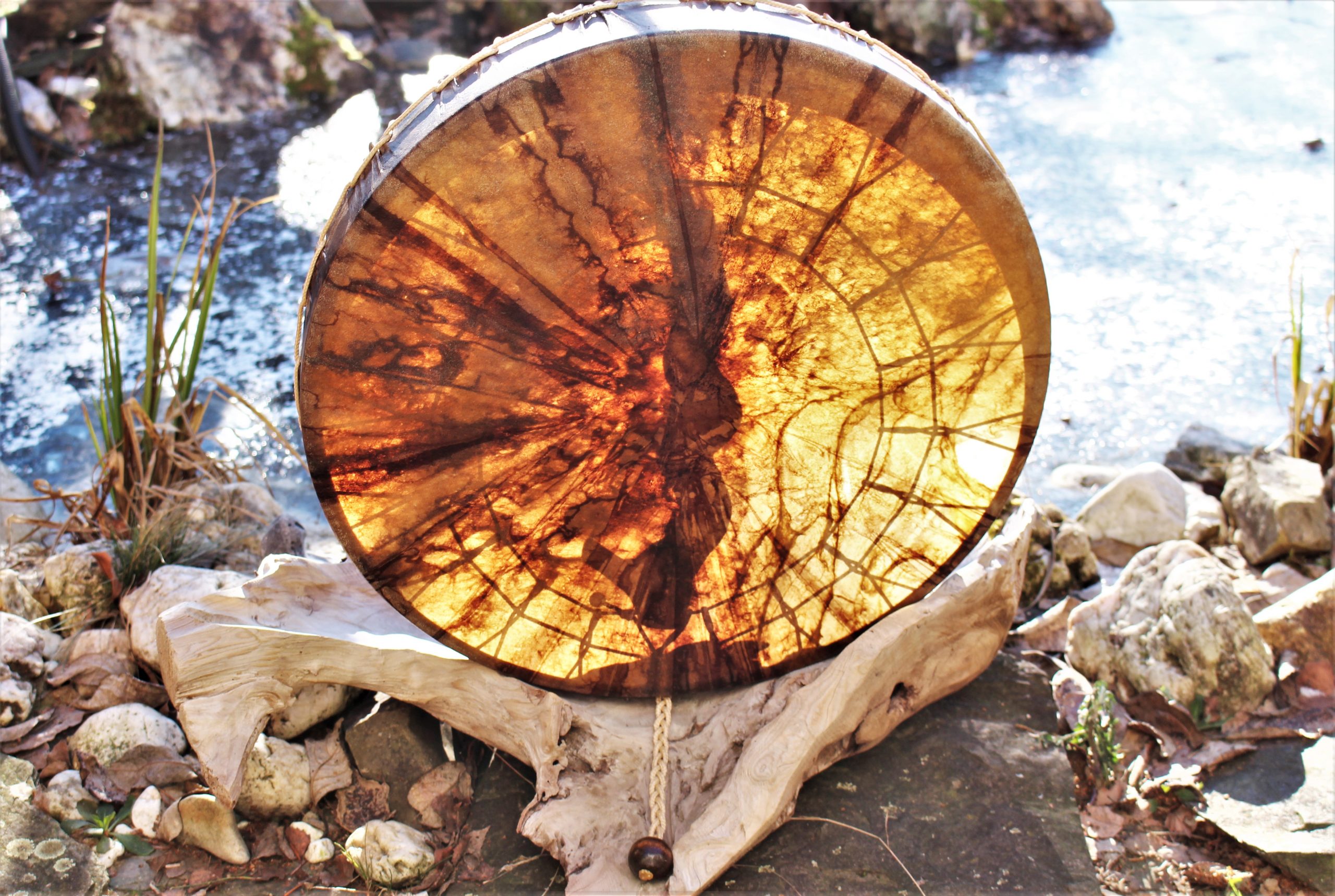 ► Ur-Form Trommeln – Selbst entworfene Trommelrahmen in Form eines natürlichen Baumstammes mit Handschuh als Halterung