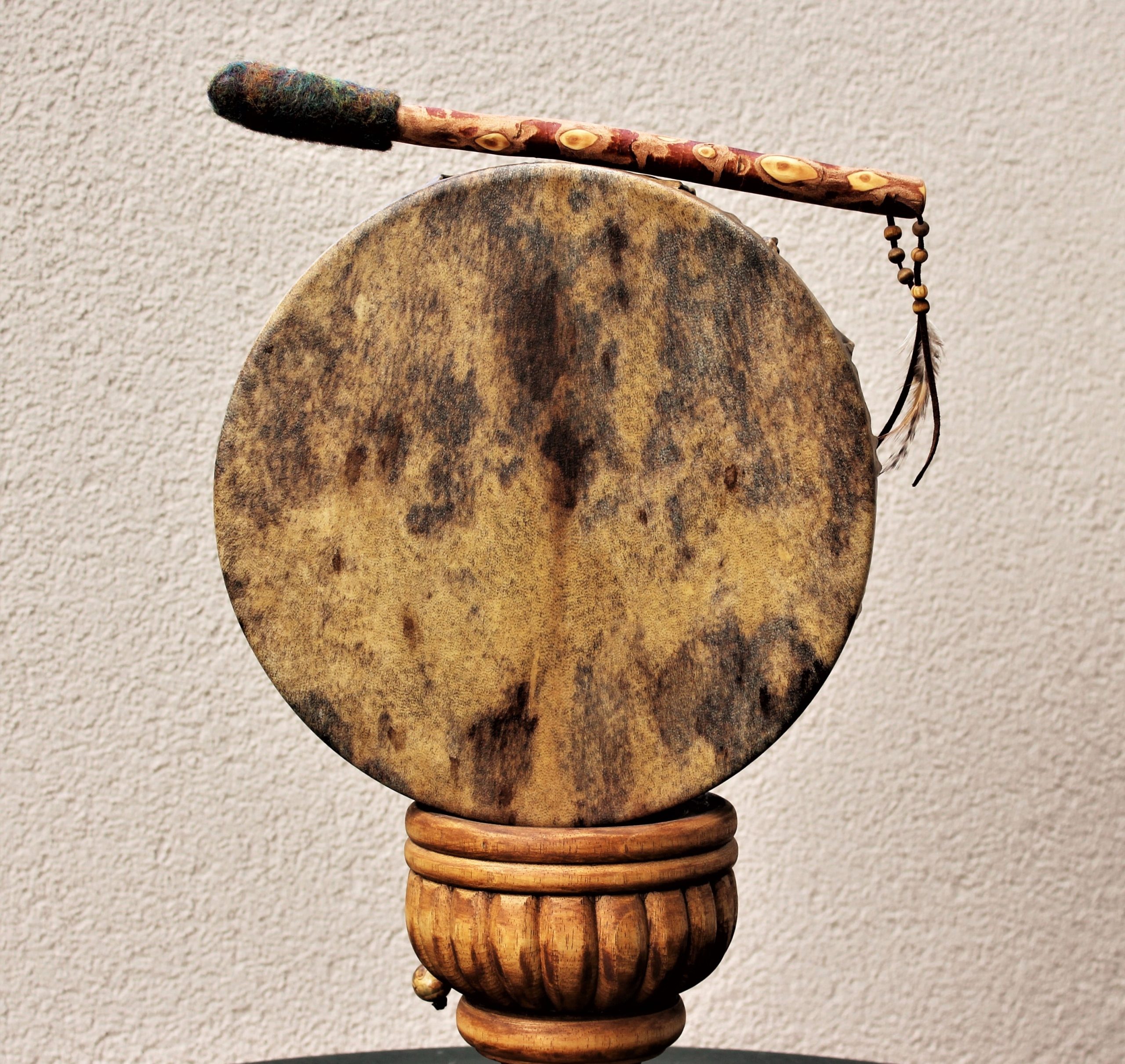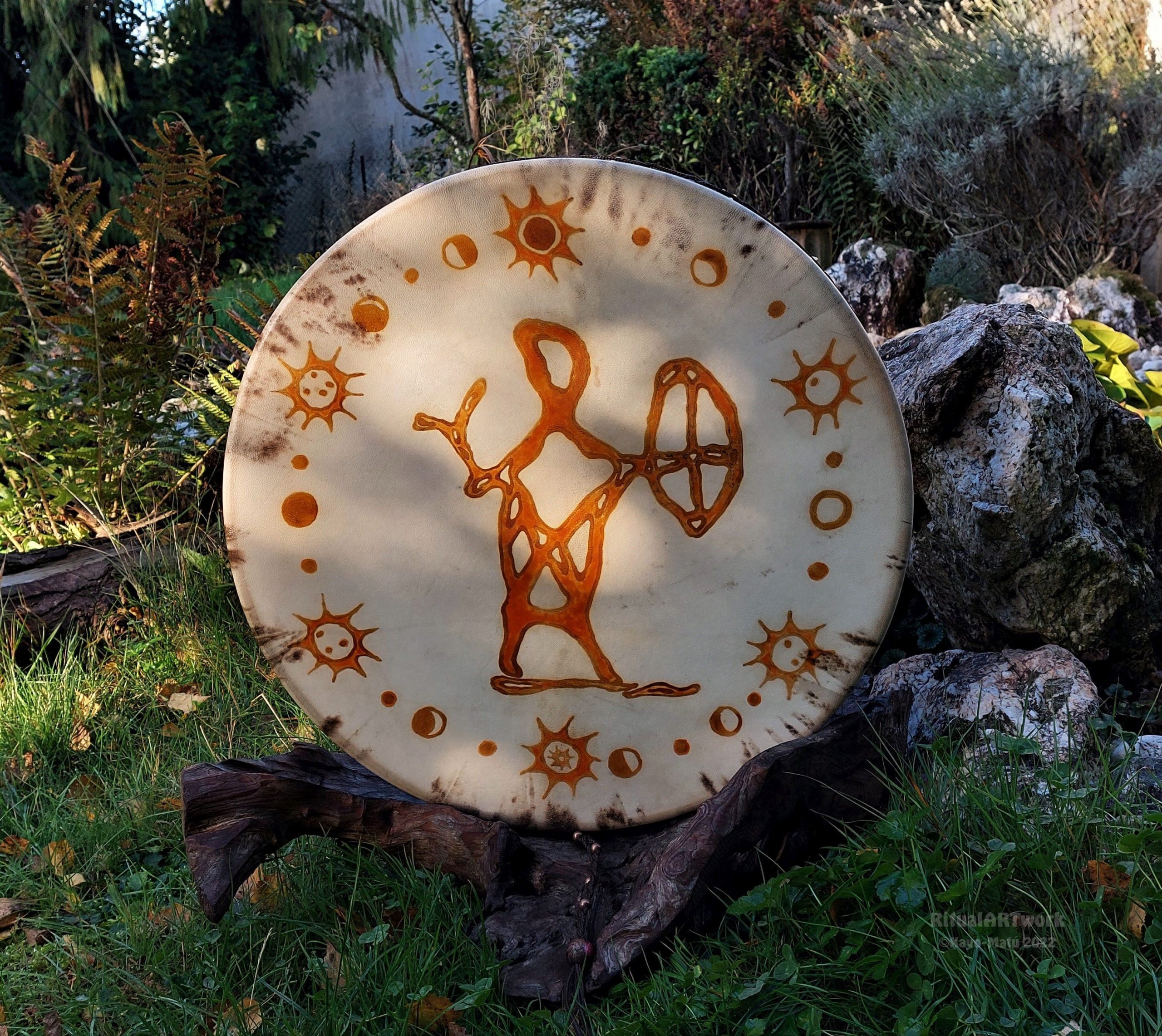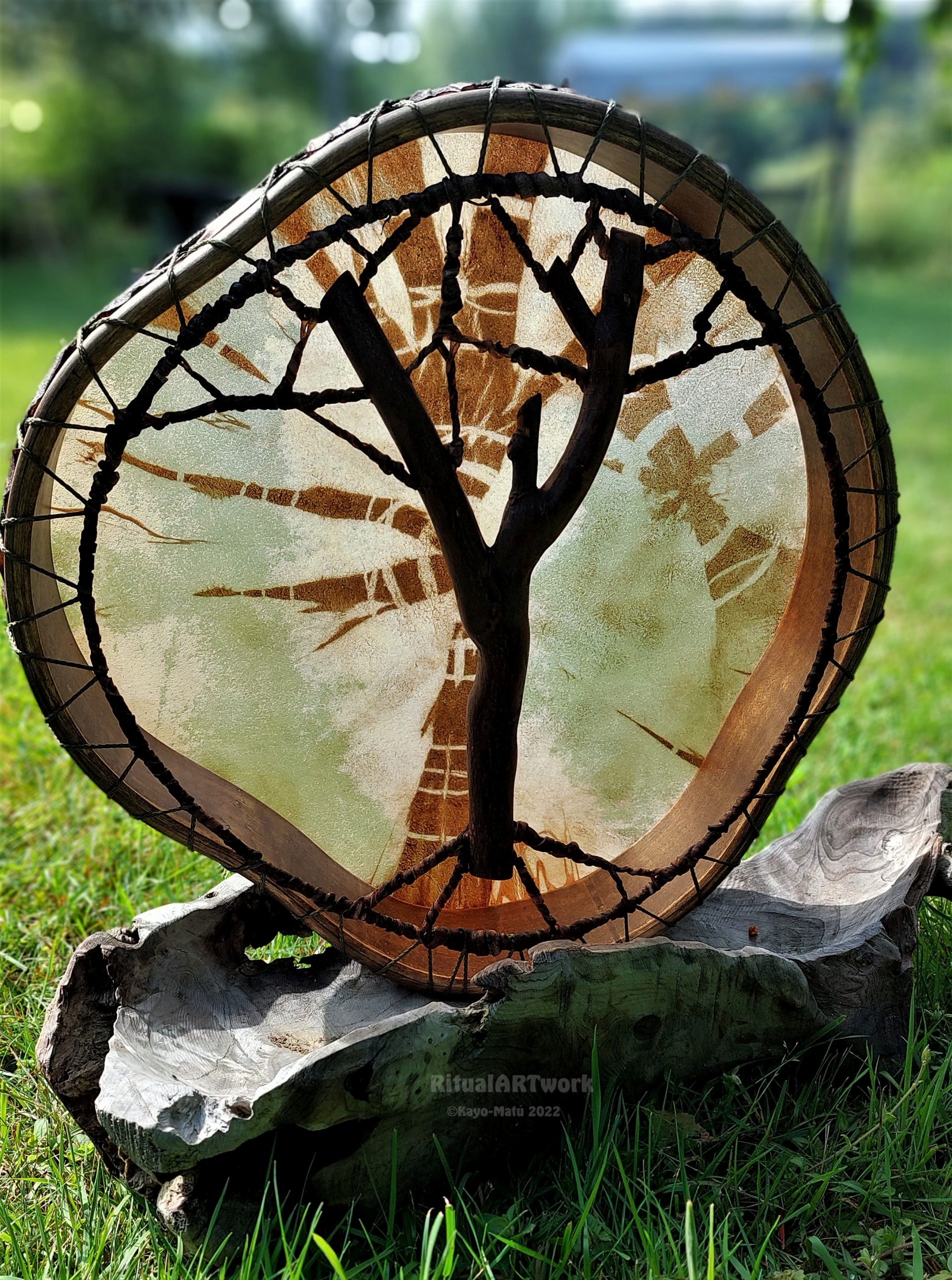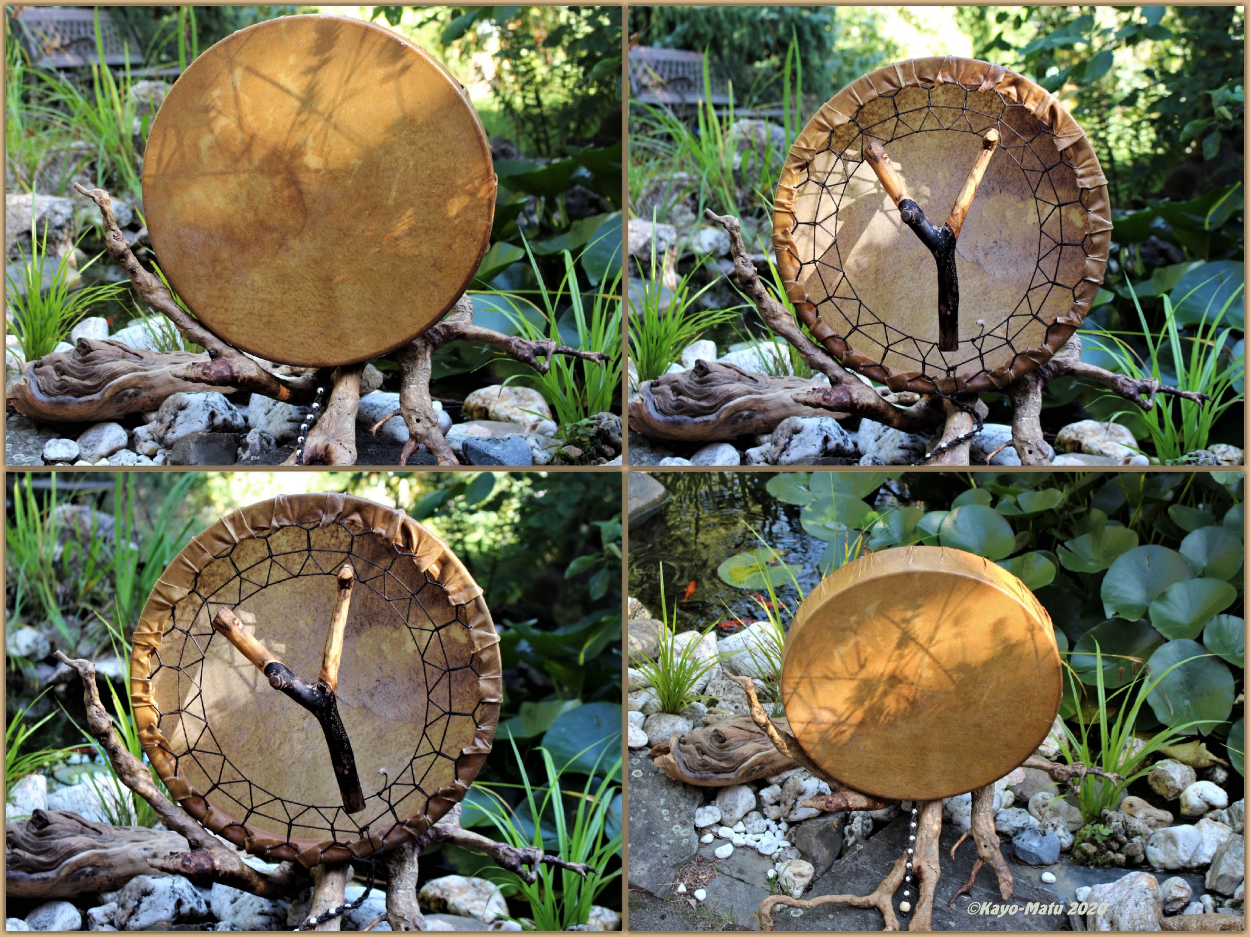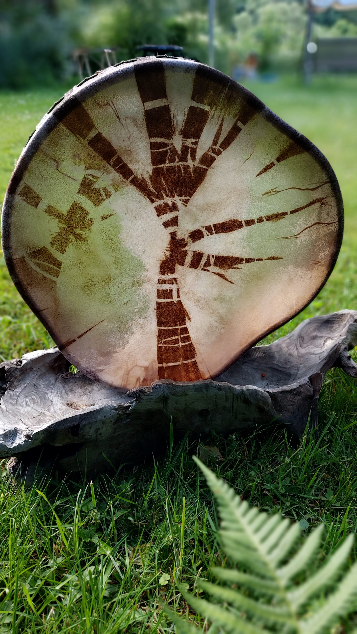 ► Ur-Form Trommeln – Selbst entworfene Trommelrahmen in Form eines natürlichen Baumstammes mit Handschuh als Halterung