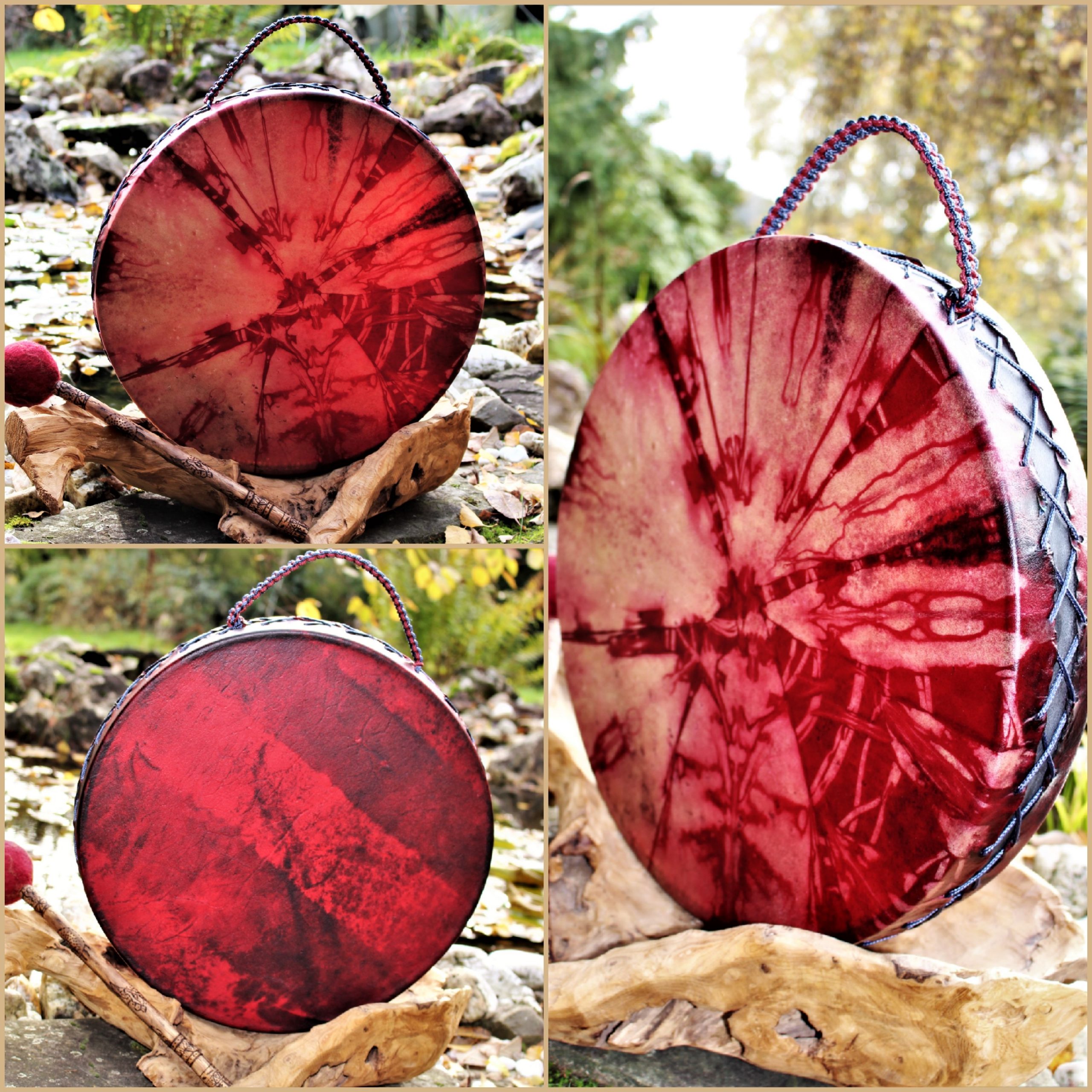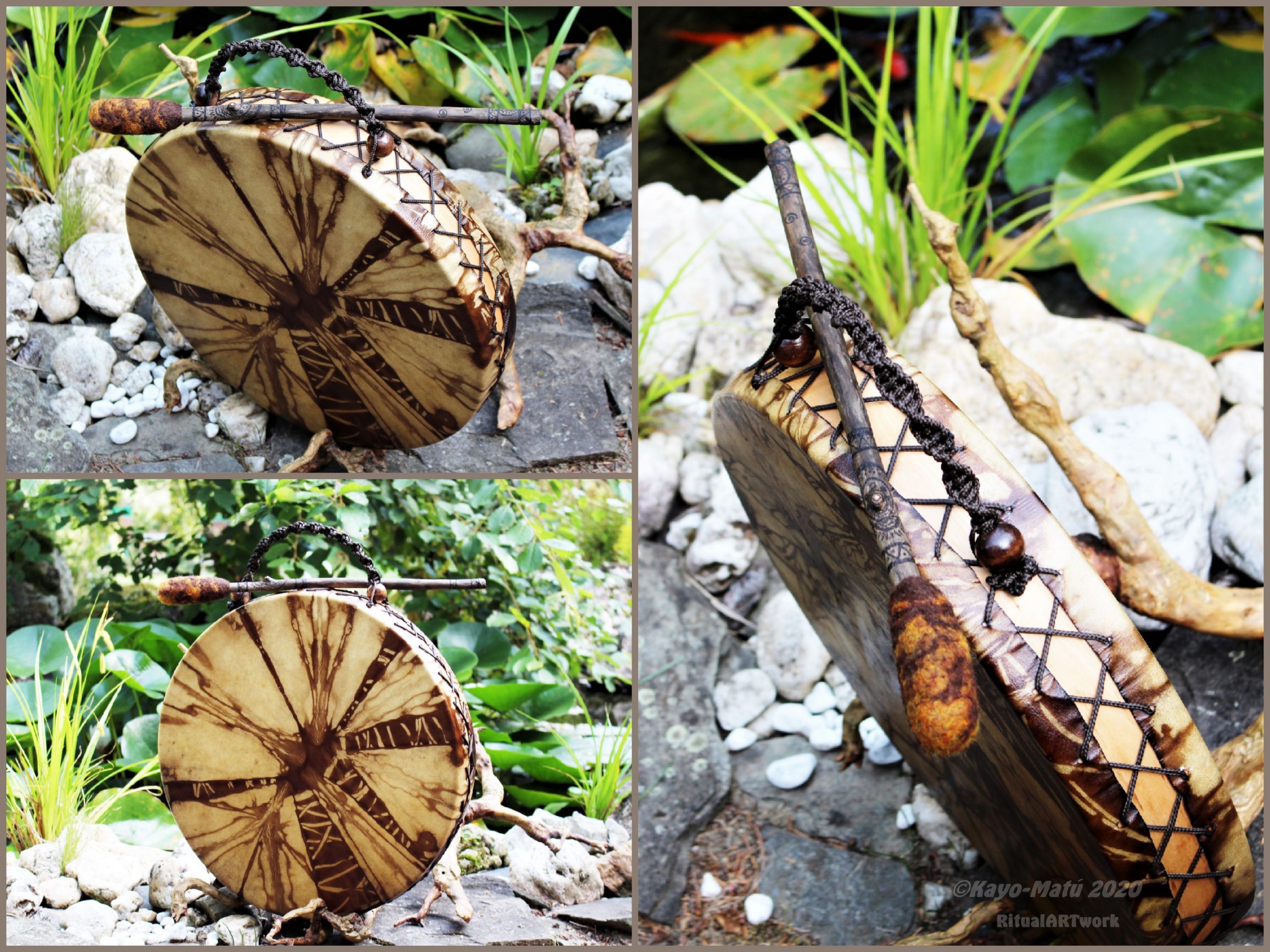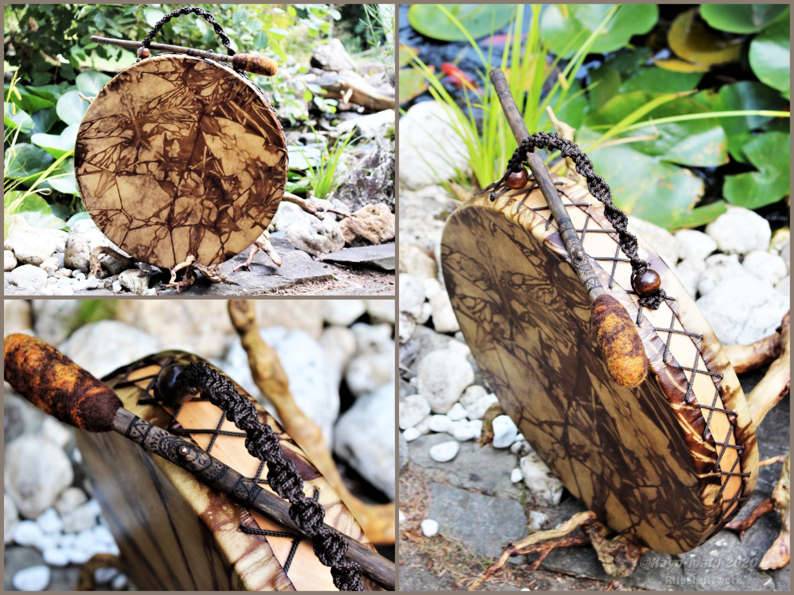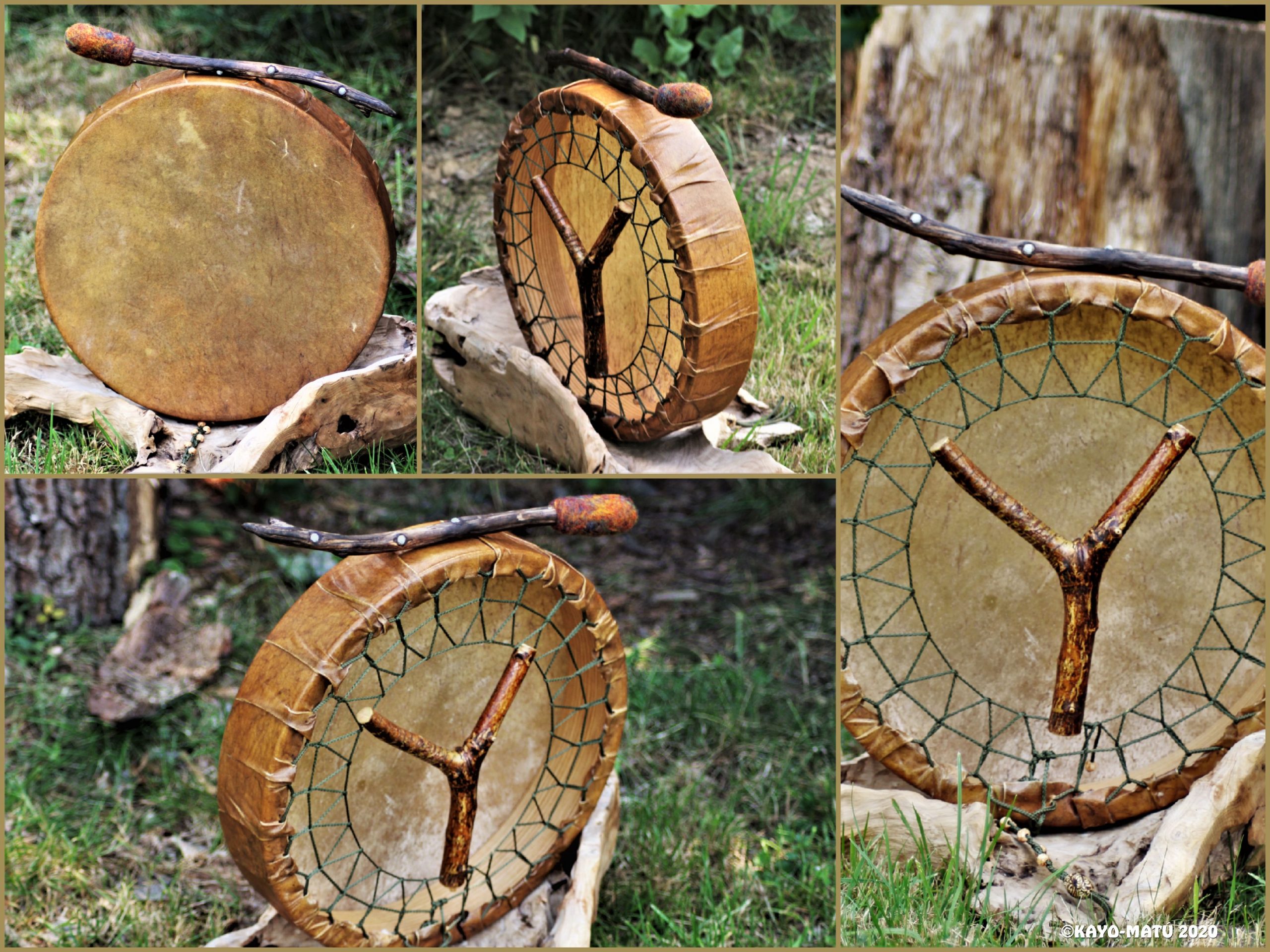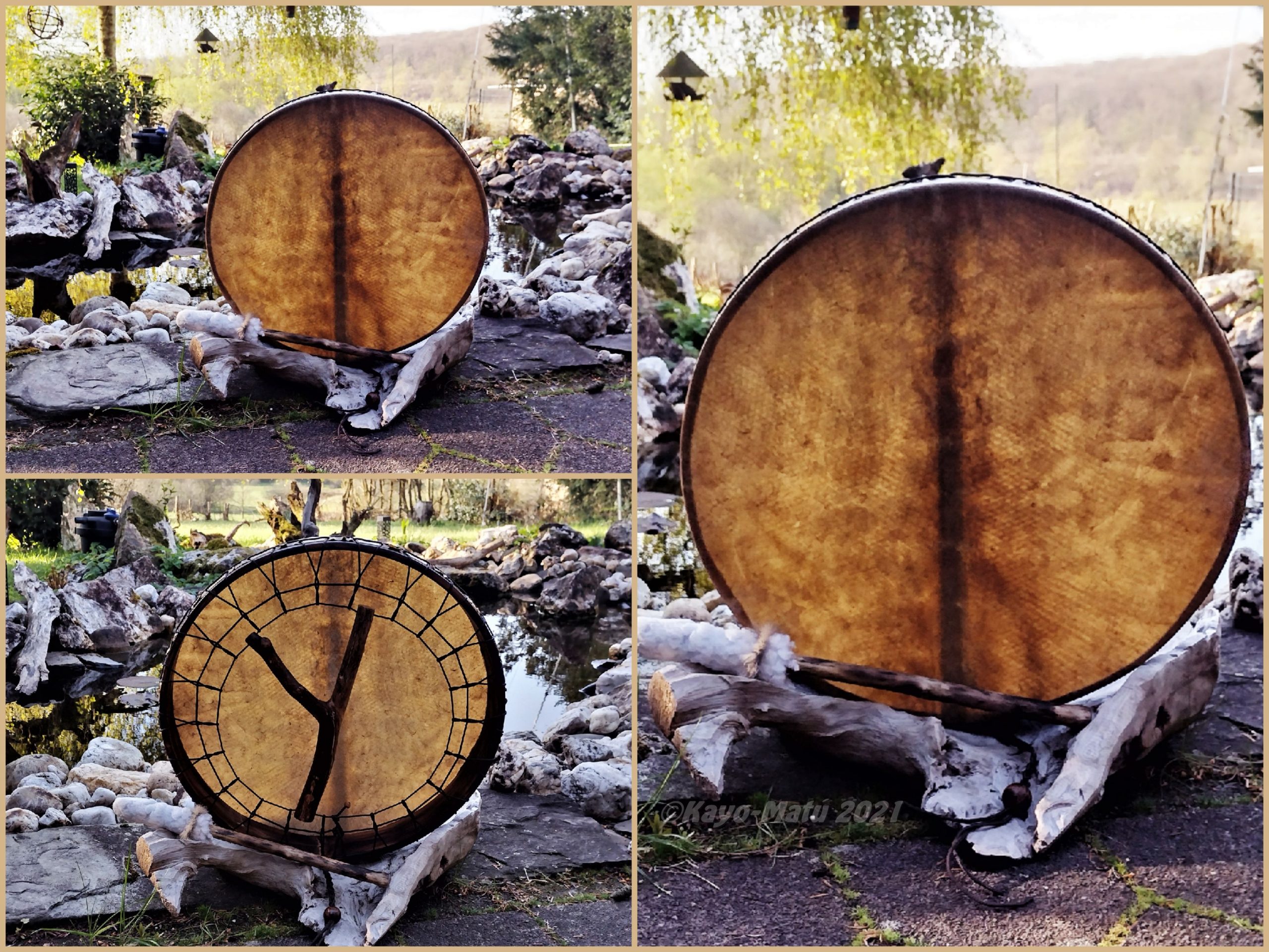 ► Ur-Form Trommeln – Selbst entworfene Trommelrahmen in Form eines natürlichen Baumstammes mit Handschuh als Halterung