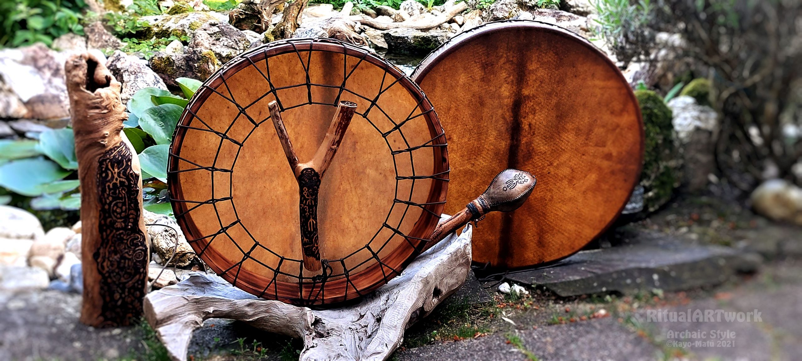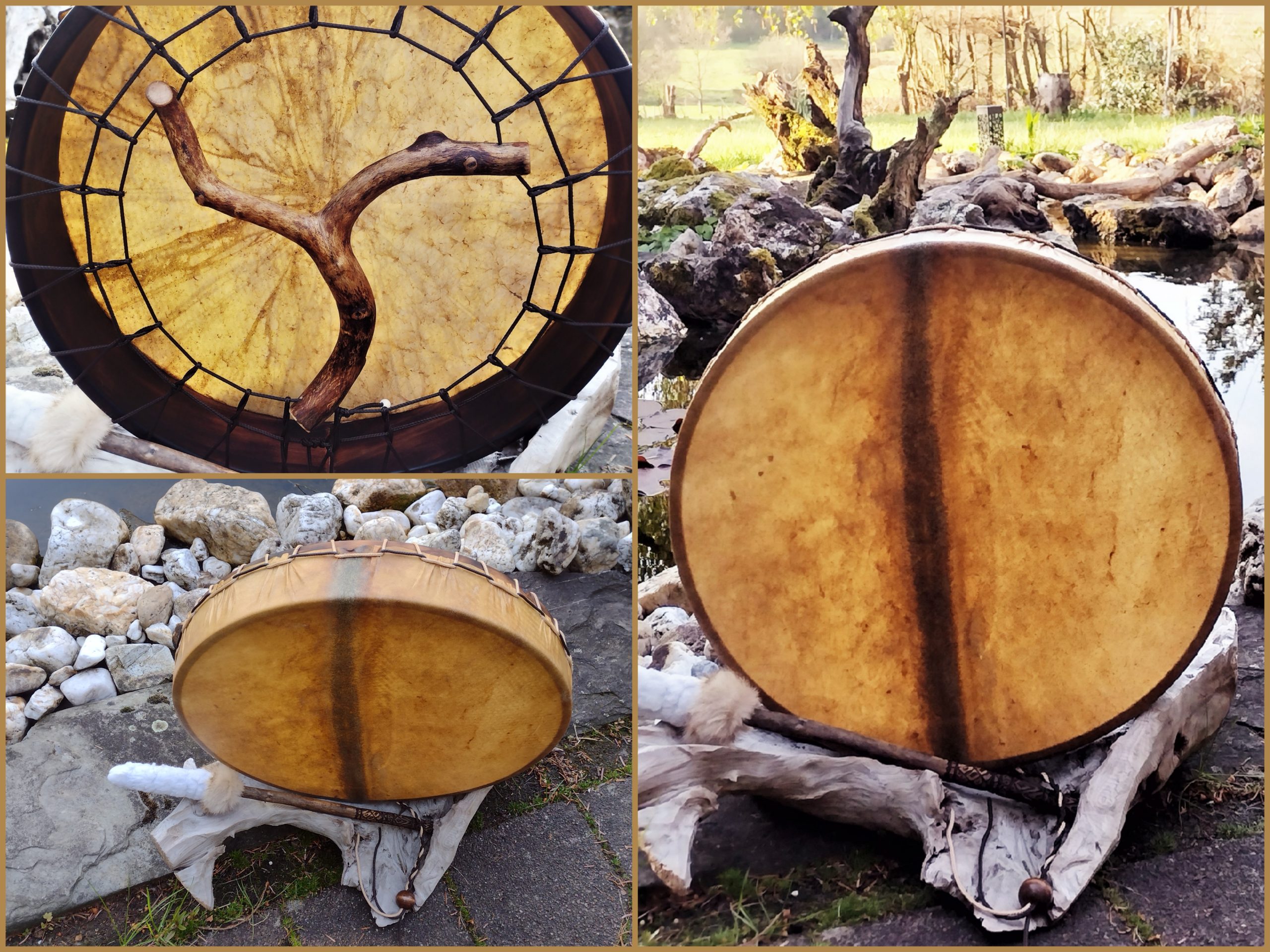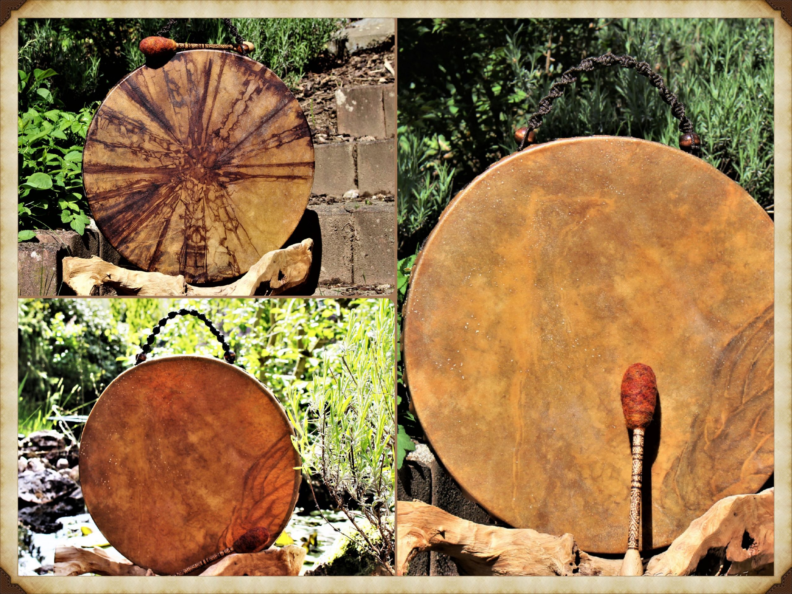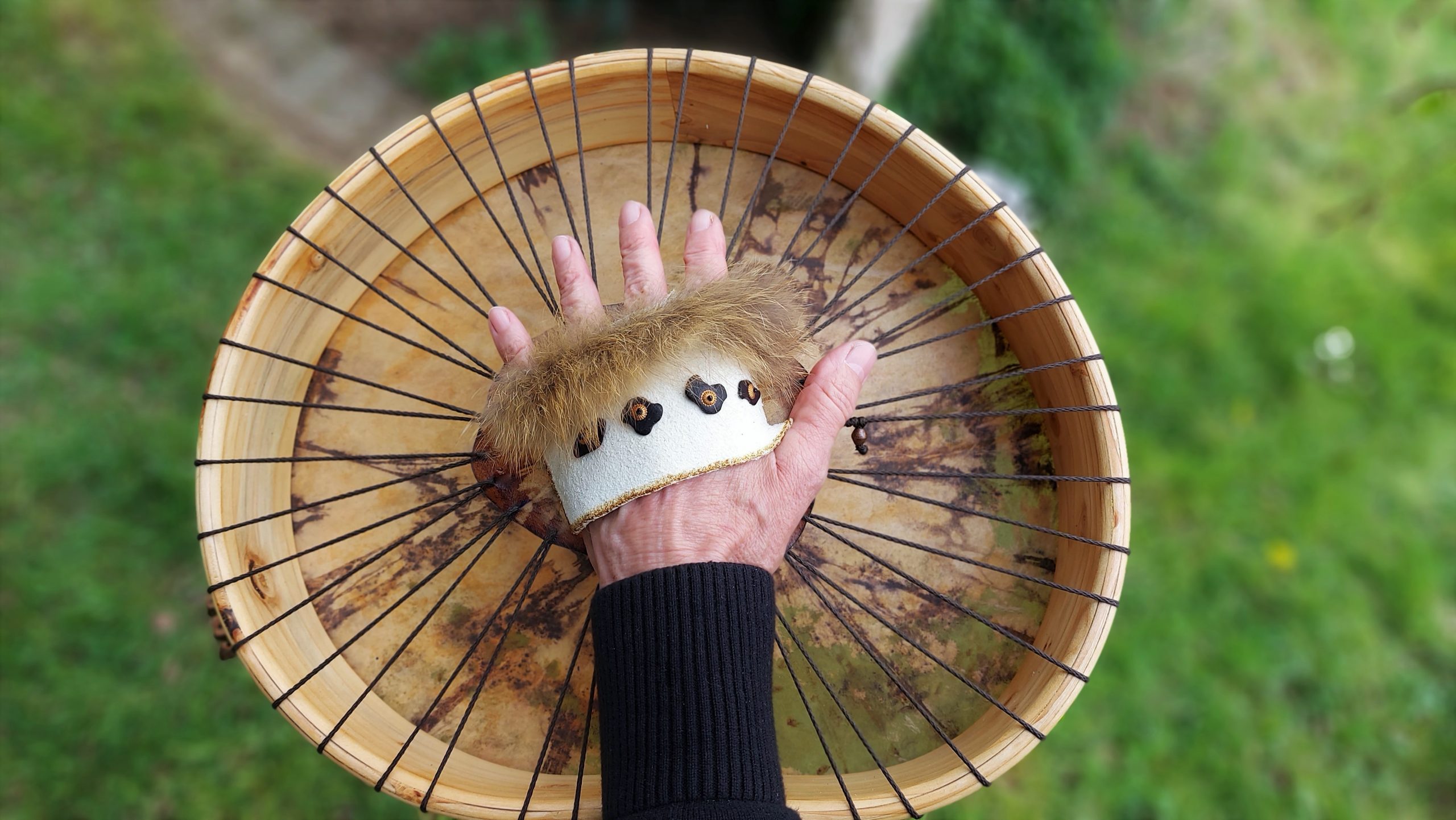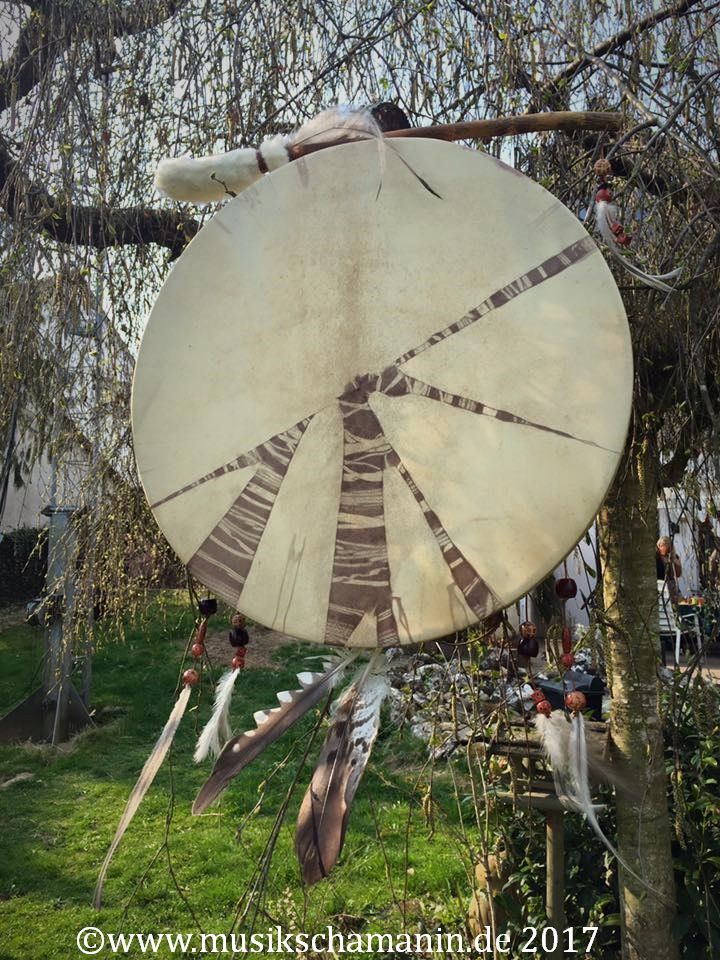 ► Ur-Form Trommeln – Selbst entworfene Trommelrahmen in Form eines natürlichen Baumstammes mit Handschuh als Halterung