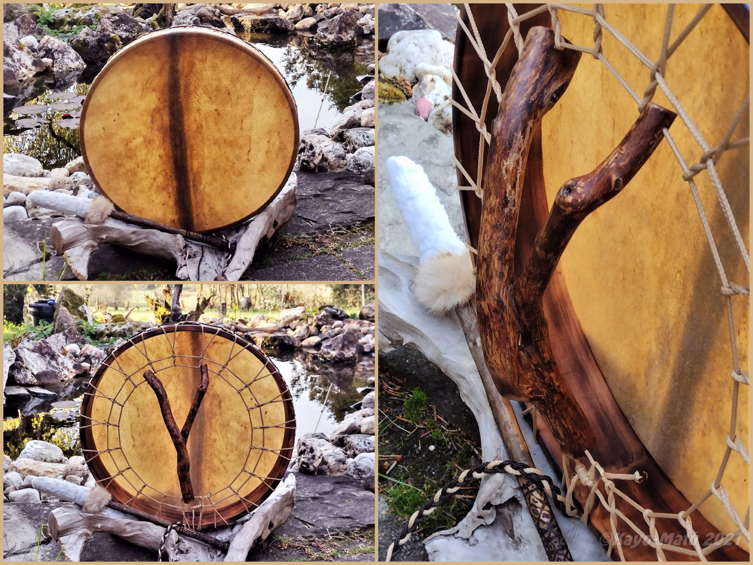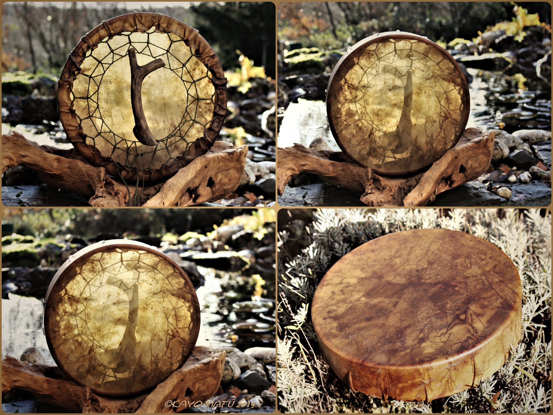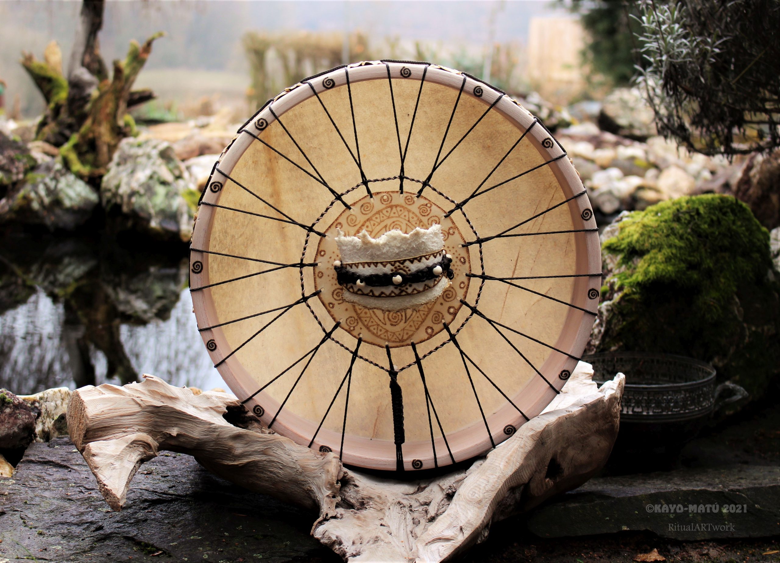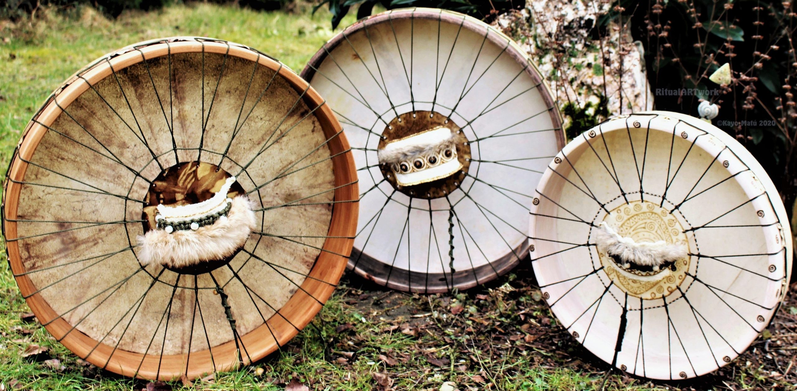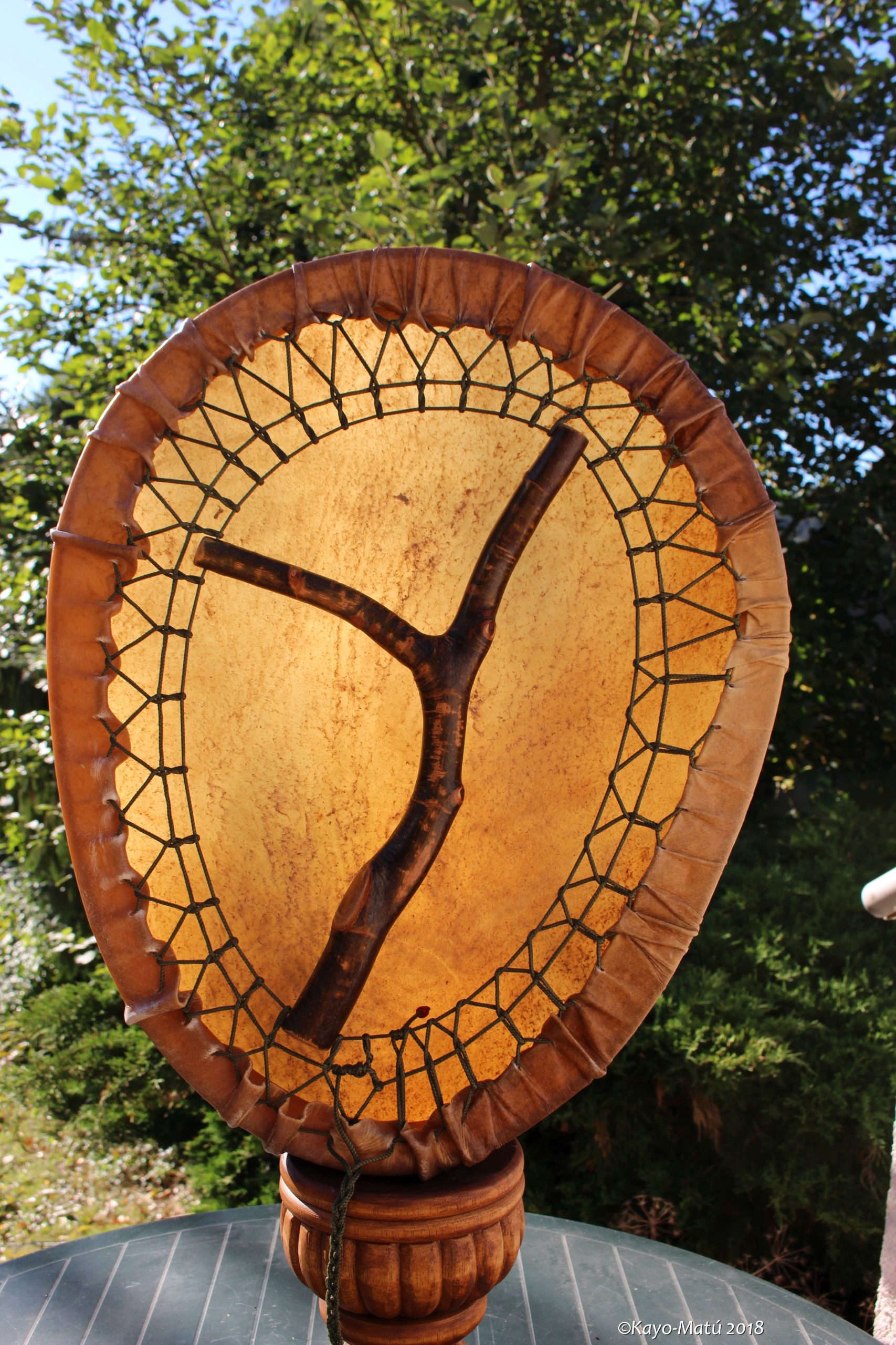 ► Ur-Form Trommeln – Selbst entworfene Trommelrahmen in Form eines natürlichen Baumstammes mit Handschuh als Halterung