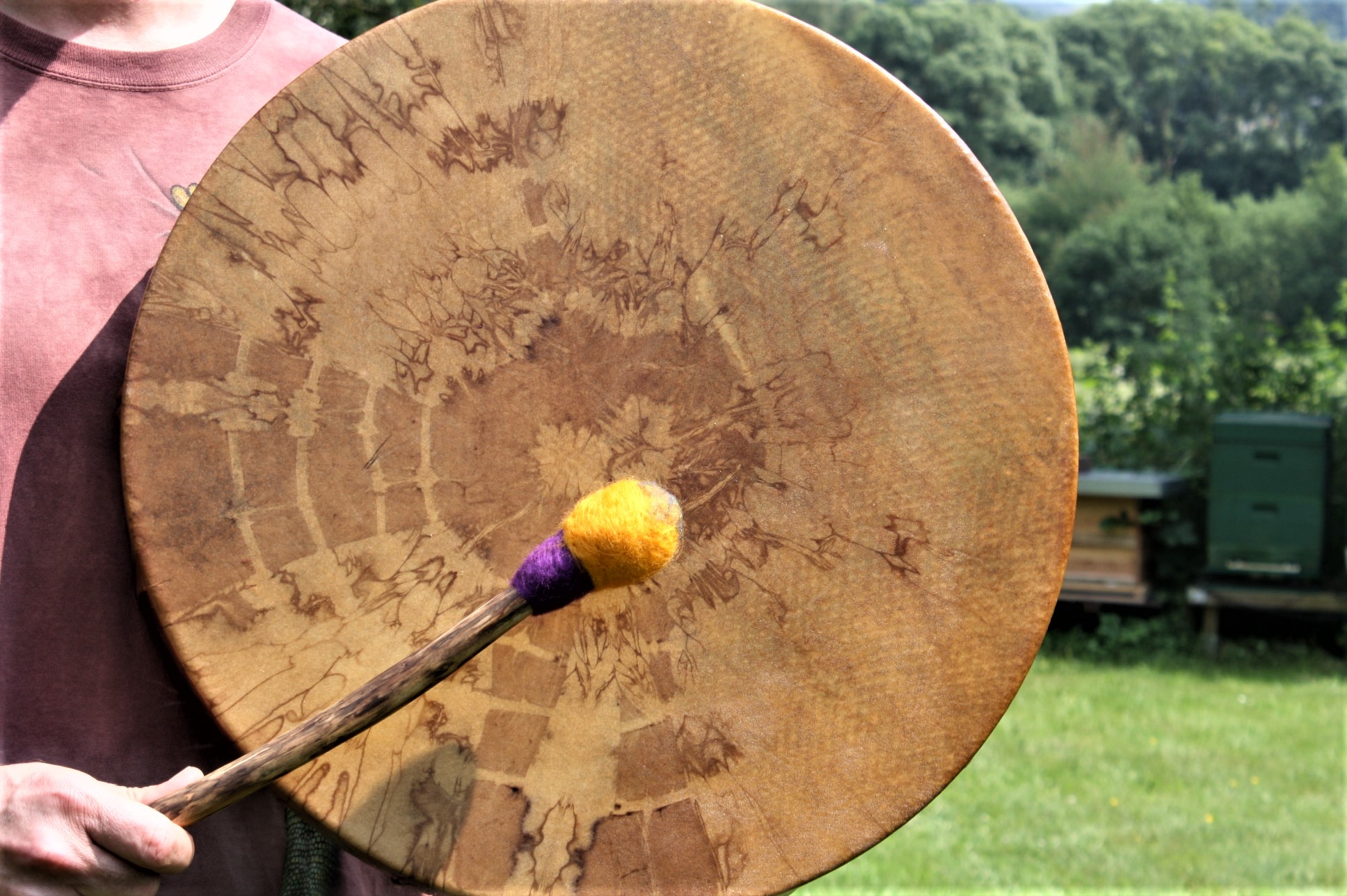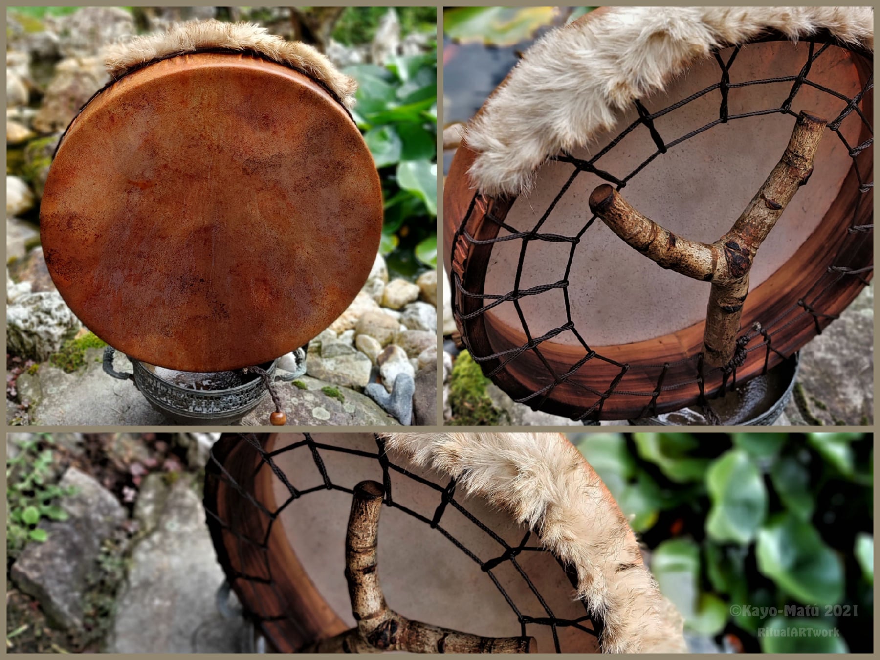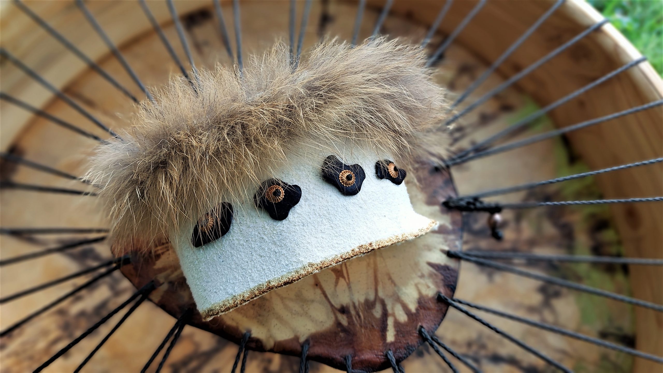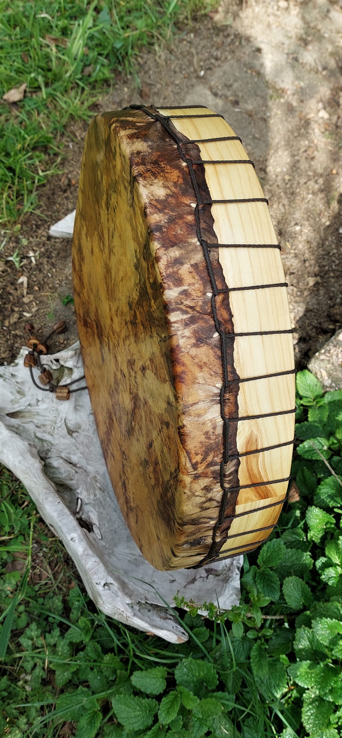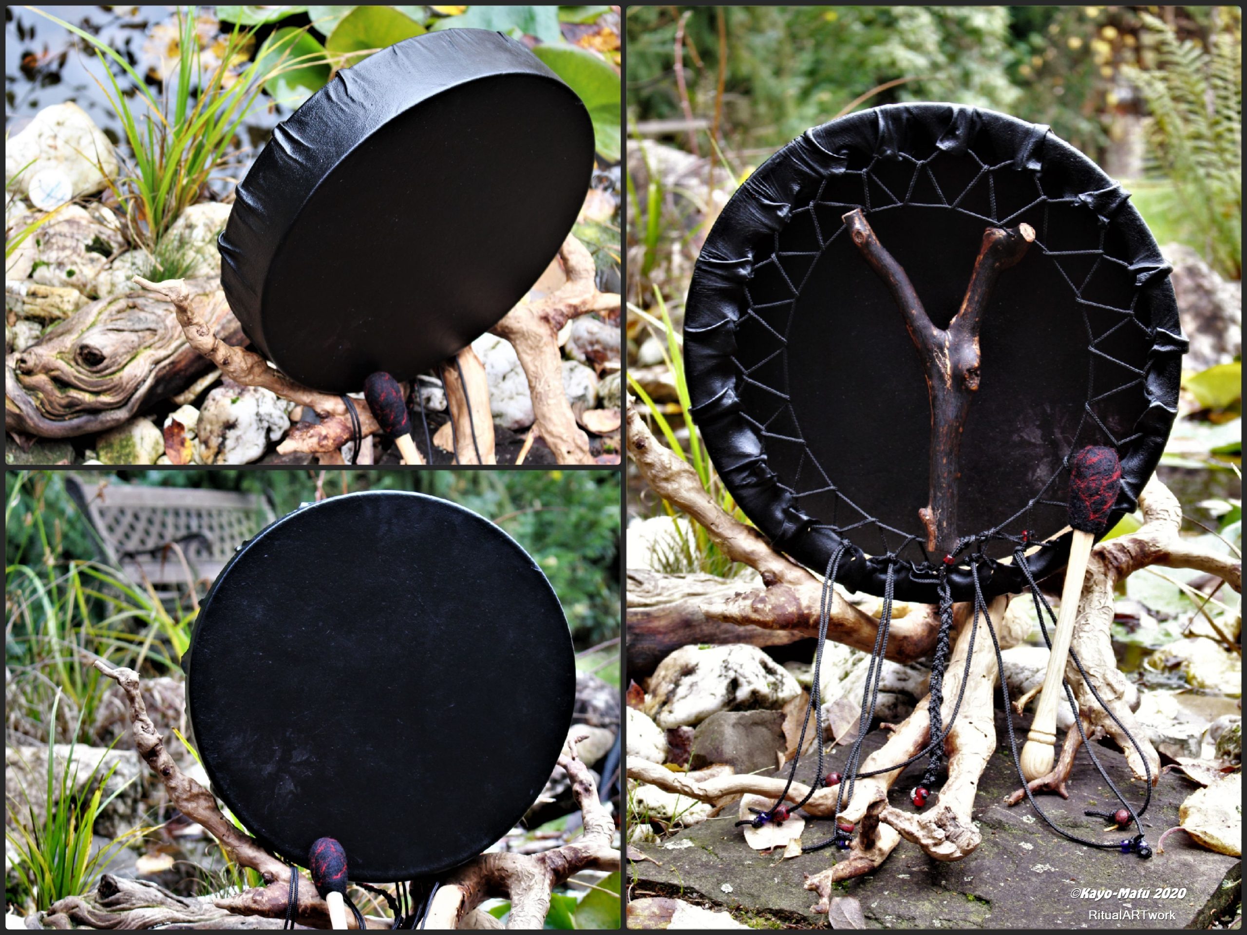 ► Ur-Form Trommeln – Selbst entworfene Trommelrahmen in Form eines natürlichen Baumstammes mit Handschuh als Halterung