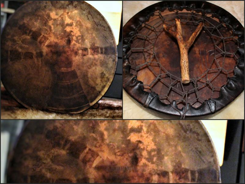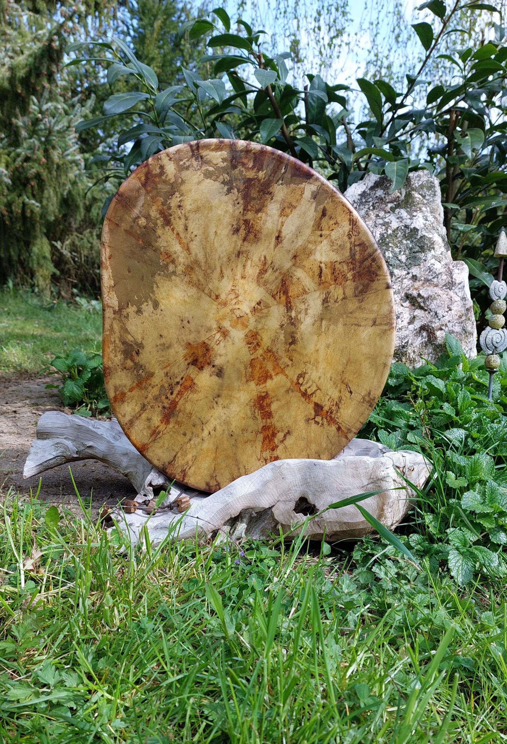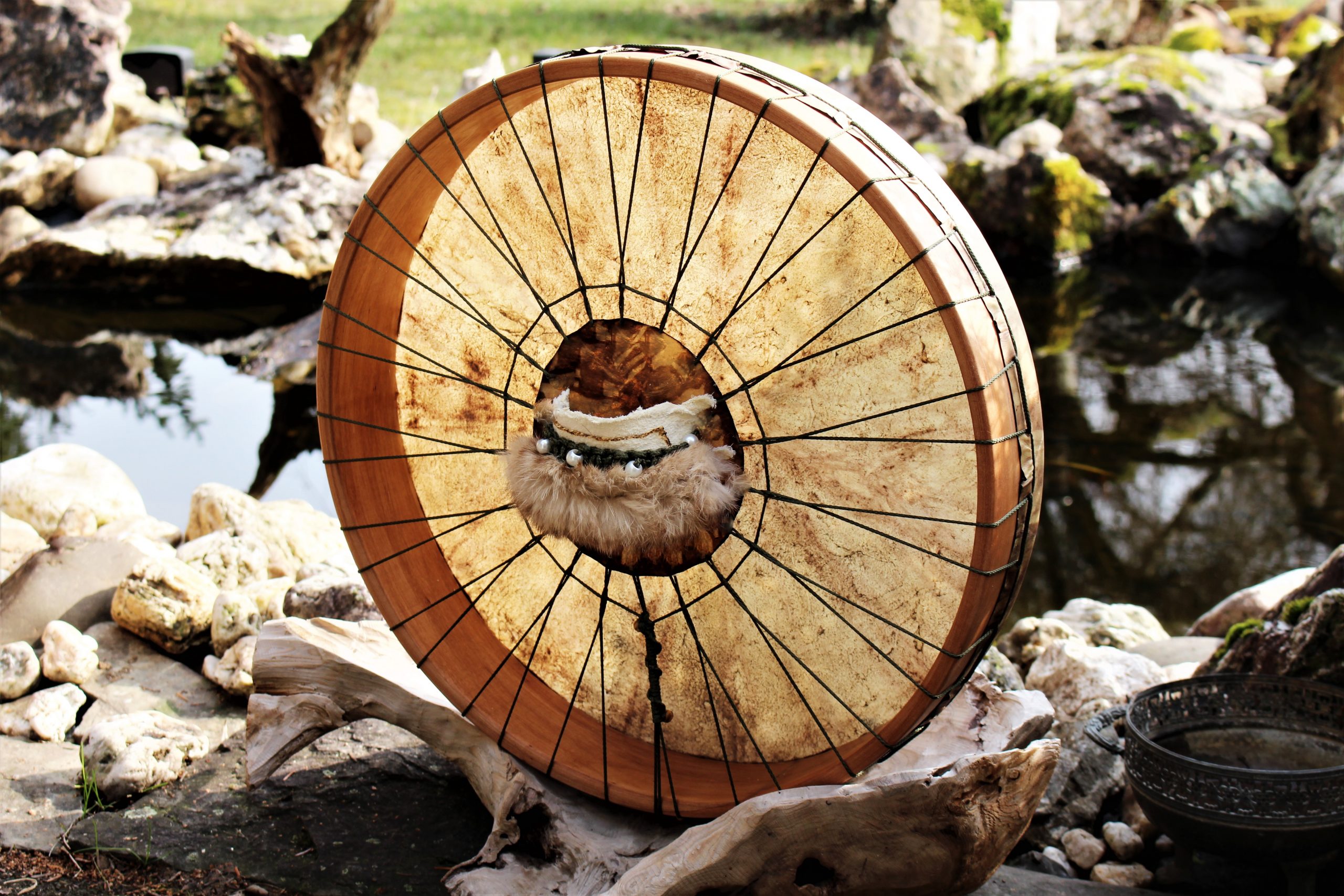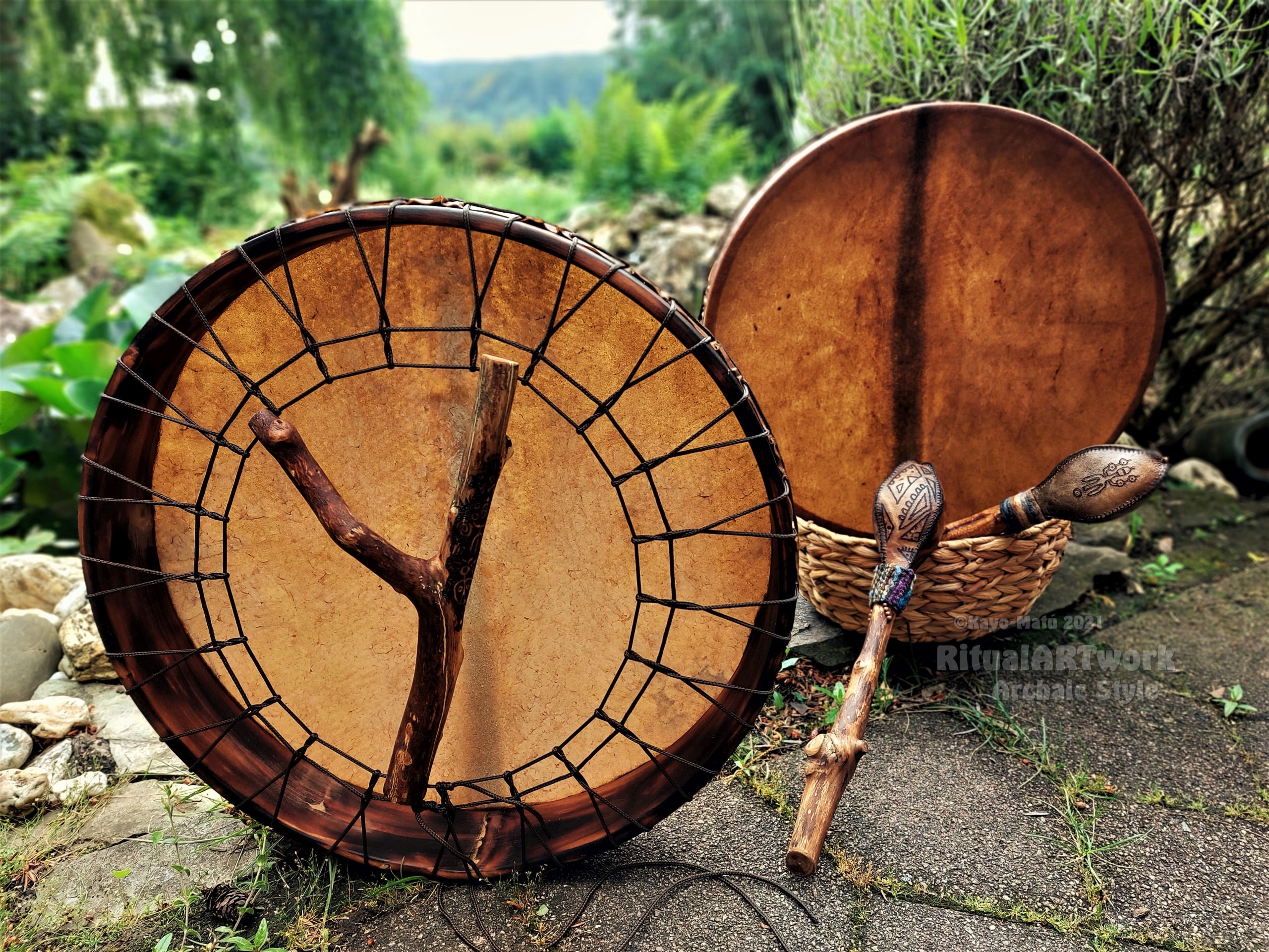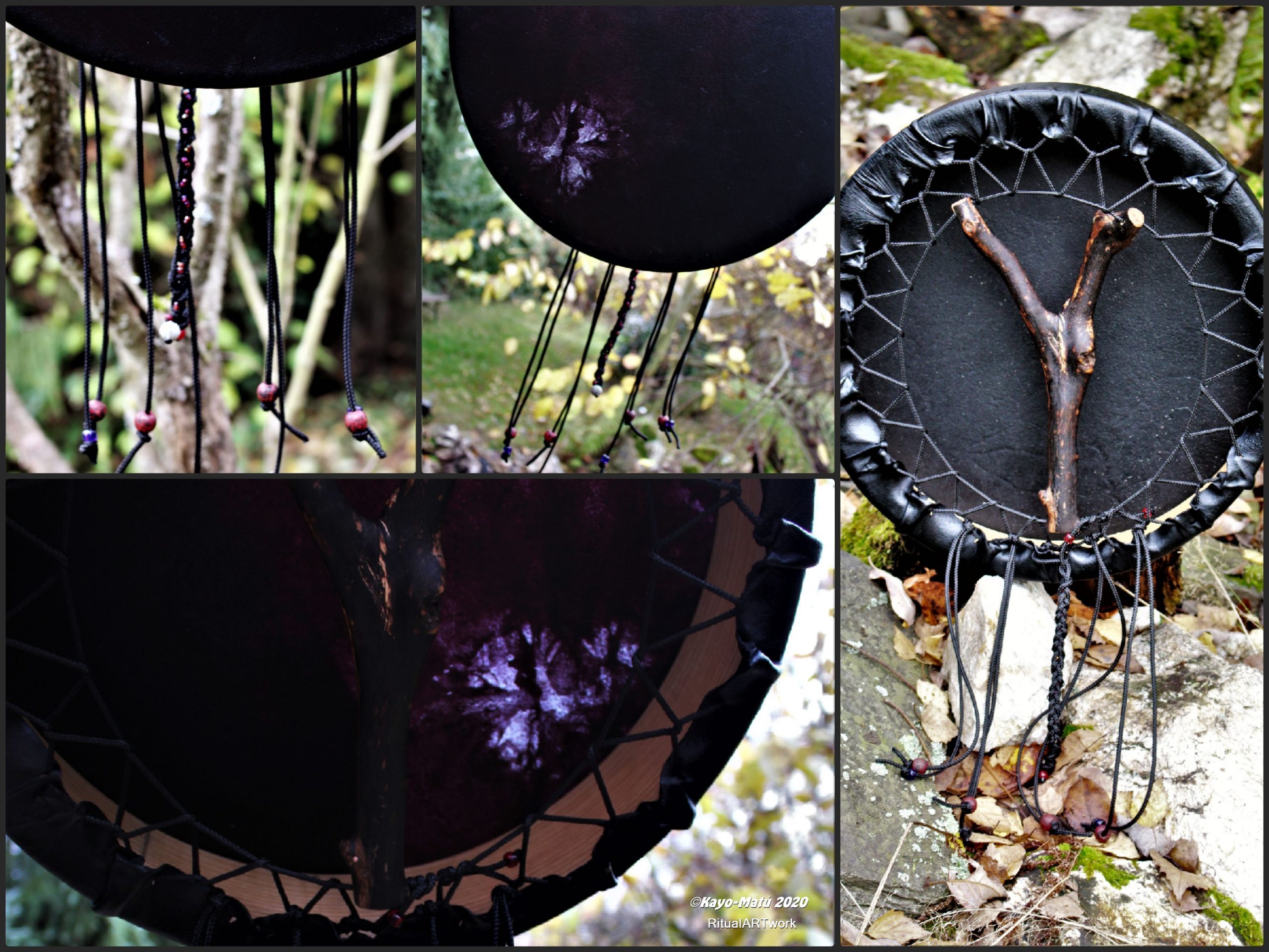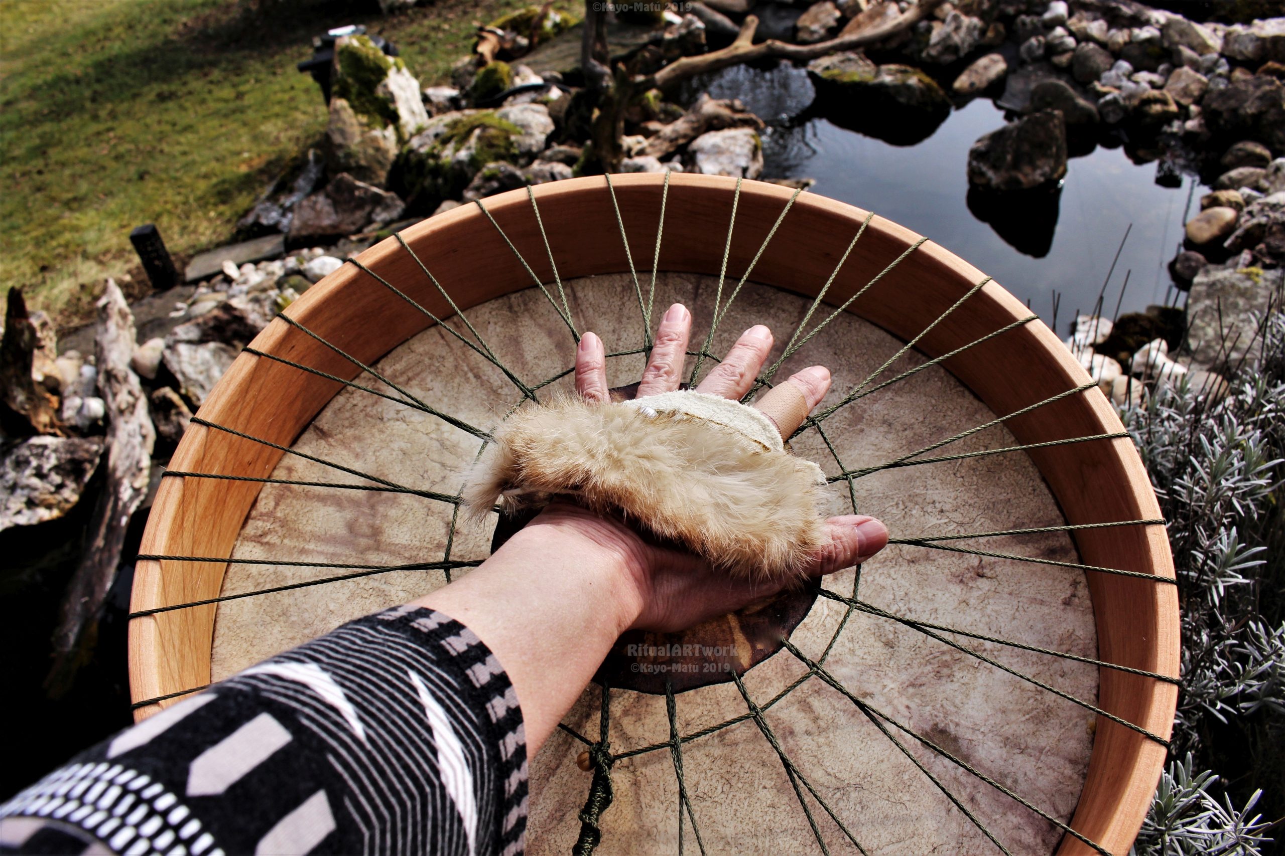 ► Ur-Form Trommeln – Selbst entworfene Trommelrahmen in Form eines natürlichen Baumstammes mit Handschuh als Halterung