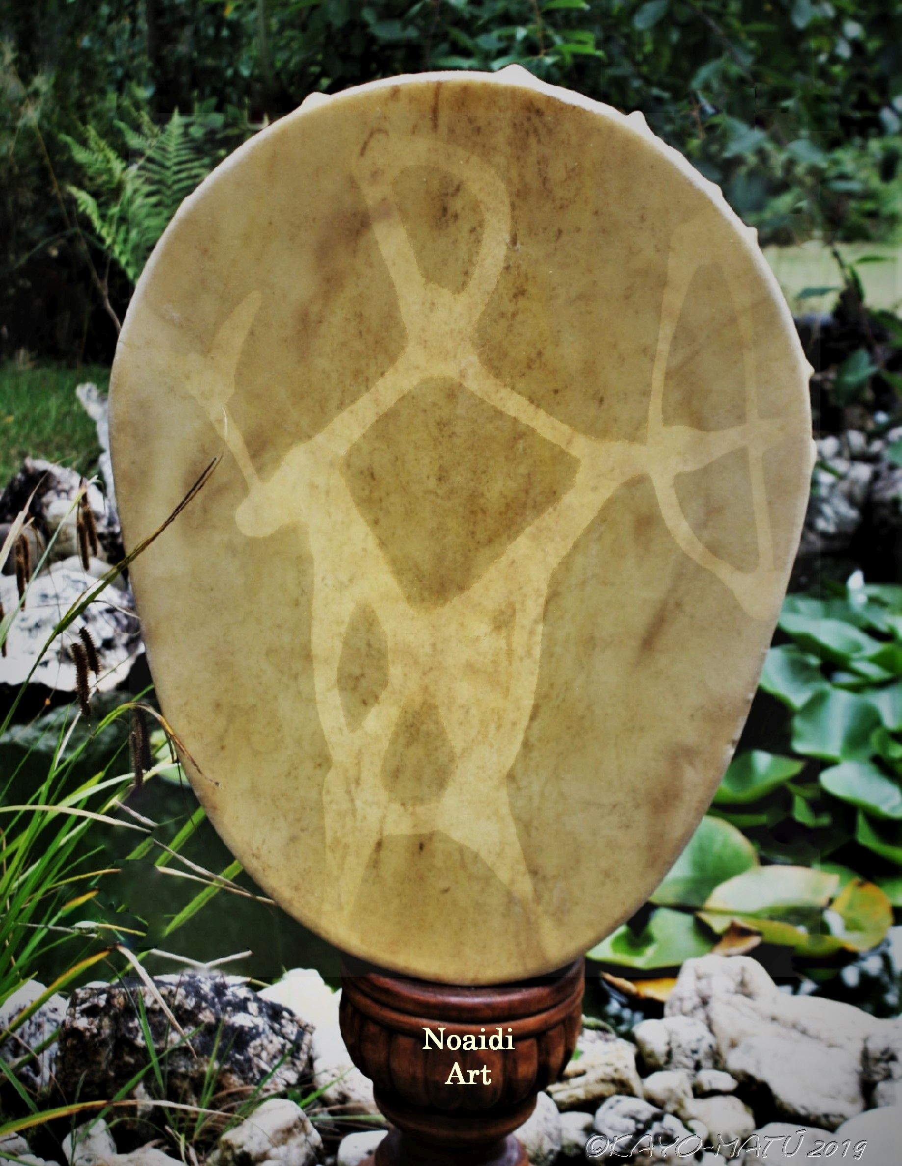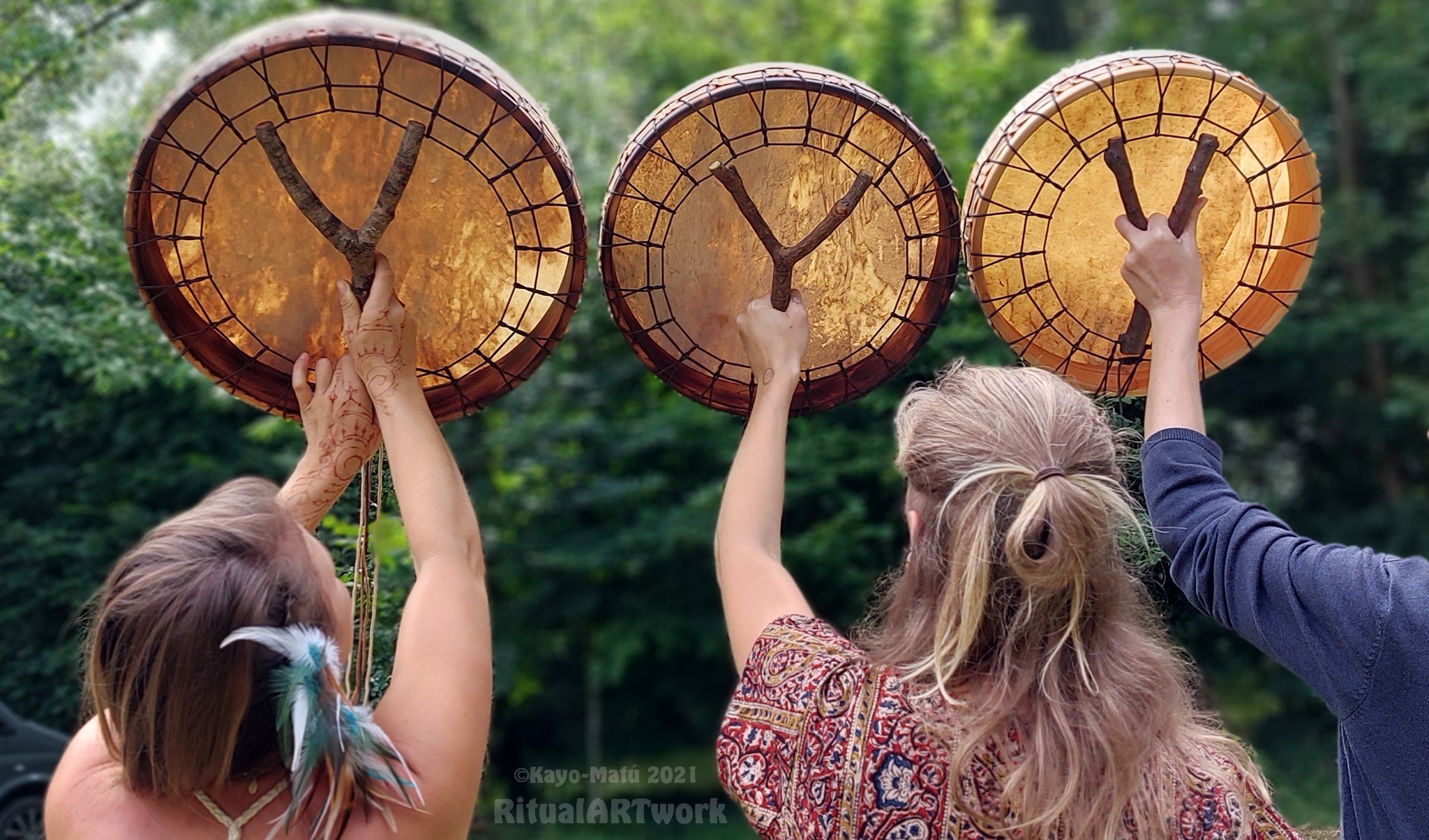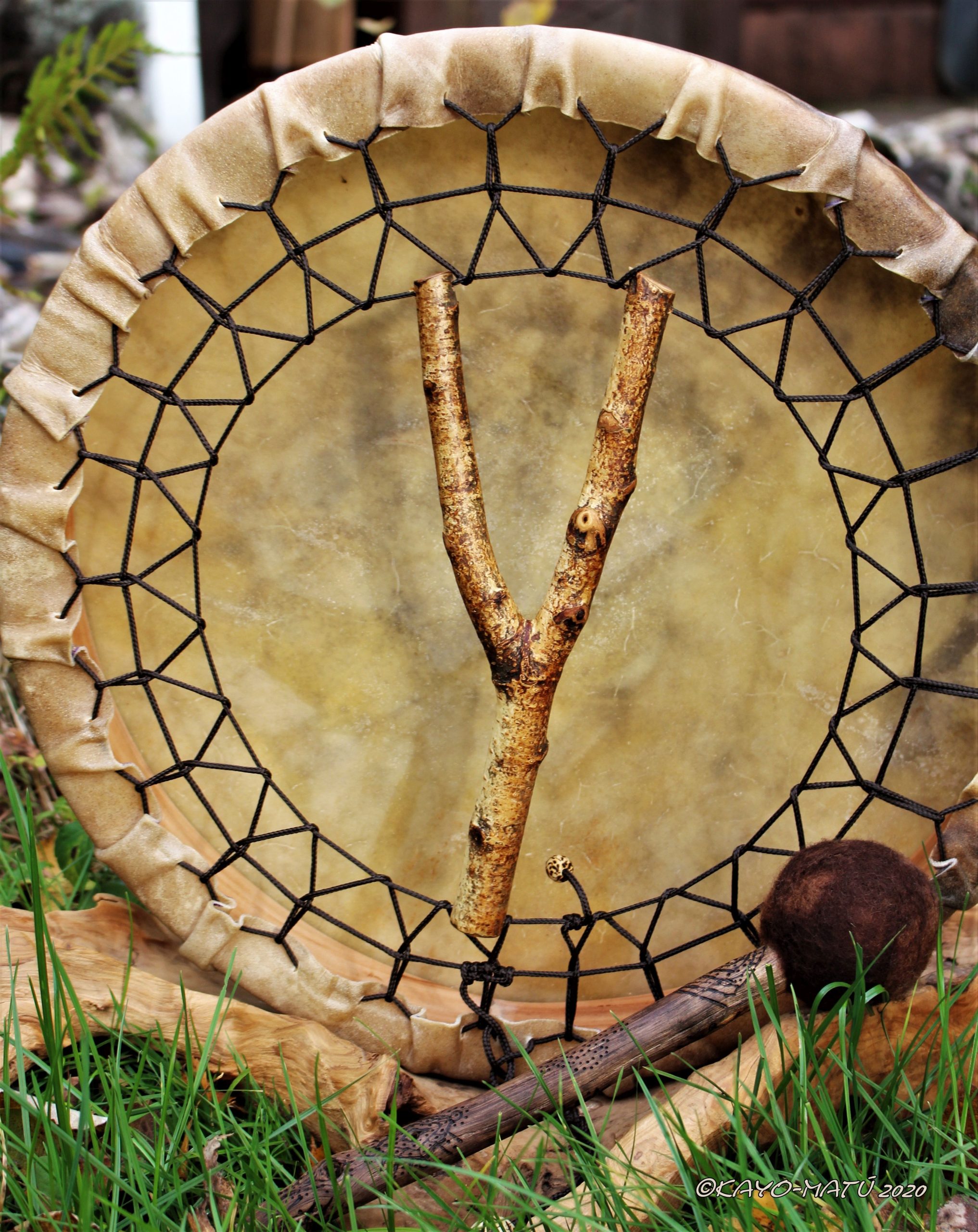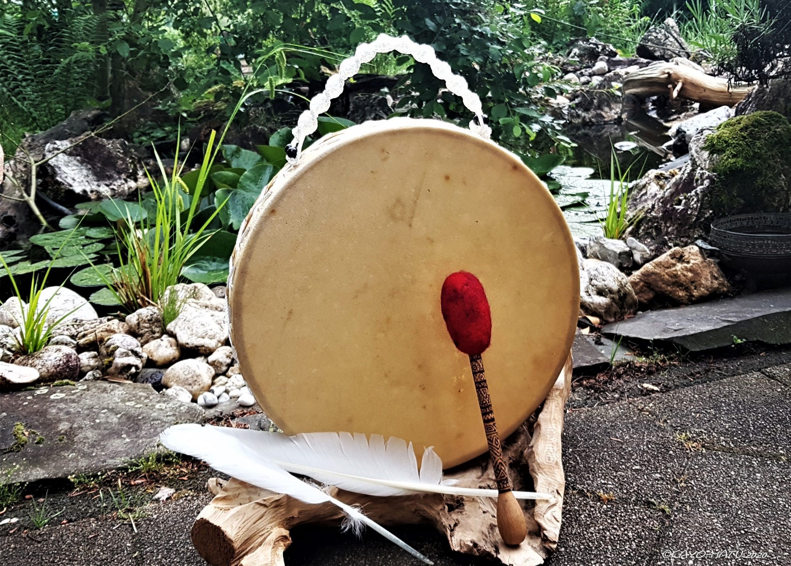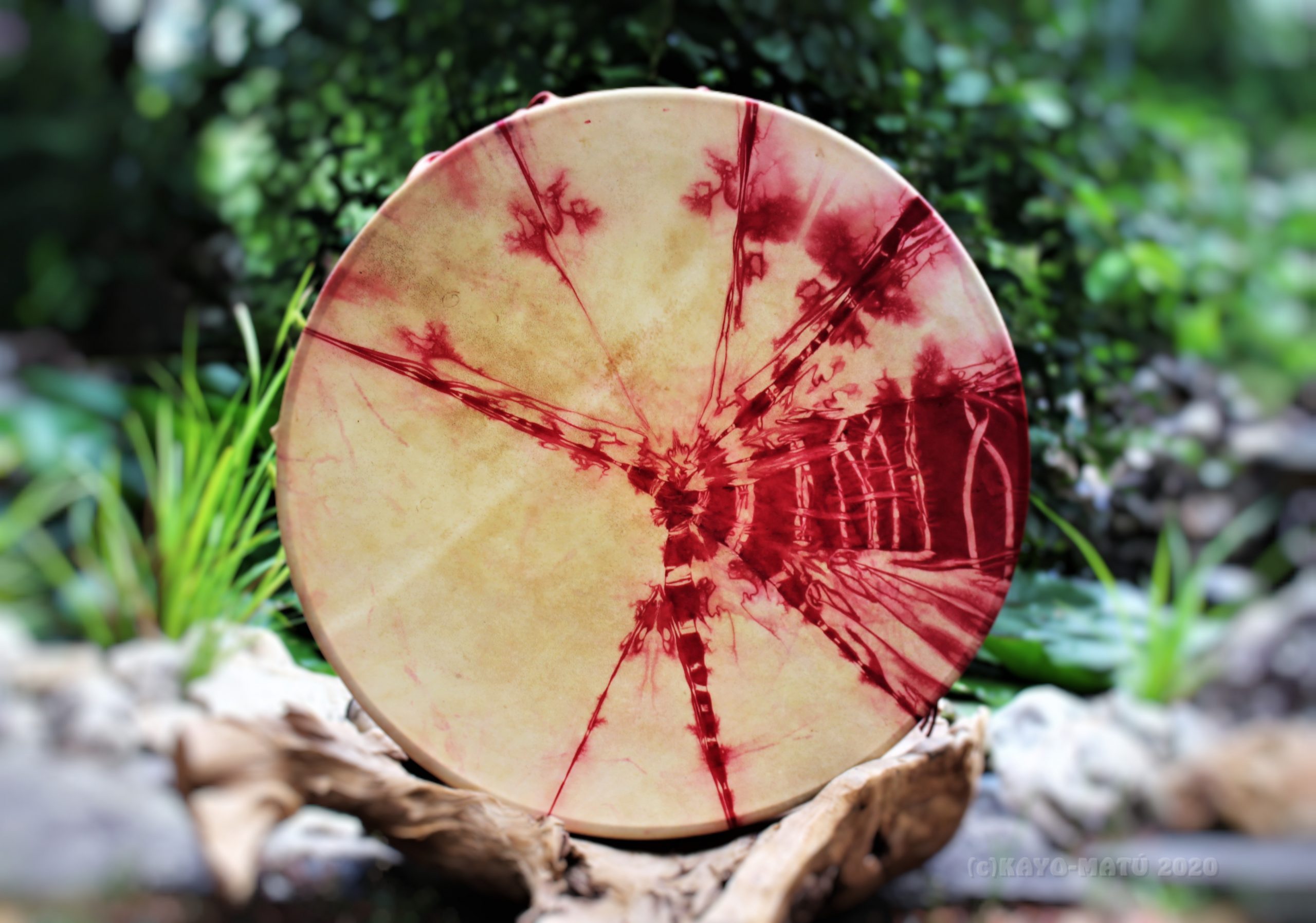 ► Ur-Form Trommeln – Selbst entworfene Trommelrahmen in Form eines natürlichen Baumstammes mit Handschuh als Halterung
