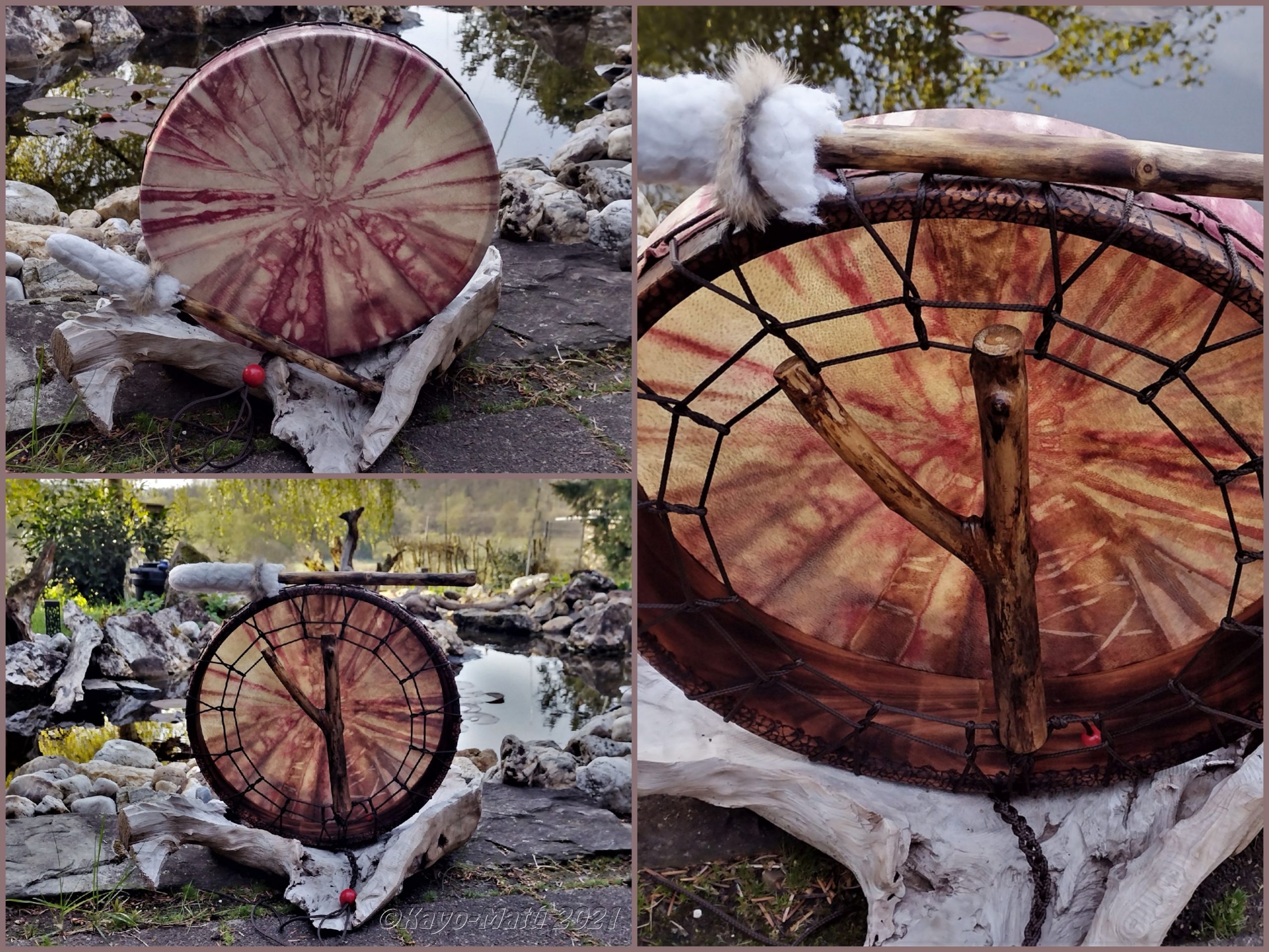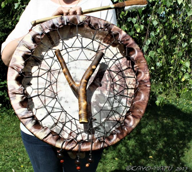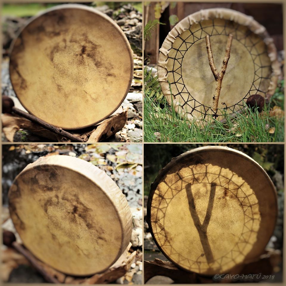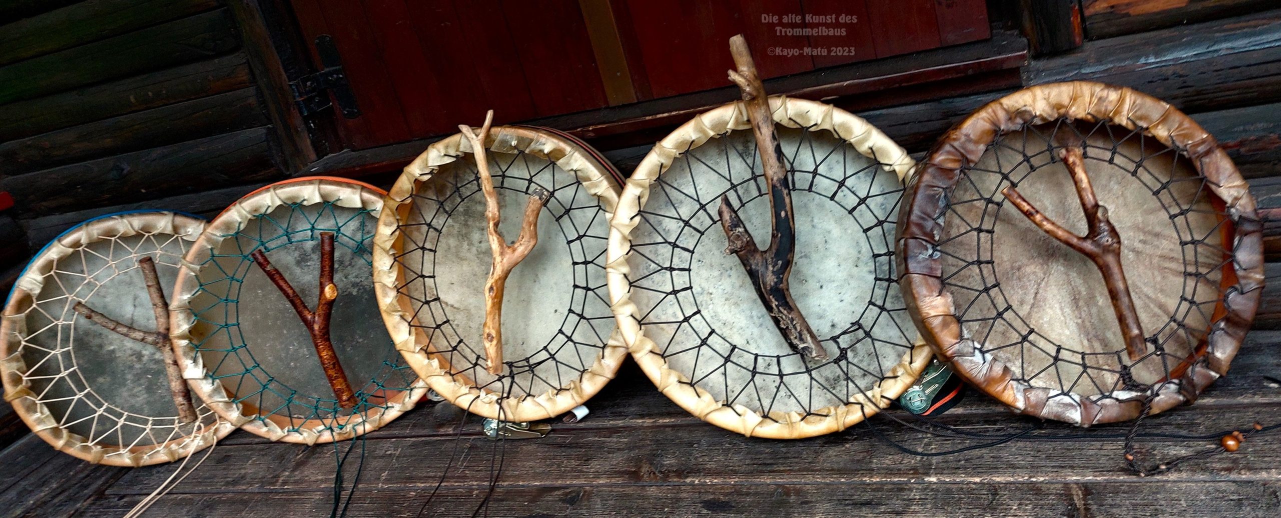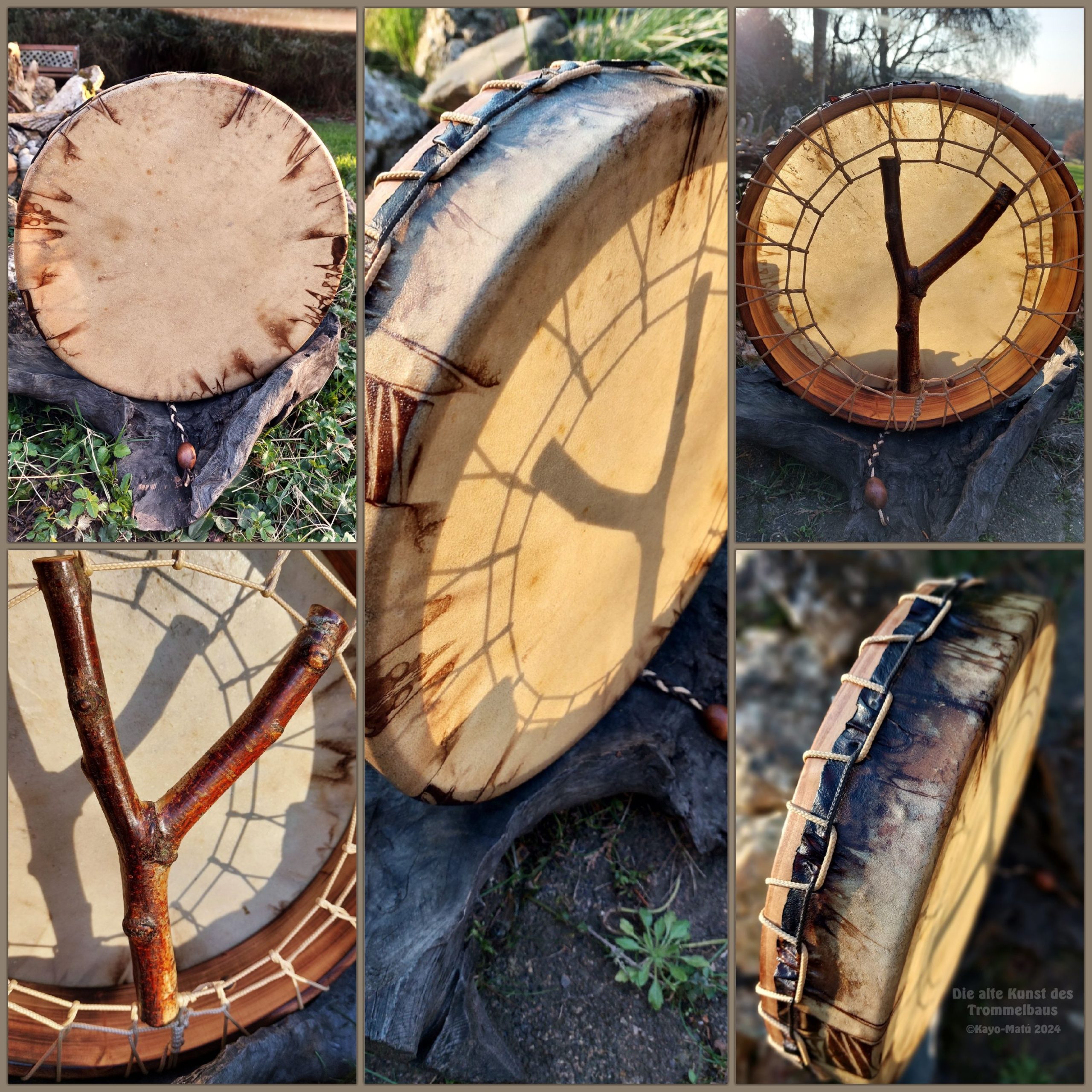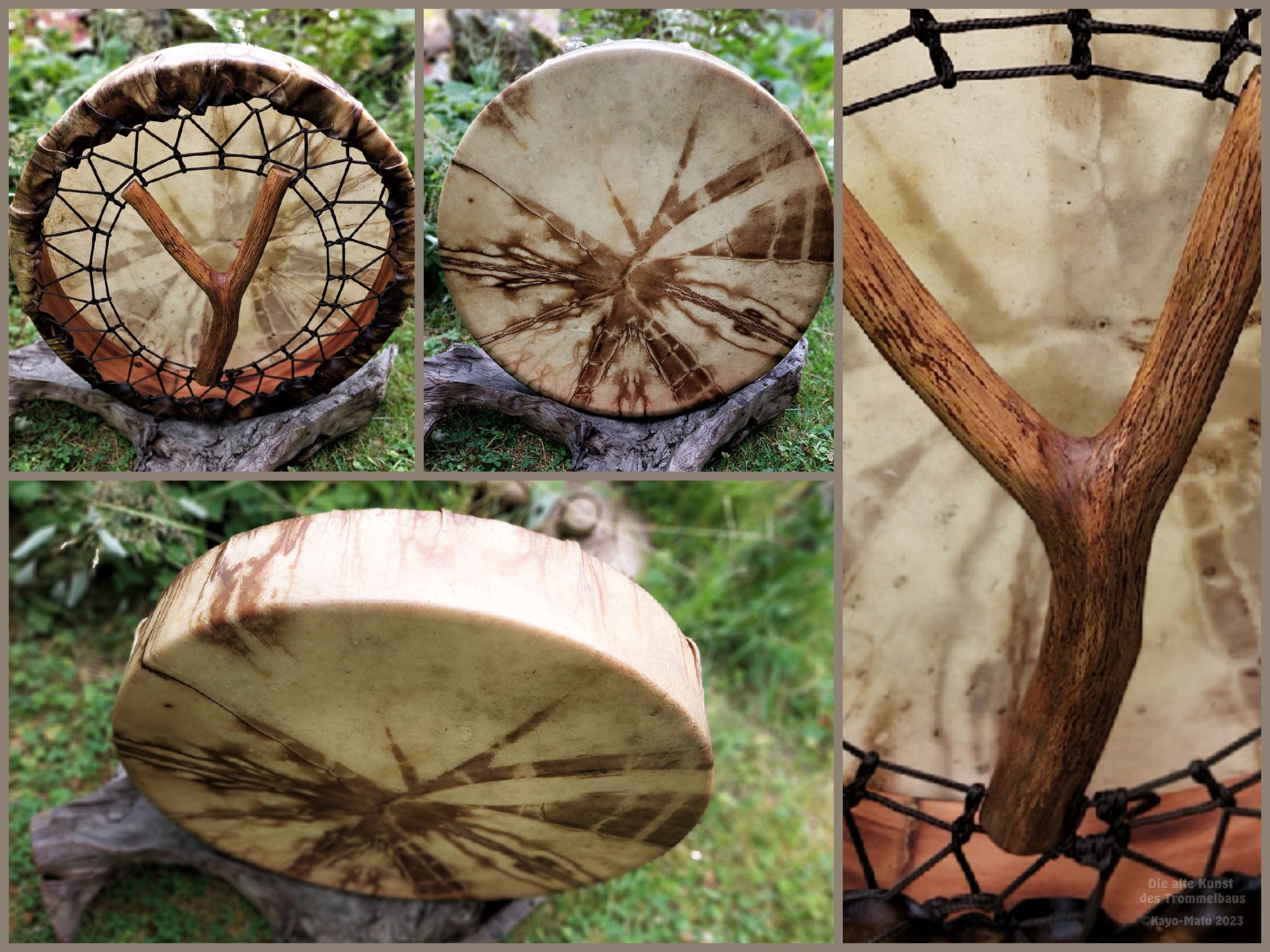 Im Laufe der vielen Jahre habe ich verschiedene Trommelmodelle gebaut. Hauptsächlich baue ich runde Trommeln mit Rahmen aus Weideholz von 35 – 40 und 45 cm im Durchmesser. Als Spannsystem verwende ich meine Ypsilon-Spannung und als Haltegriffe verwende ich naturgewachsene Astgabeln, die ebenfalls die Form eines Y haben. Spannsystem und Y-Form der Astgabel haben eine tiefe kosmologische Bedeutung in sich. Es kommt auch vor, dass ich Stenze, in sich gedrehtes Holz, als Haltegriffe verwende. Ich arbeite nur mit Nackt- rohhäuten vorzugsweise vom Hirsch, gelegentlich auch vom Pferd, da diese die besten Klangeigenschaften besitzen. Ca. 2010 entwickelte ich die Insubania-Färbetechnik (Sonnenbatik) auf der Tierhaut, das bedeutet, ein langer Such-und Ausprobier-Prozess, welche Naturfarbe auf Dauer auf Tierhäuten hält.