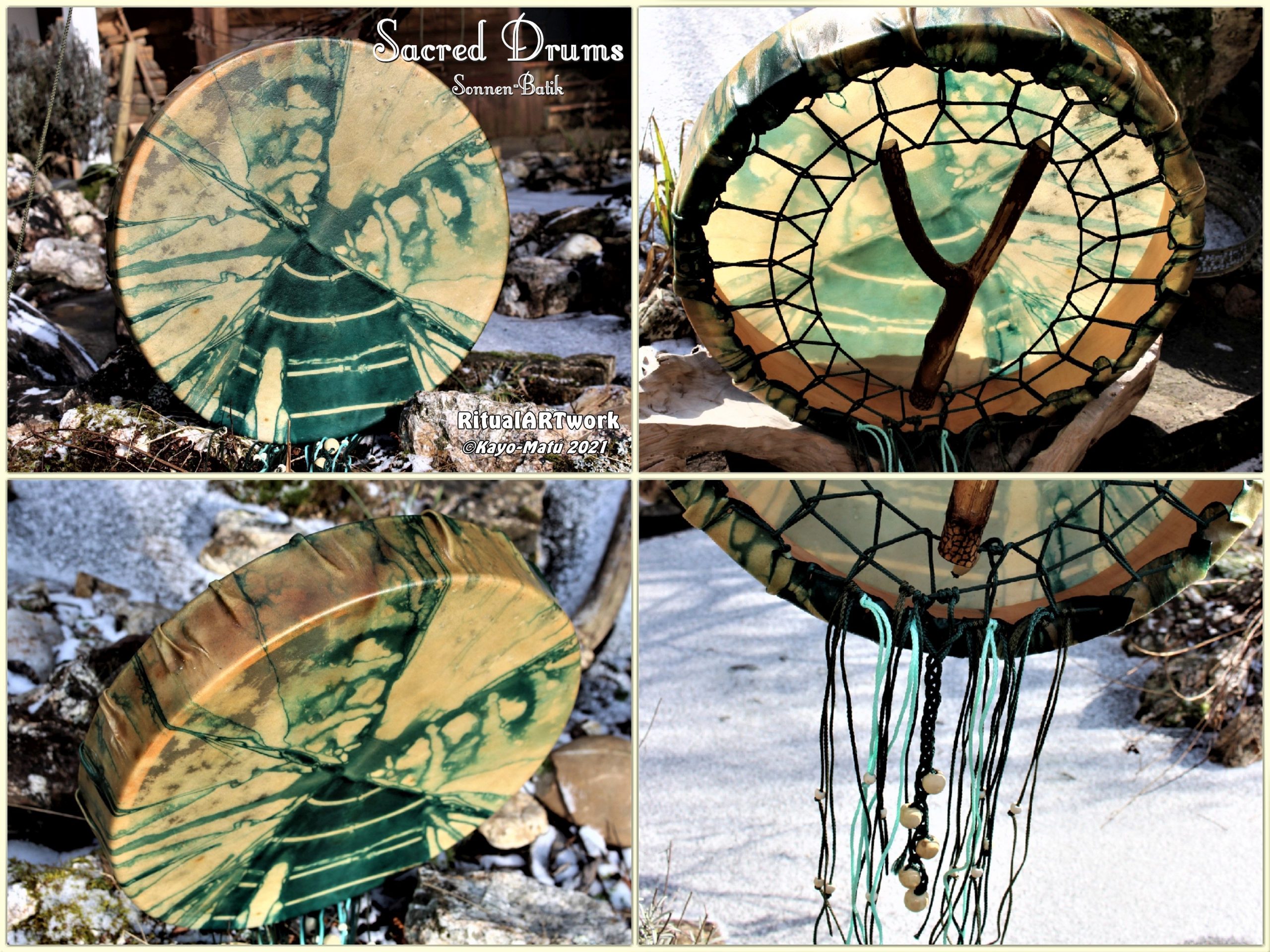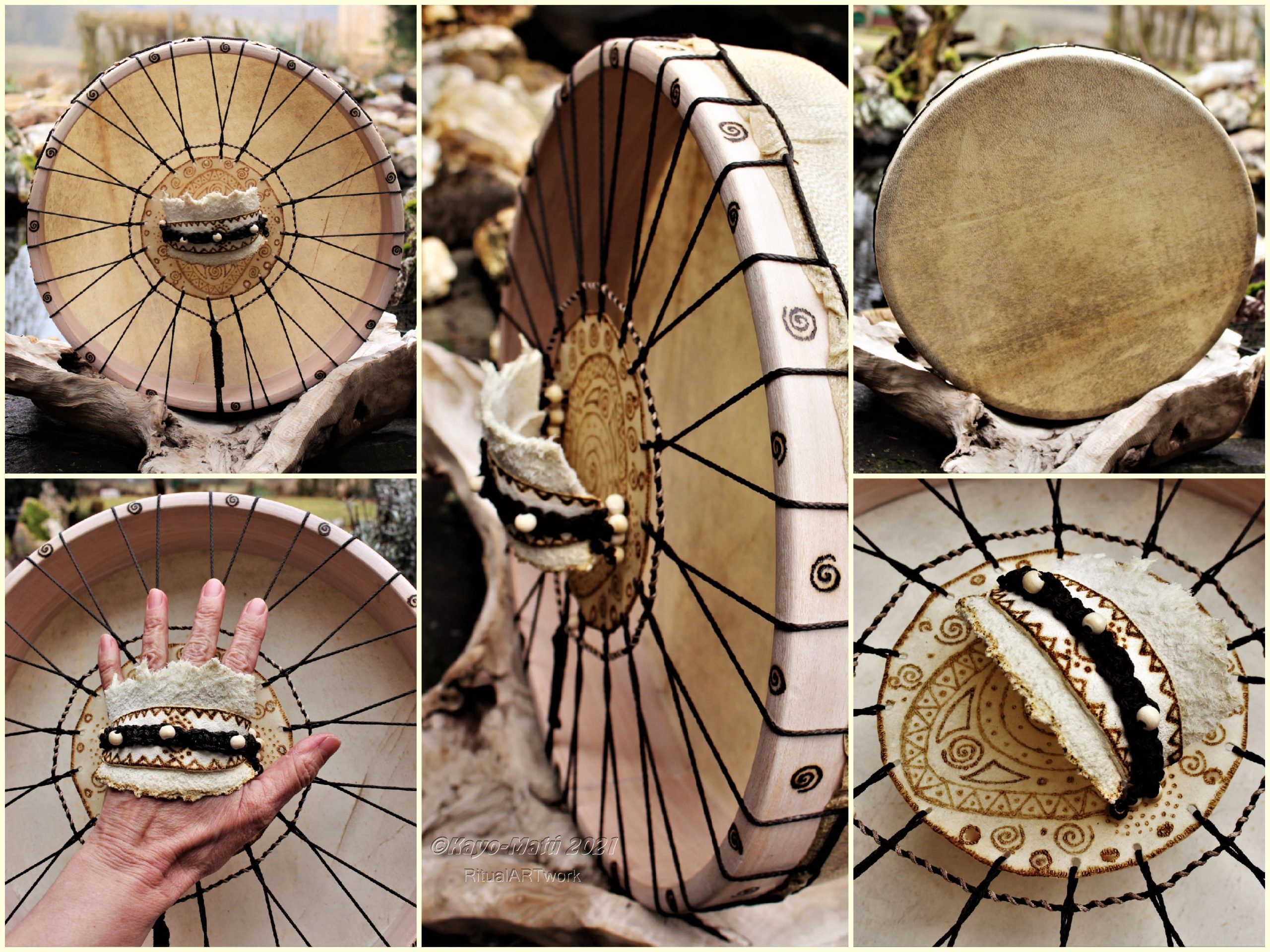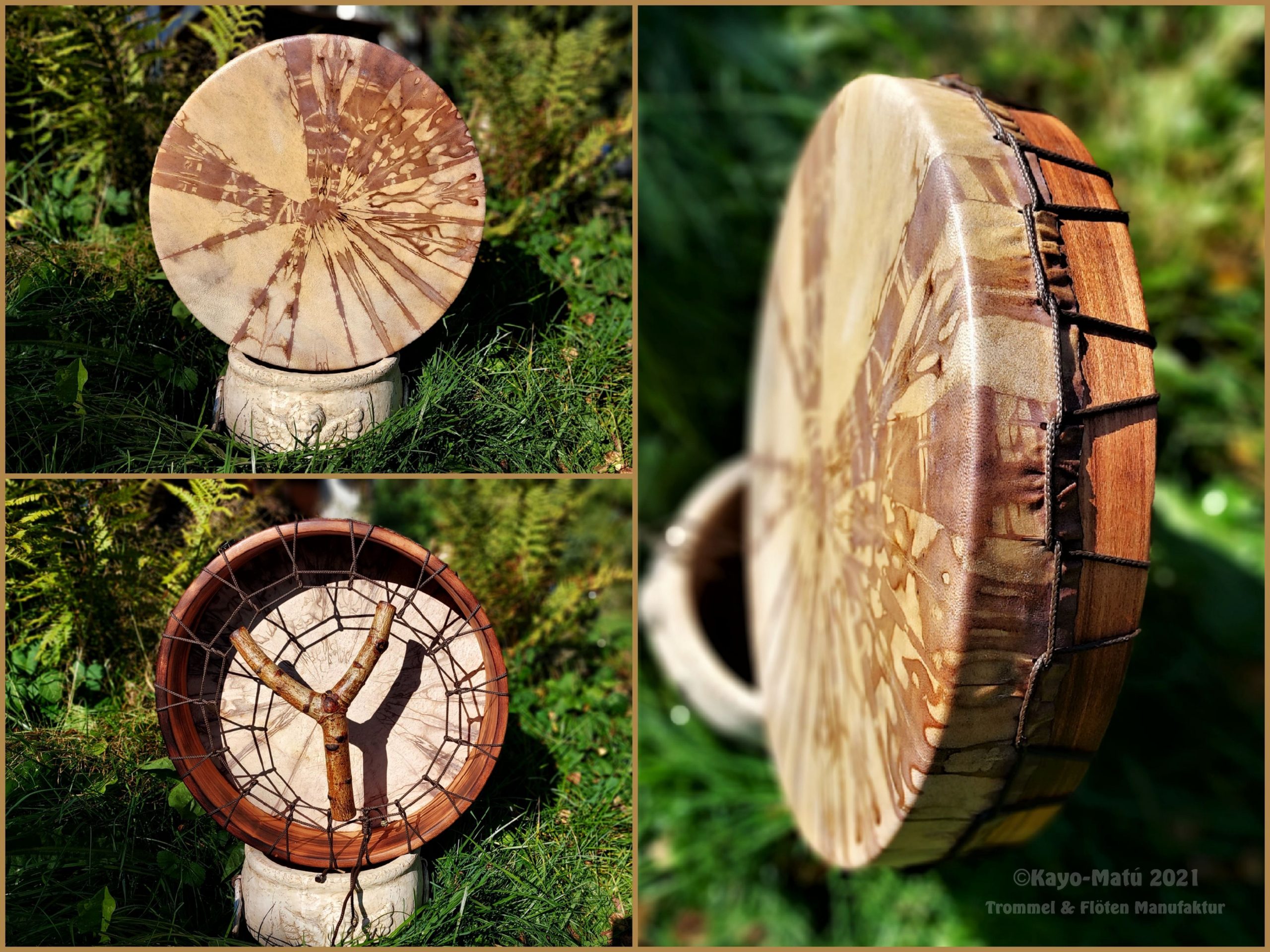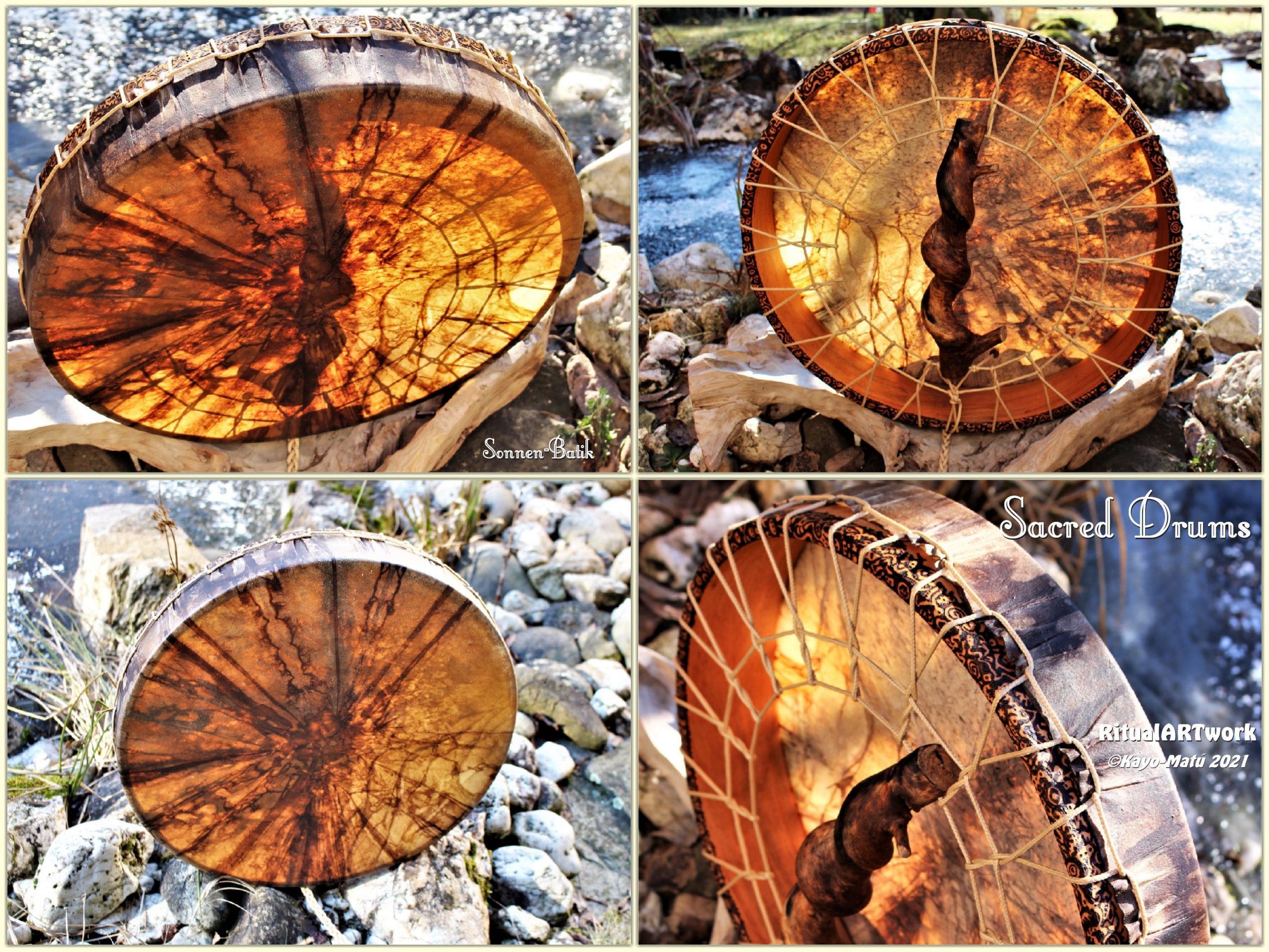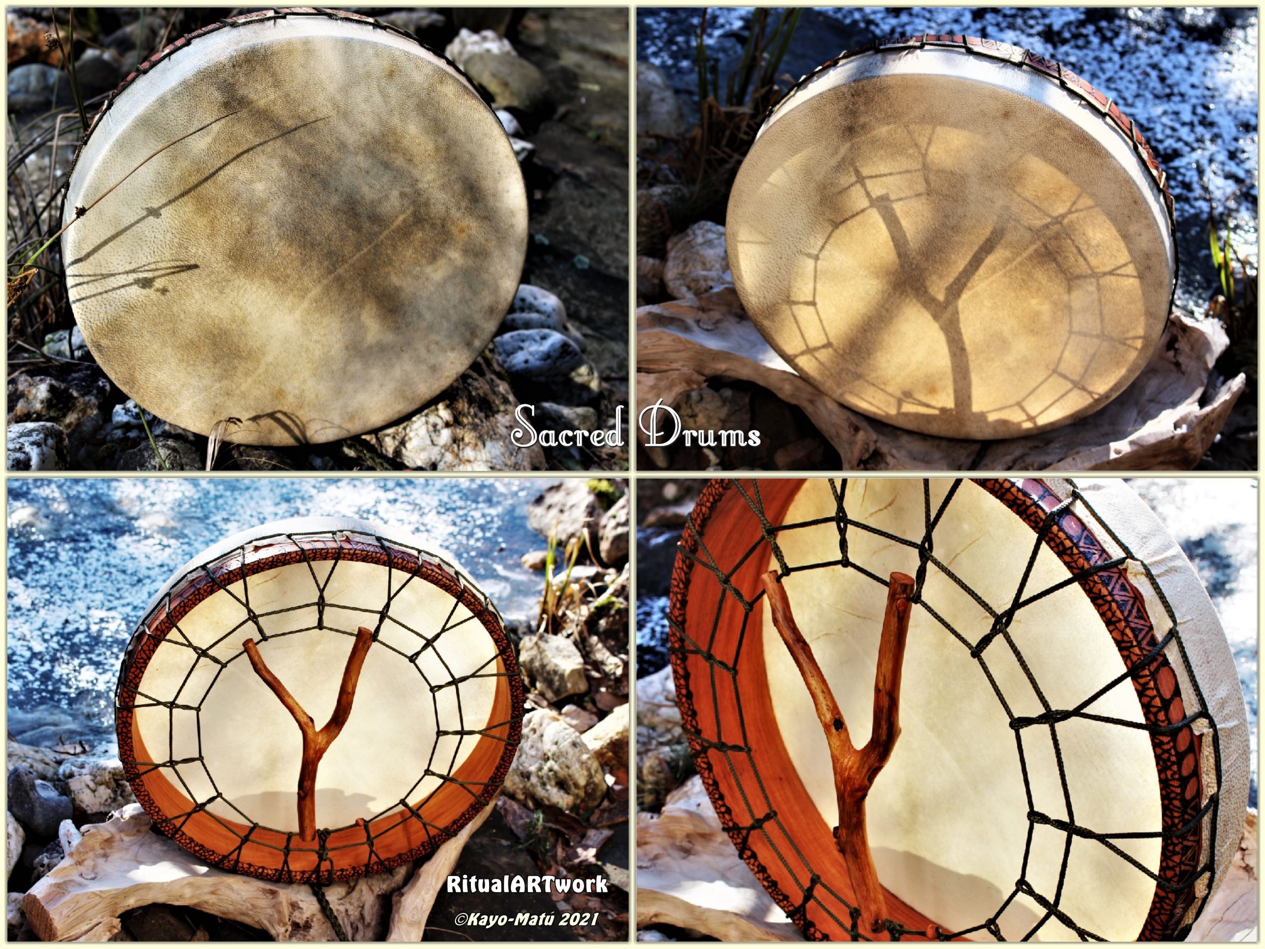 Im Laufe der vielen Jahre habe ich verschiedene Trommelmodelle gebaut. Hauptsächlich baue ich runde Trommeln mit Rahmen aus Weideholz von 35 – 40 und 45 cm im Durchmesser. Als Spannsystem verwende ich meine Ypsilon-Spannung und als Haltegriffe verwende ich naturgewachsene Astgabeln, die ebenfalls die Form eines Y haben. Spannsystem und Y-Form der Astgabel haben eine tiefe kosmologische Bedeutung in sich. Es kommt auch vor, dass ich Stenze, in sich gedrehtes Holz, als Haltegriffe verwende. Ich arbeite nur mit Nackt- rohhäuten vorzugsweise vom Hirsch, gelegentlich auch vom Pferd, da diese die besten Klangeigenschaften besitzen. Ca. 2010 entwickelte ich die Insubania-Färbetechnik (Sonnenbatik) auf der Tierhaut, das bedeutet, ein langer Such-und Ausprobier-Prozess, welche Naturfarbe auf Dauer auf Tierhäuten hält.