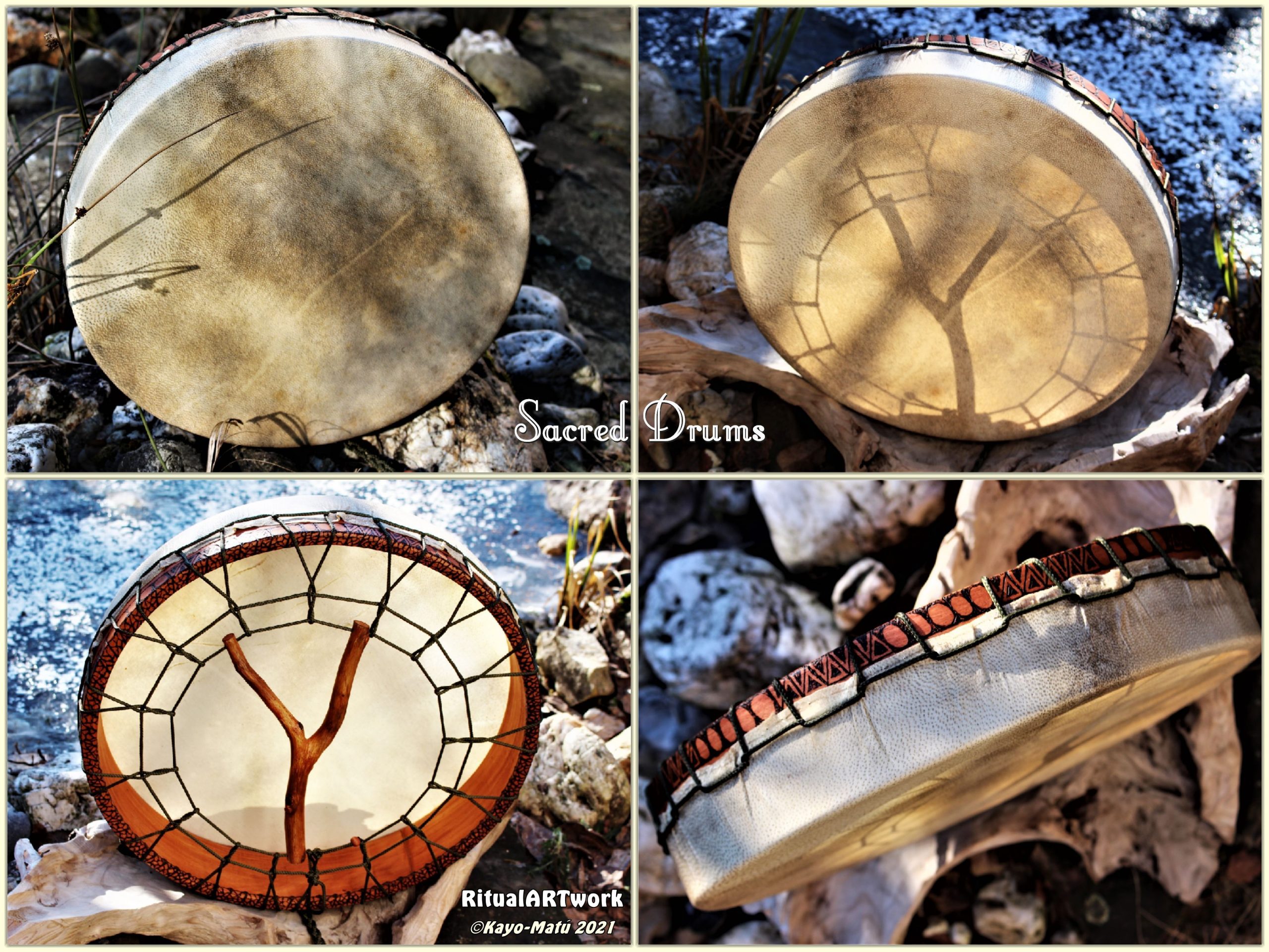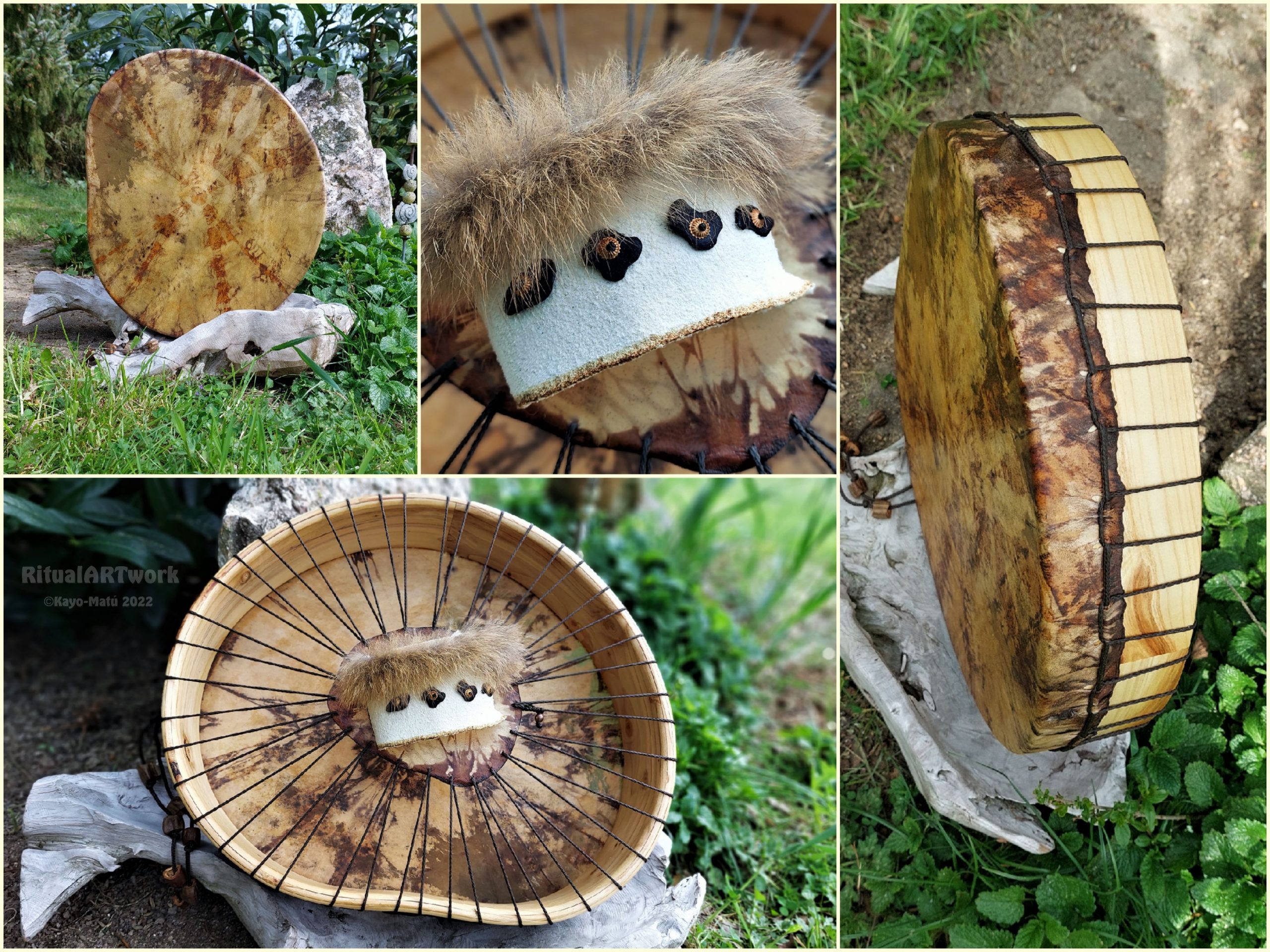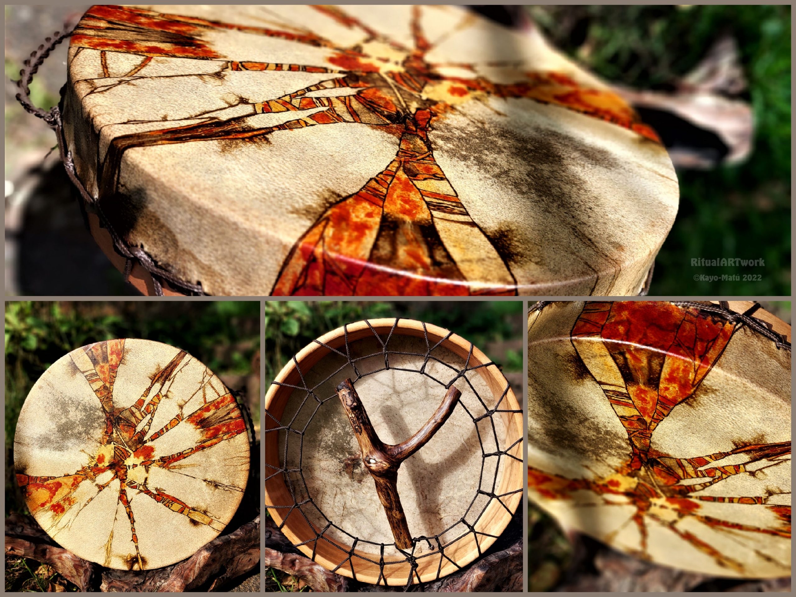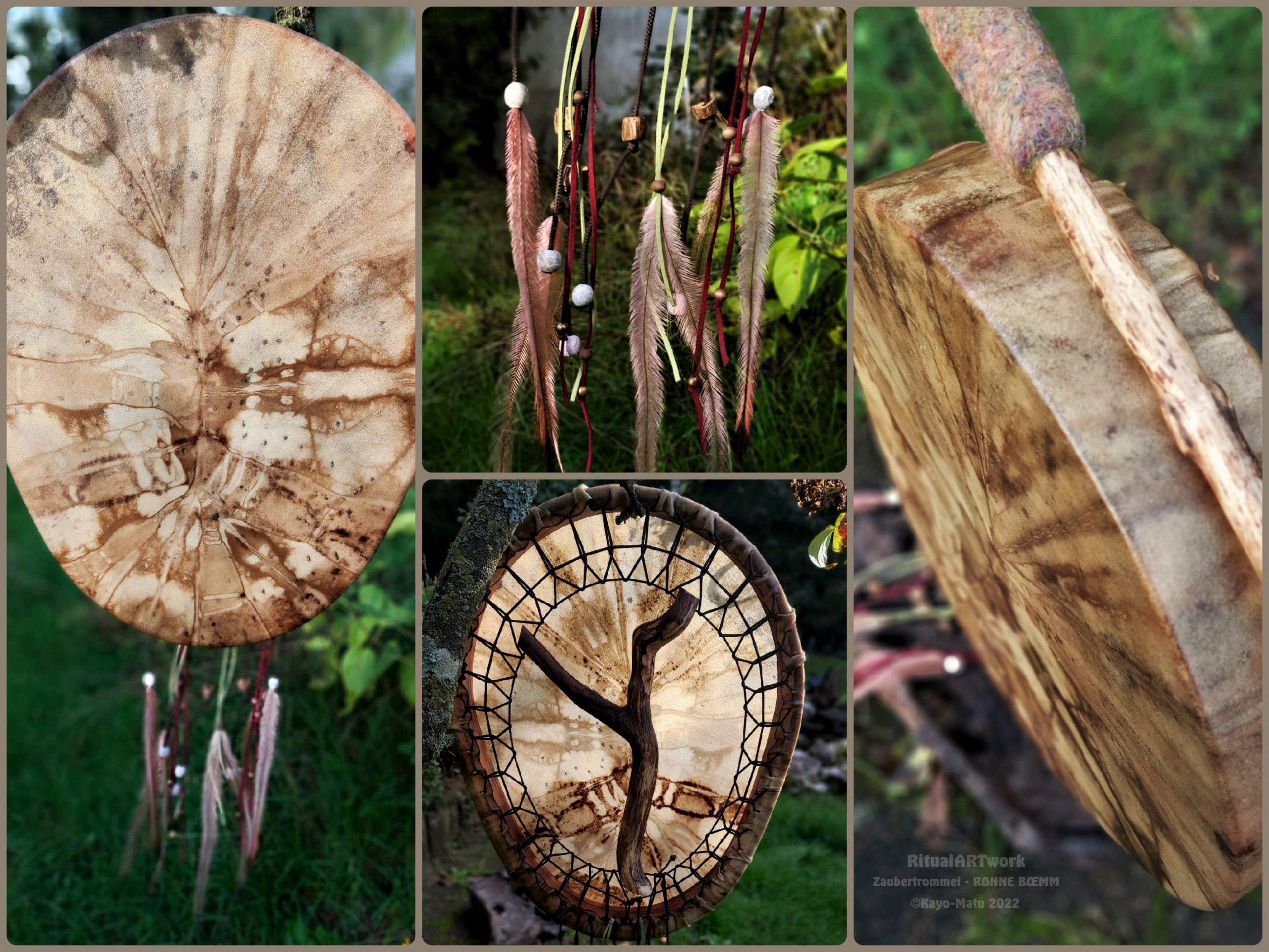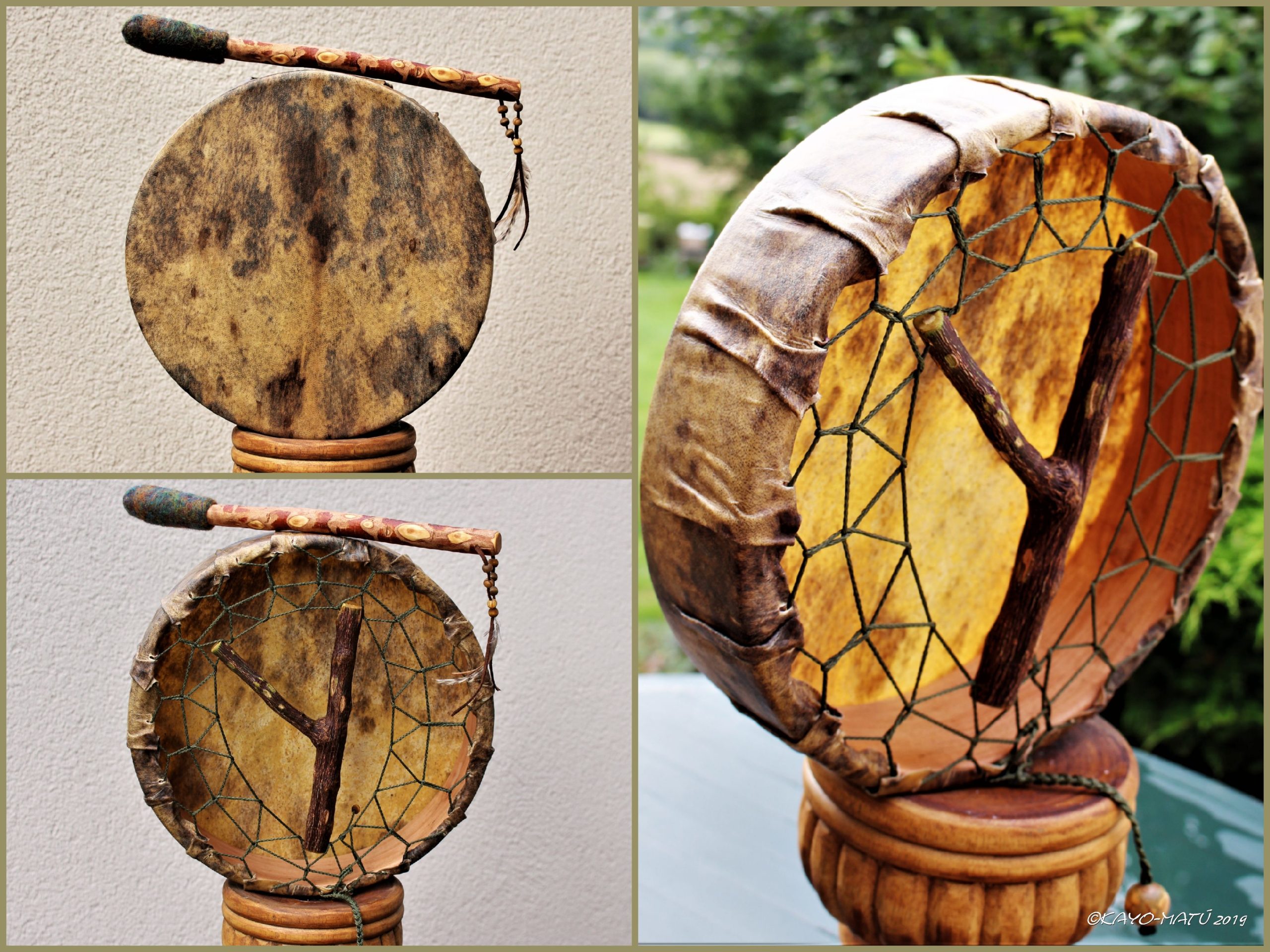 Im Laufe der vielen Jahre habe ich verschiedene Trommelmodelle gebaut. Hauptsächlich baue ich runde Trommeln mit Rahmen aus Weideholz von 35 – 40 und 45 cm im Durchmesser. Als Spannsystem verwende ich meine Ypsilon-Spannung und als Haltegriffe verwende ich naturgewachsene Astgabeln, die ebenfalls die Form eines Y haben. Spannsystem und Y-Form der Astgabel haben eine tiefe kosmologische Bedeutung in sich. Es kommt auch vor, dass ich Stenze, in sich gedrehtes Holz, als Haltegriffe verwende. Ich arbeite nur mit Nackt- rohhäuten vorzugsweise vom Hirsch, gelegentlich auch vom Pferd, da diese die besten Klangeigenschaften besitzen. Ca. 2010 entwickelte ich die Insubania-Färbetechnik (Sonnenbatik) auf der Tierhaut, das bedeutet, ein langer Such-und Ausprobier-Prozess, welche Naturfarbe auf Dauer auf Tierhäuten hält.