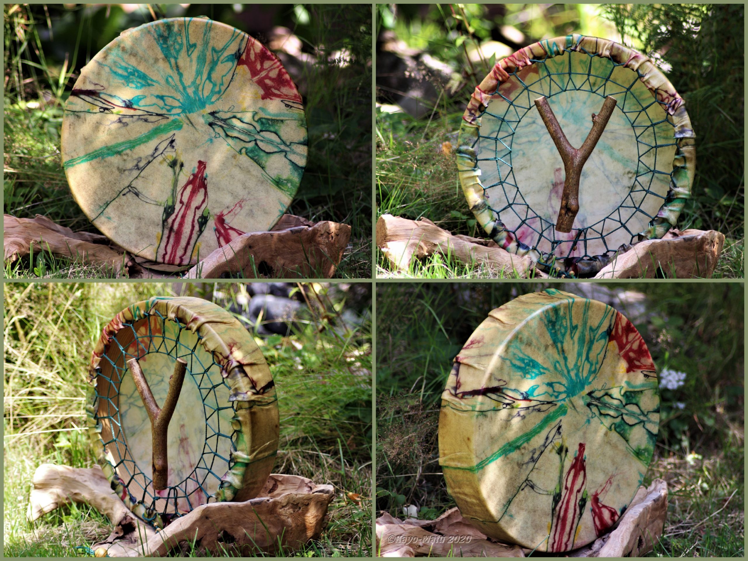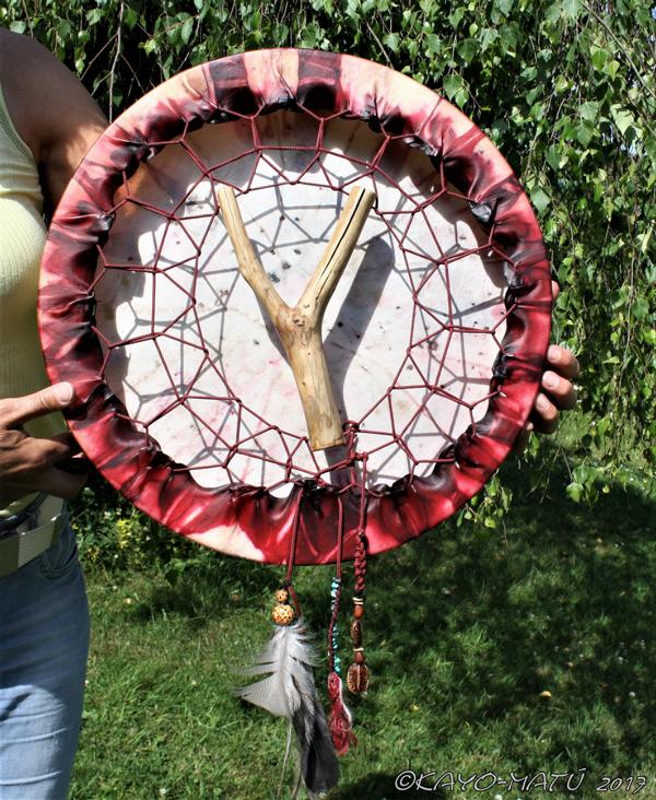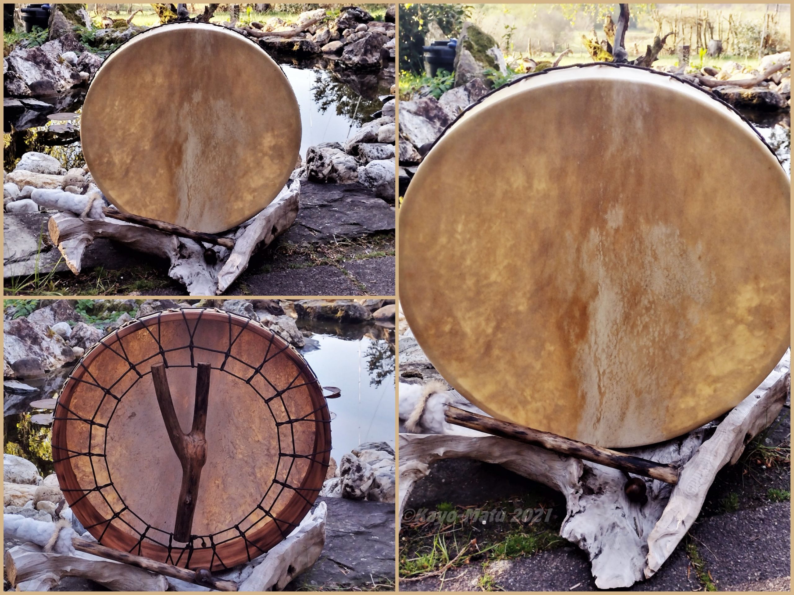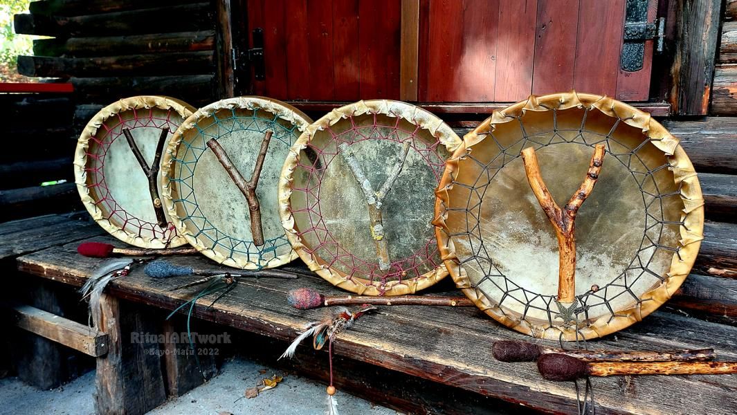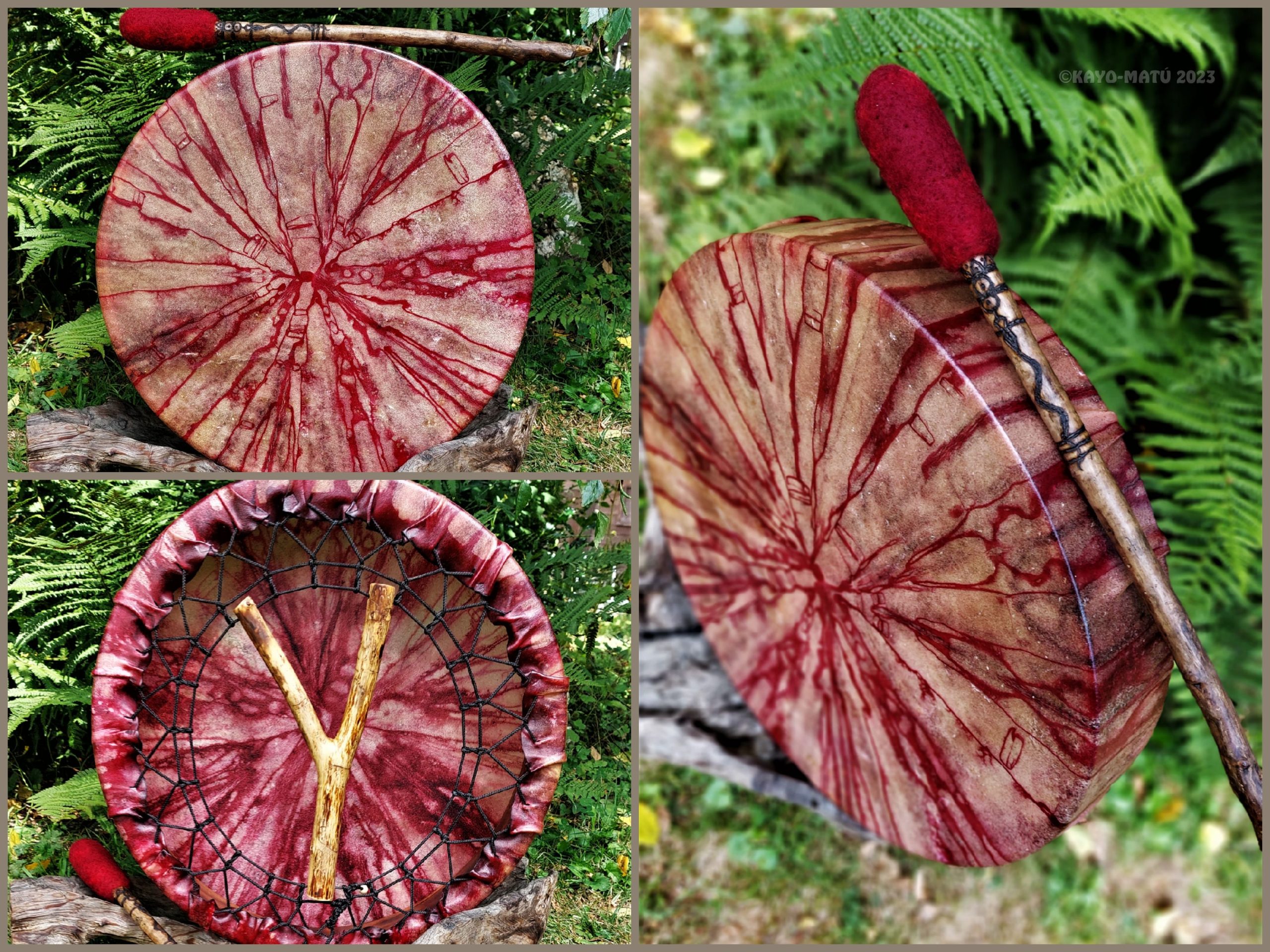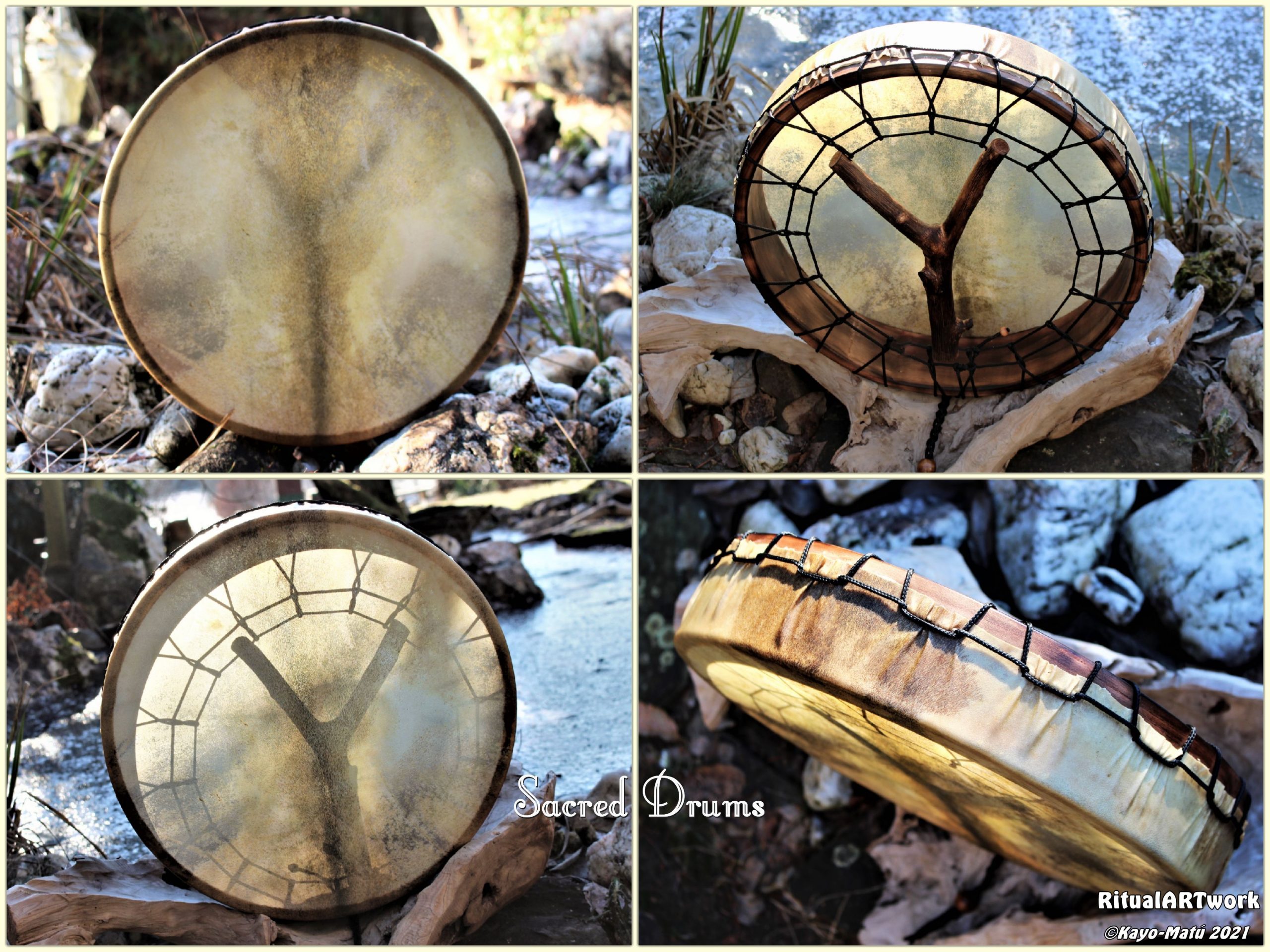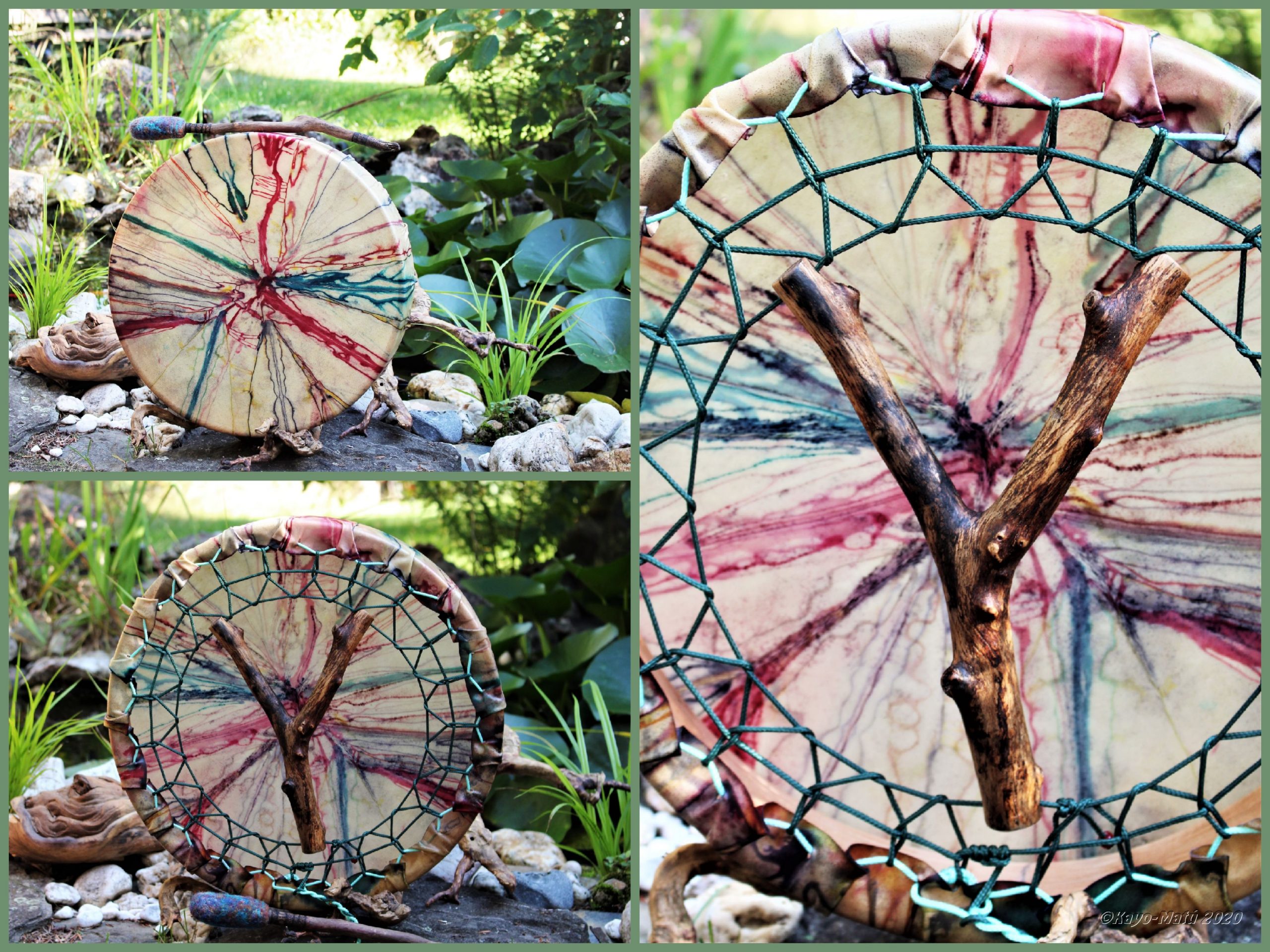 Im Laufe der vielen Jahre habe ich verschiedene Trommelmodelle gebaut. Hauptsächlich baue ich runde Trommeln mit Rahmen aus Weideholz von 35 – 40 und 45 cm im Durchmesser. Als Spannsystem verwende ich meine Ypsilon-Spannung und als Haltegriffe verwende ich naturgewachsene Astgabeln, die ebenfalls die Form eines Y haben. Spannsystem und Y-Form der Astgabel haben eine tiefe kosmologische Bedeutung in sich. Es kommt auch vor, dass ich Stenze, in sich gedrehtes Holz, als Haltegriffe verwende. Ich arbeite nur mit Nackt- rohhäuten vorzugsweise vom Hirsch, gelegentlich auch vom Pferd, da diese die besten Klangeigenschaften besitzen. Ca. 2010 entwickelte ich die Insubania-Färbetechnik (Sonnenbatik) auf der Tierhaut, das bedeutet, ein langer Such-und Ausprobier-Prozess, welche Naturfarbe auf Dauer auf Tierhäuten hält.