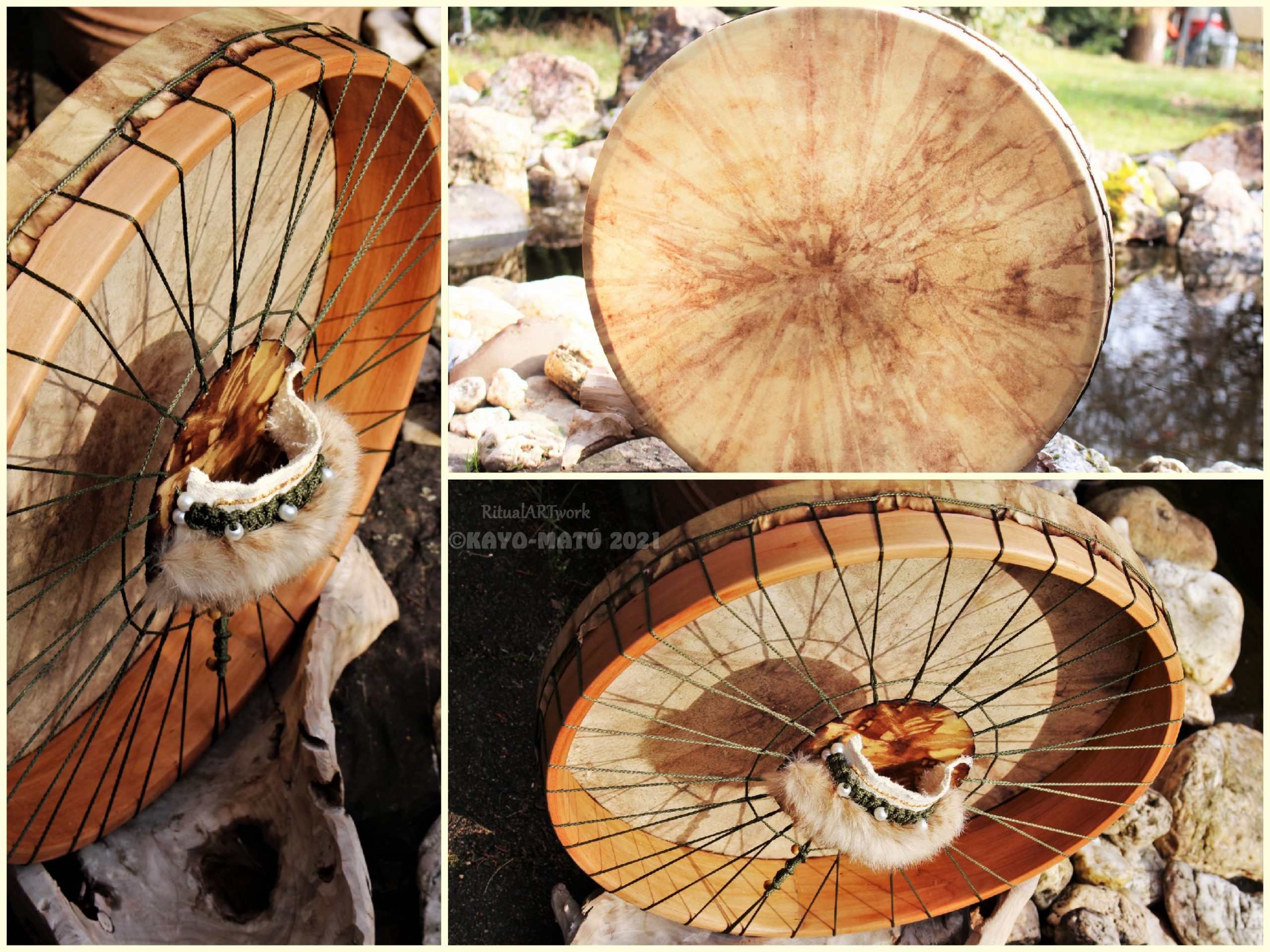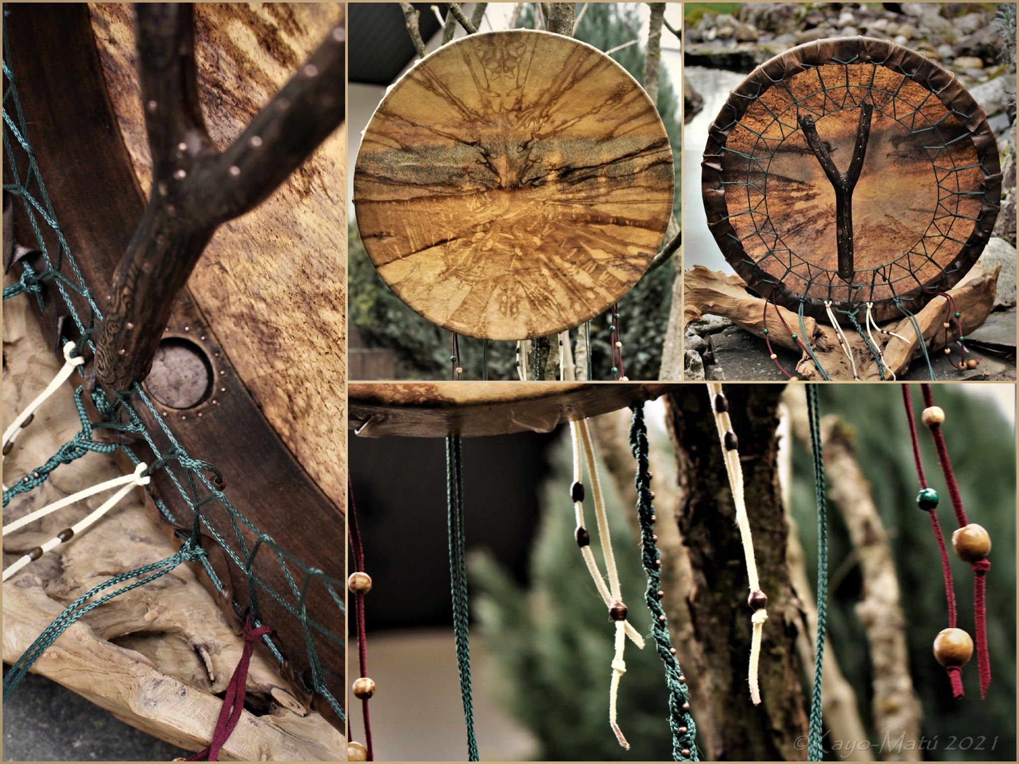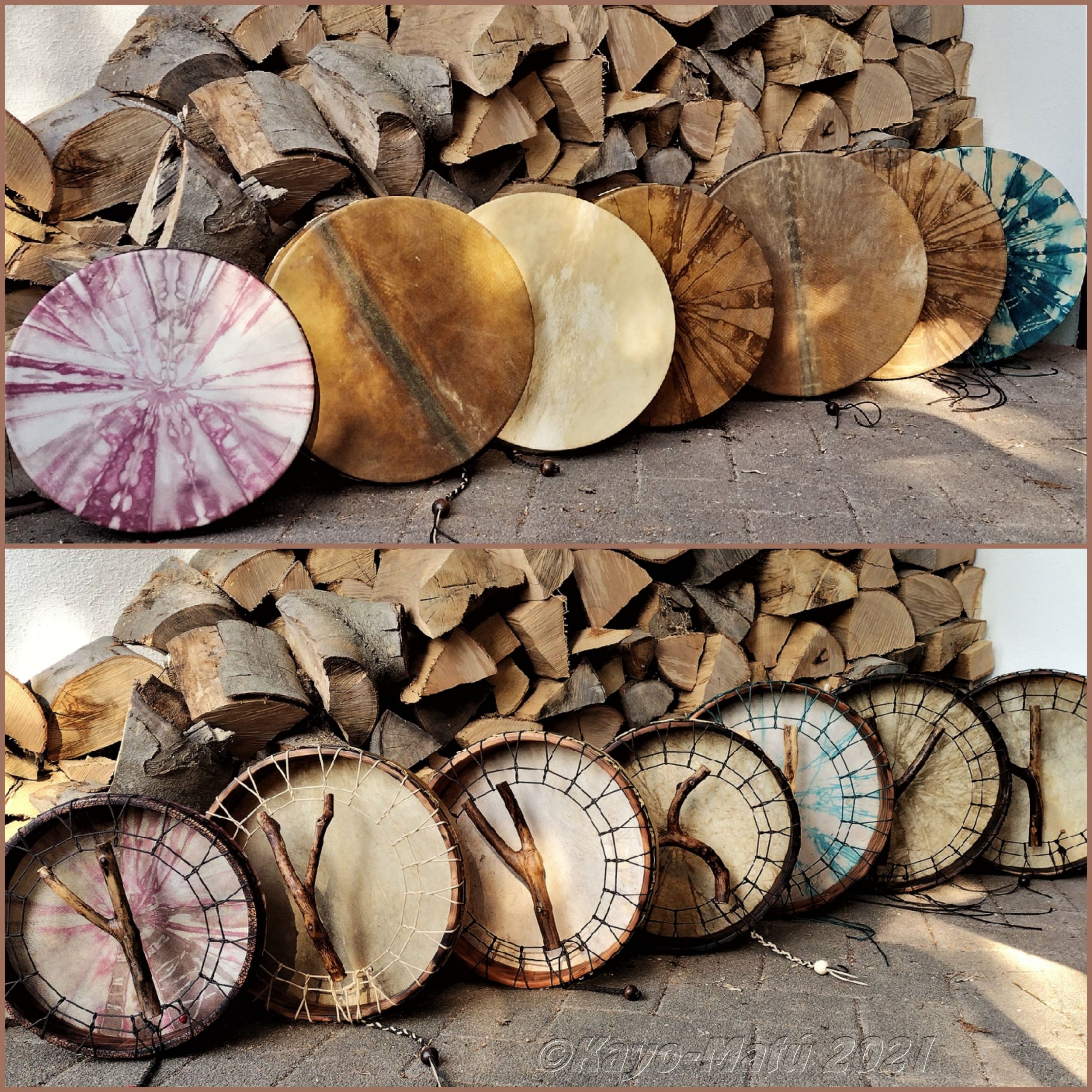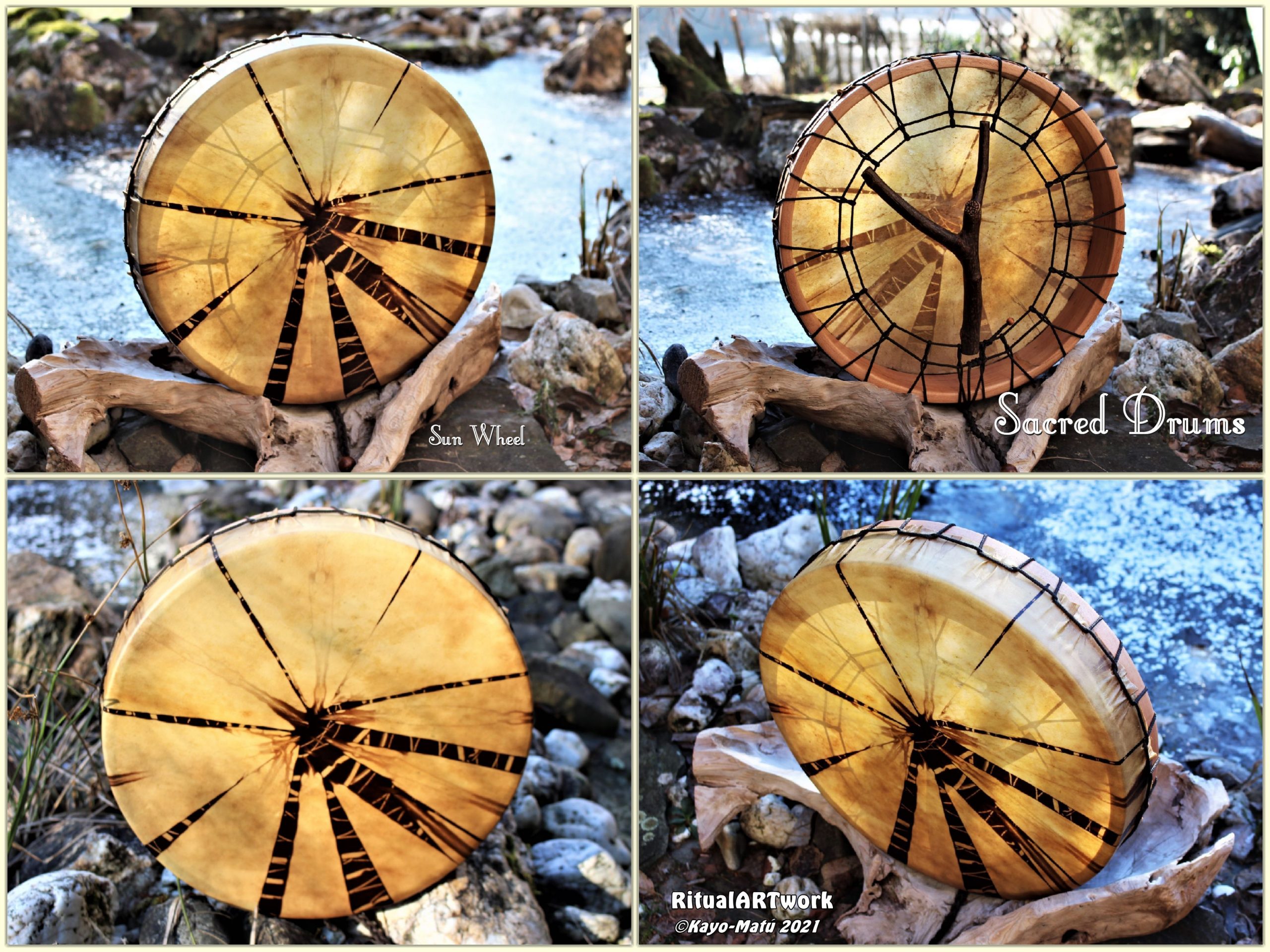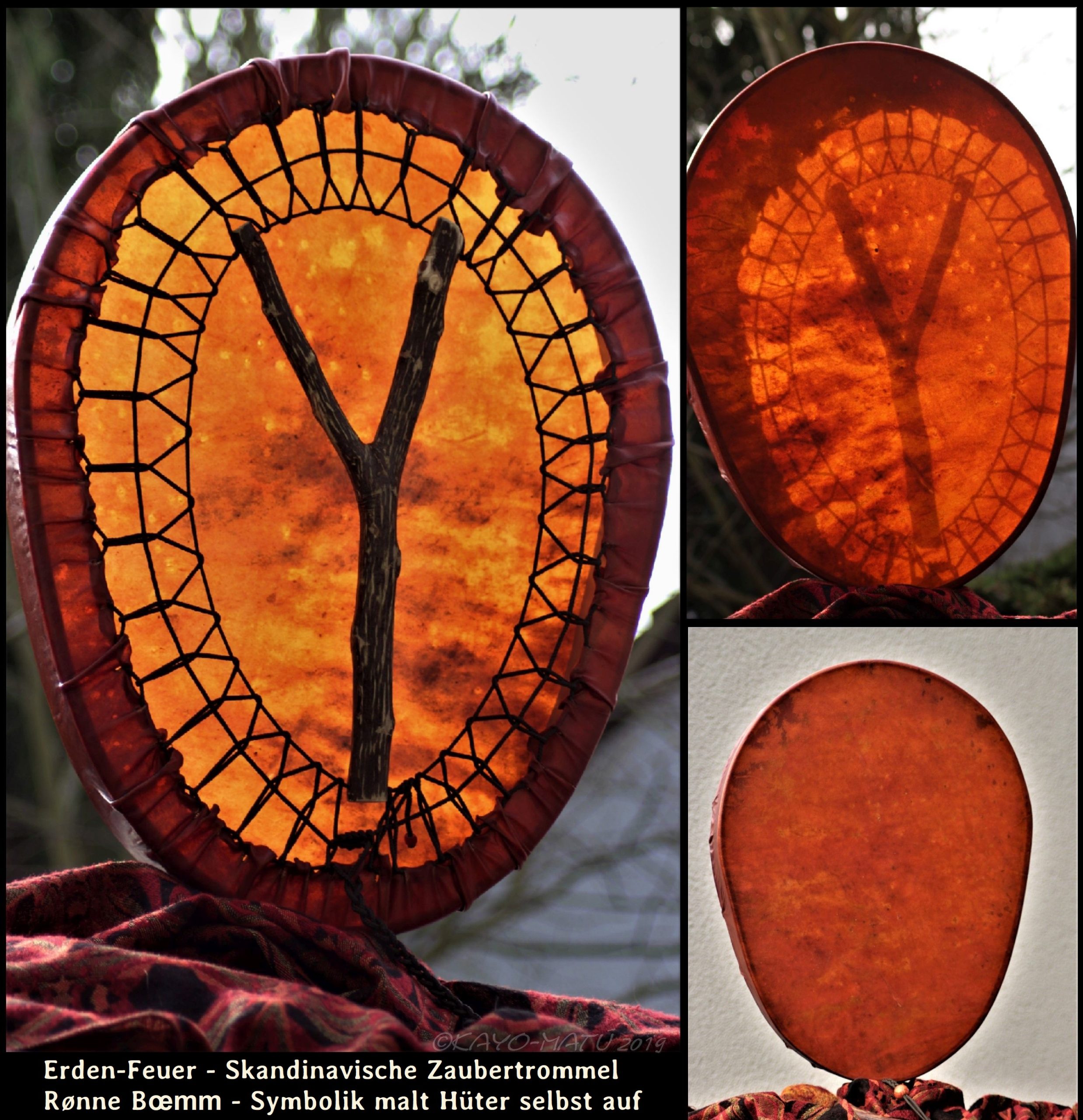 Im Laufe der vielen Jahre habe ich verschiedene Trommelmodelle gebaut. Hauptsächlich baue ich runde Trommeln mit Rahmen aus Weideholz von 35 – 40 und 45 cm im Durchmesser. Als Spannsystem verwende ich meine Ypsilon-Spannung und als Haltegriffe verwende ich naturgewachsene Astgabeln, die ebenfalls die Form eines Y haben. Spannsystem und Y-Form der Astgabel haben eine tiefe kosmologische Bedeutung in sich. Es kommt auch vor, dass ich Stenze, in sich gedrehtes Holz, als Haltegriffe verwende. Ich arbeite nur mit Nackt- rohhäuten vorzugsweise vom Hirsch, gelegentlich auch vom Pferd, da diese die besten Klangeigenschaften besitzen. Ca. 2010 entwickelte ich die Insubania-Färbetechnik (Sonnenbatik) auf der Tierhaut, das bedeutet, ein langer Such-und Ausprobier-Prozess, welche Naturfarbe auf Dauer auf Tierhäuten hält.