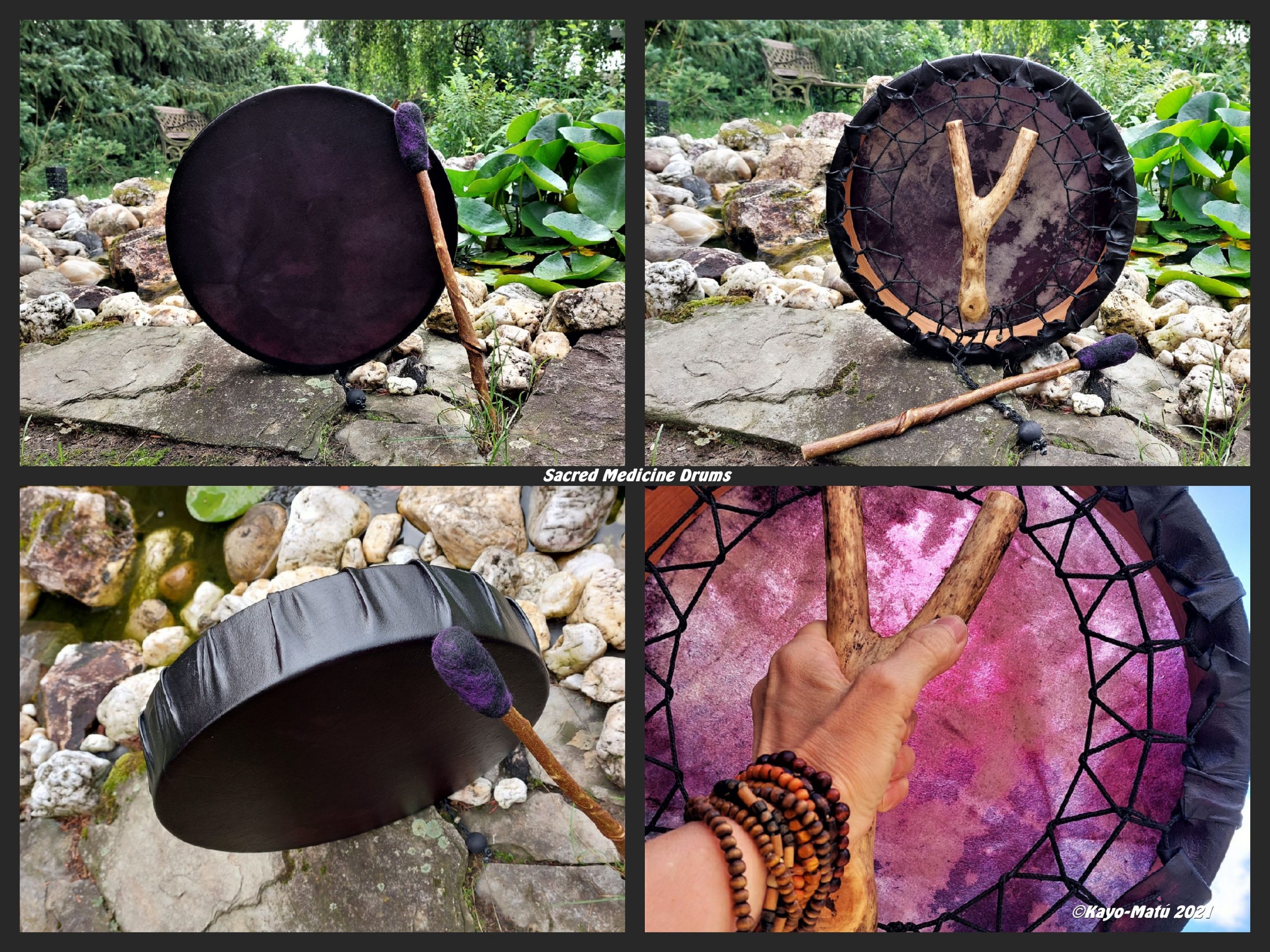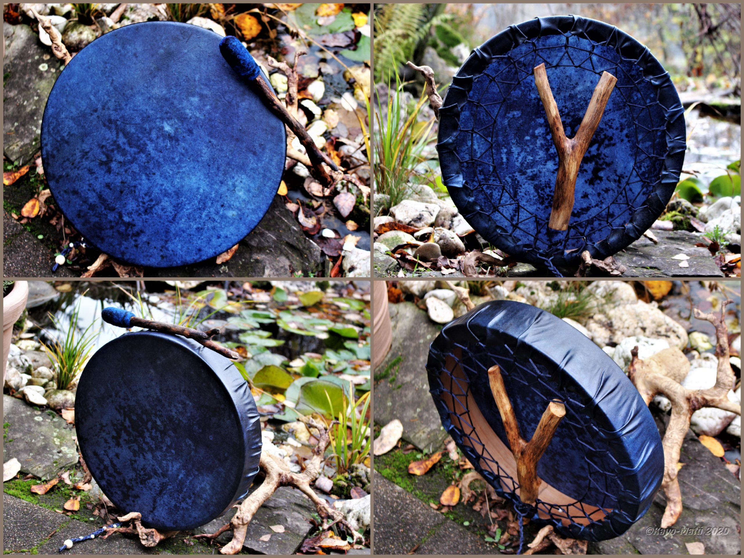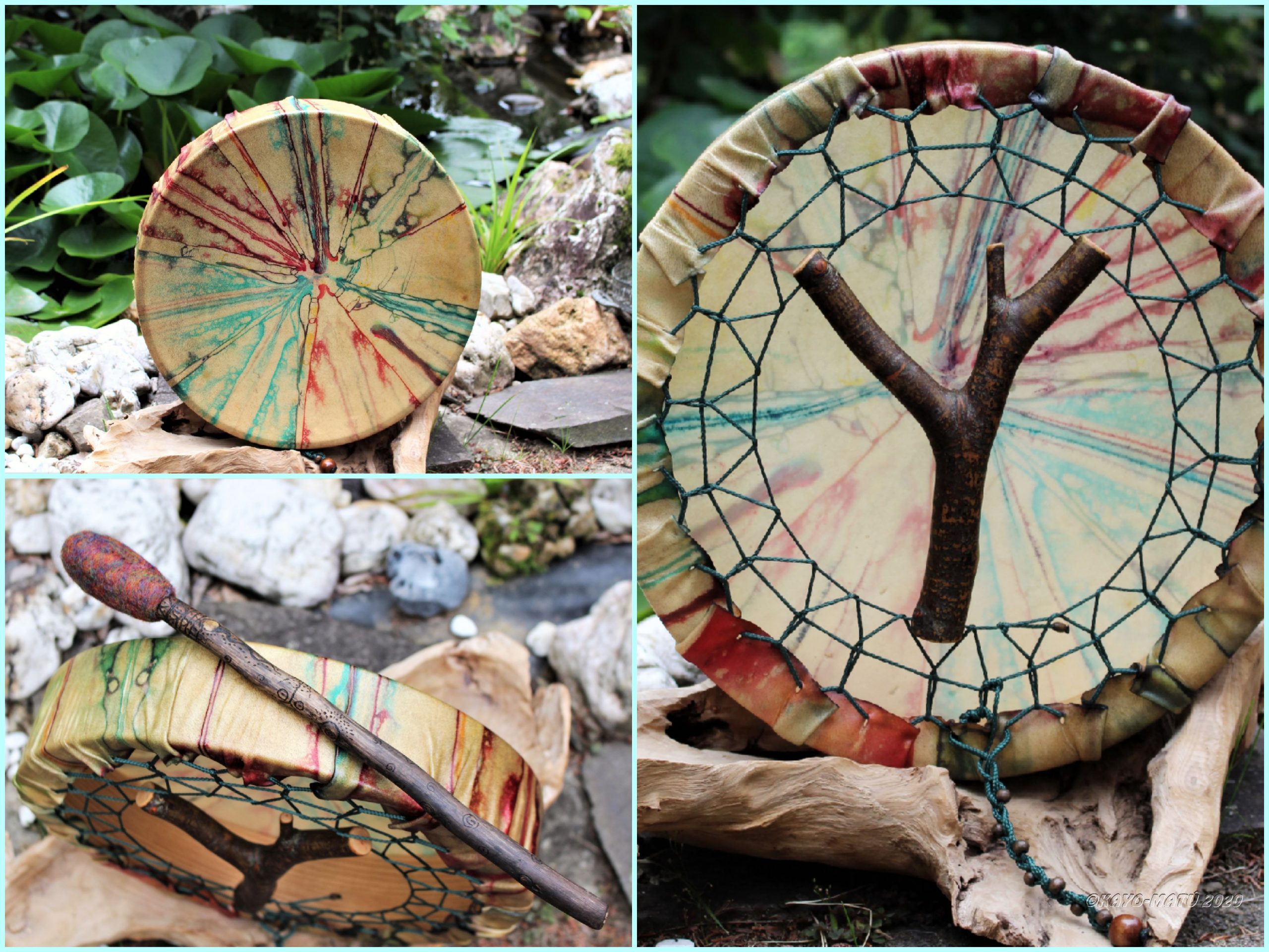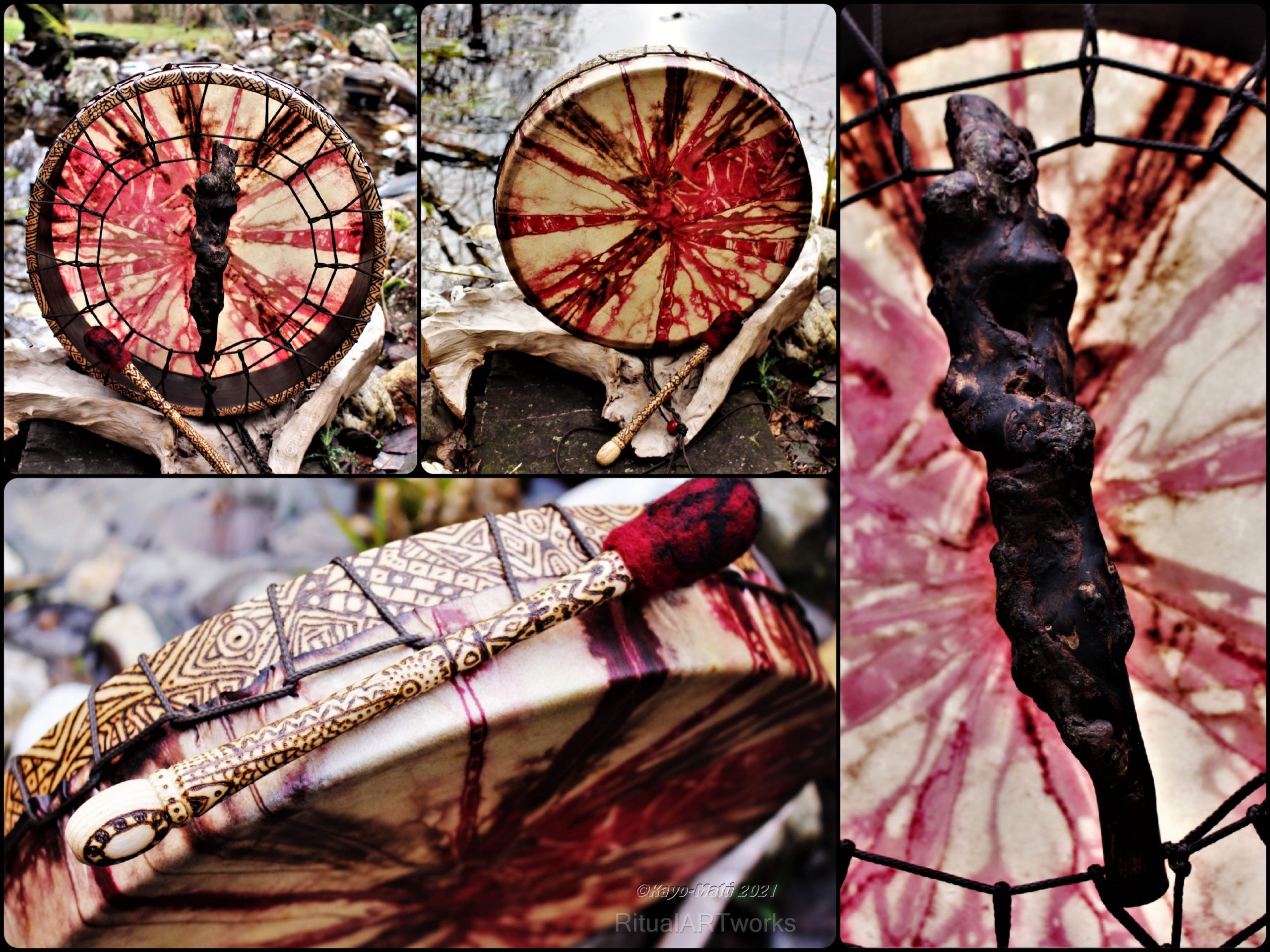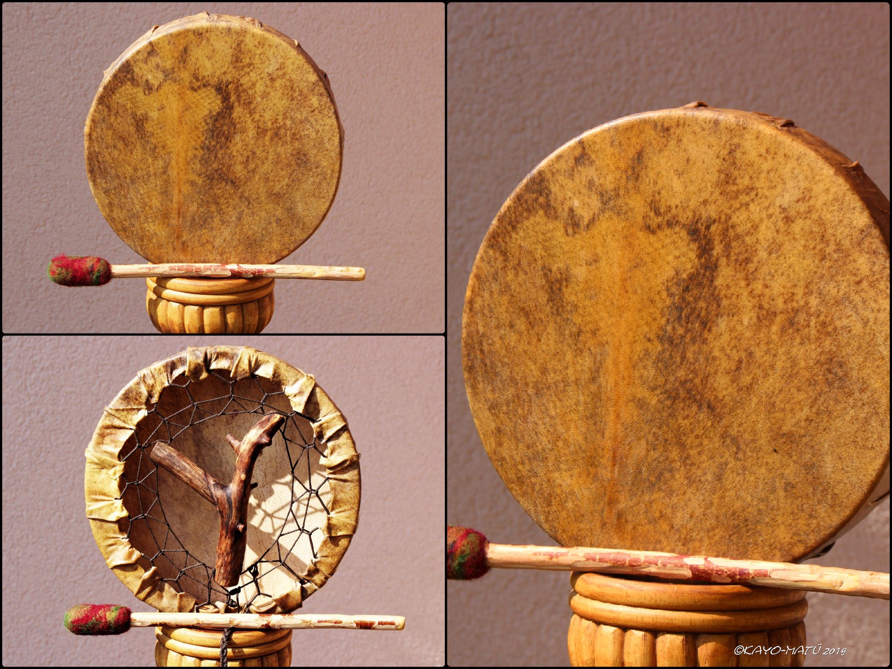 Im Laufe der vielen Jahre habe ich verschiedene Trommelmodelle gebaut. Hauptsächlich baue ich runde Trommeln mit Rahmen aus Weideholz von 35 – 40 und 45 cm im Durchmesser. Als Spannsystem verwende ich meine Ypsilon-Spannung und als Haltegriffe verwende ich naturgewachsene Astgabeln, die ebenfalls die Form eines Y haben. Spannsystem und Y-Form der Astgabel haben eine tiefe kosmologische Bedeutung in sich. Es kommt auch vor, dass ich Stenze, in sich gedrehtes Holz, als Haltegriffe verwende. Ich arbeite nur mit Nackt- rohhäuten vorzugsweise vom Hirsch, gelegentlich auch vom Pferd, da diese die besten Klangeigenschaften besitzen. Ca. 2010 entwickelte ich die Insubania-Färbetechnik (Sonnenbatik) auf der Tierhaut, das bedeutet, ein langer Such-und Ausprobier-Prozess, welche Naturfarbe auf Dauer auf Tierhäuten hält.