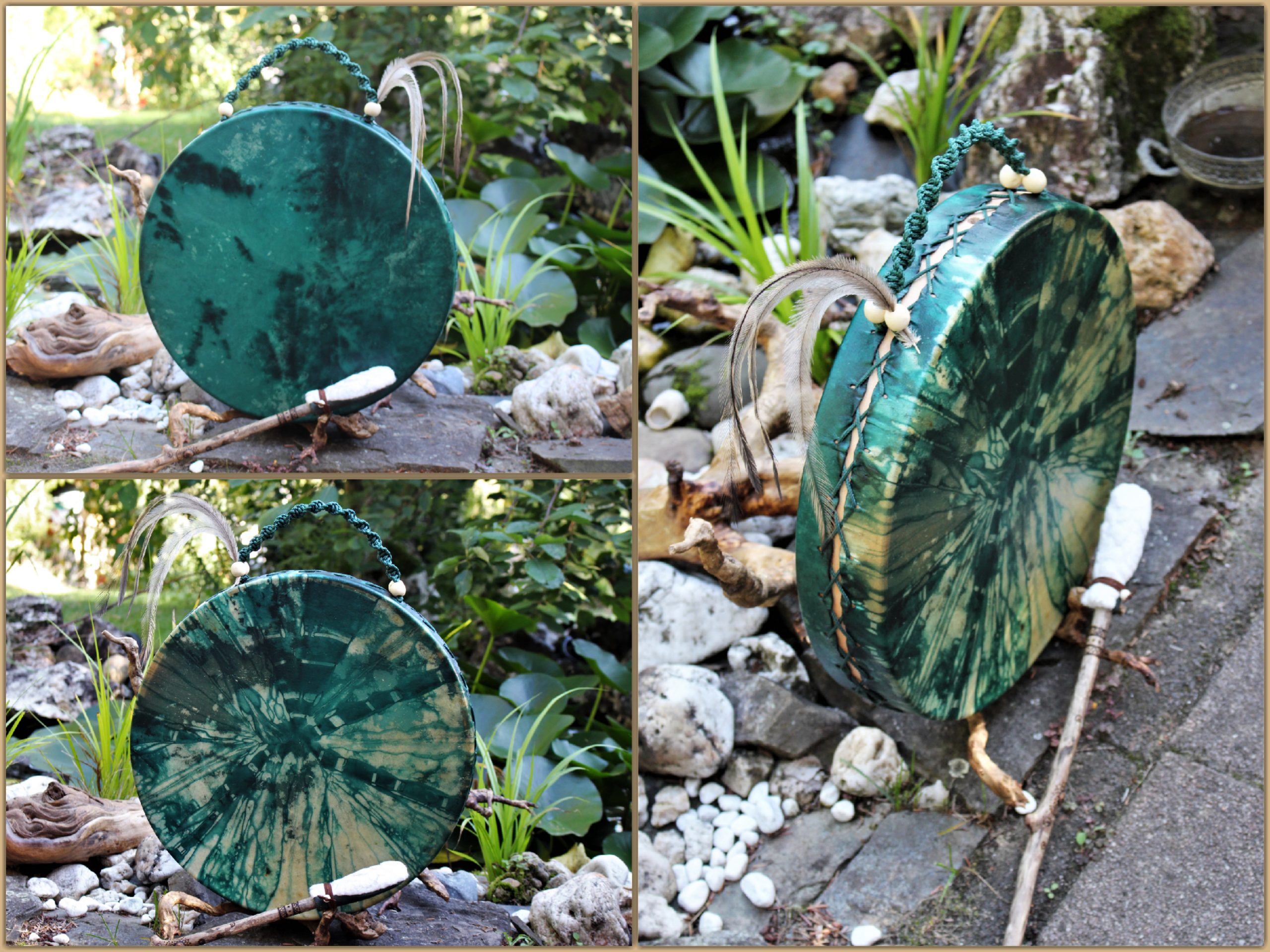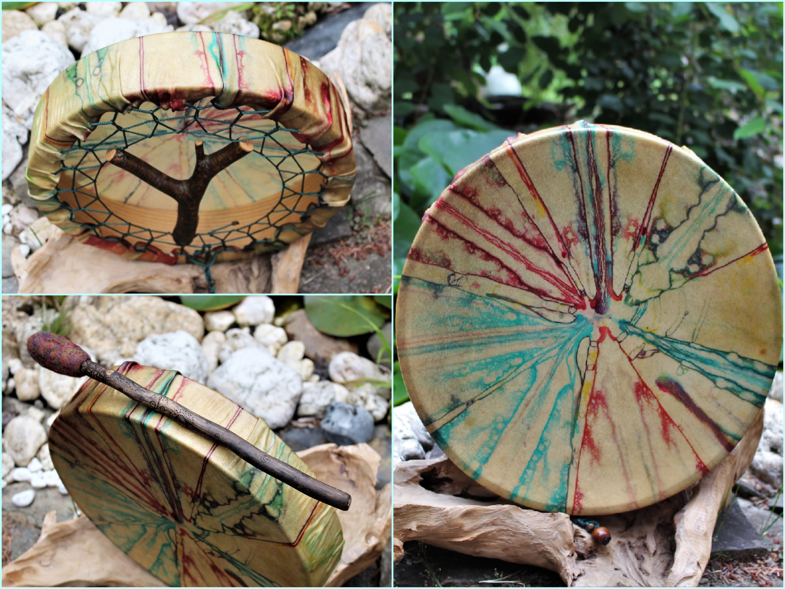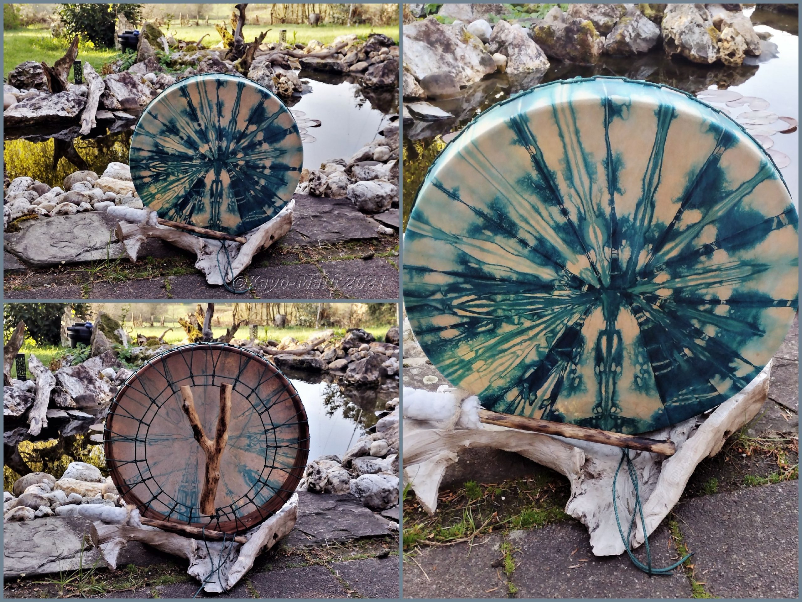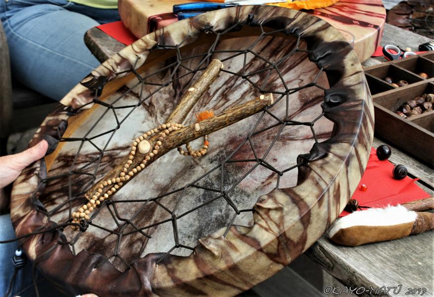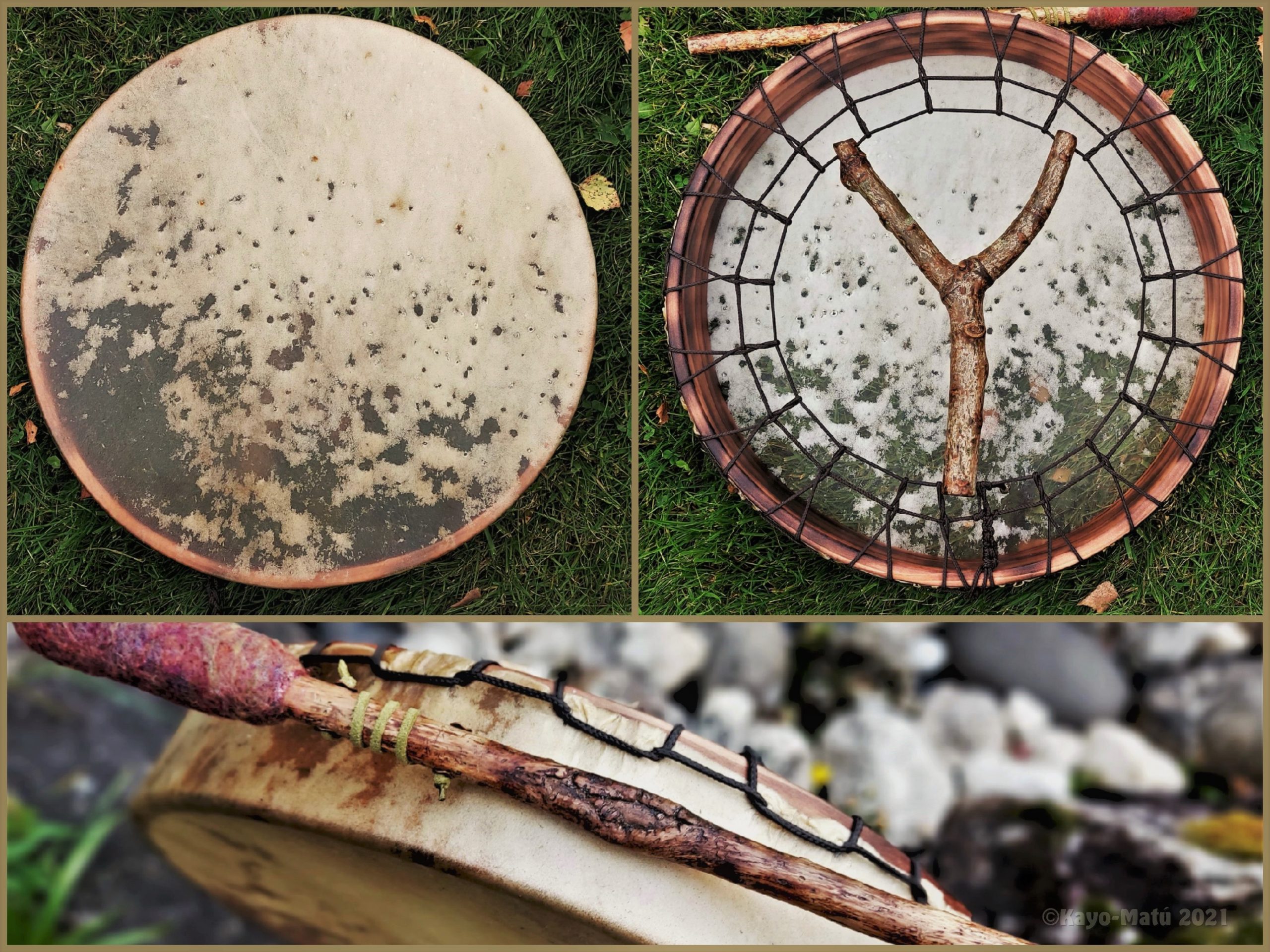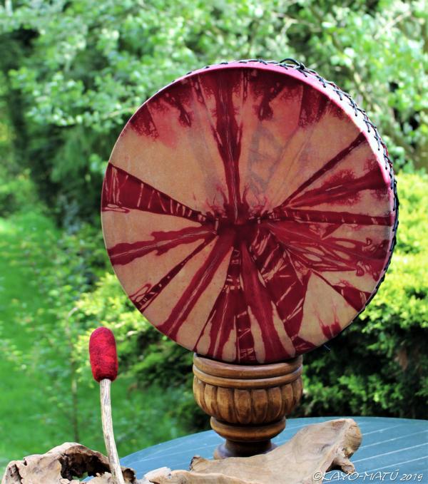 Im Laufe der vielen Jahre habe ich verschiedene Trommelmodelle gebaut. Hauptsächlich baue ich runde Trommeln mit Rahmen aus Weideholz von 35 – 40 und 45 cm im Durchmesser. Als Spannsystem verwende ich meine Ypsilon-Spannung und als Haltegriffe verwende ich naturgewachsene Astgabeln, die ebenfalls die Form eines Y haben. Spannsystem und Y-Form der Astgabel haben eine tiefe kosmologische Bedeutung in sich. Es kommt auch vor, dass ich Stenze, in sich gedrehtes Holz, als Haltegriffe verwende. Ich arbeite nur mit Nackt- rohhäuten vorzugsweise vom Hirsch, gelegentlich auch vom Pferd, da diese die besten Klangeigenschaften besitzen. Ca. 2010 entwickelte ich die Insubania-Färbetechnik (Sonnenbatik) auf der Tierhaut, das bedeutet, ein langer Such-und Ausprobier-Prozess, welche Naturfarbe auf Dauer auf Tierhäuten hält.