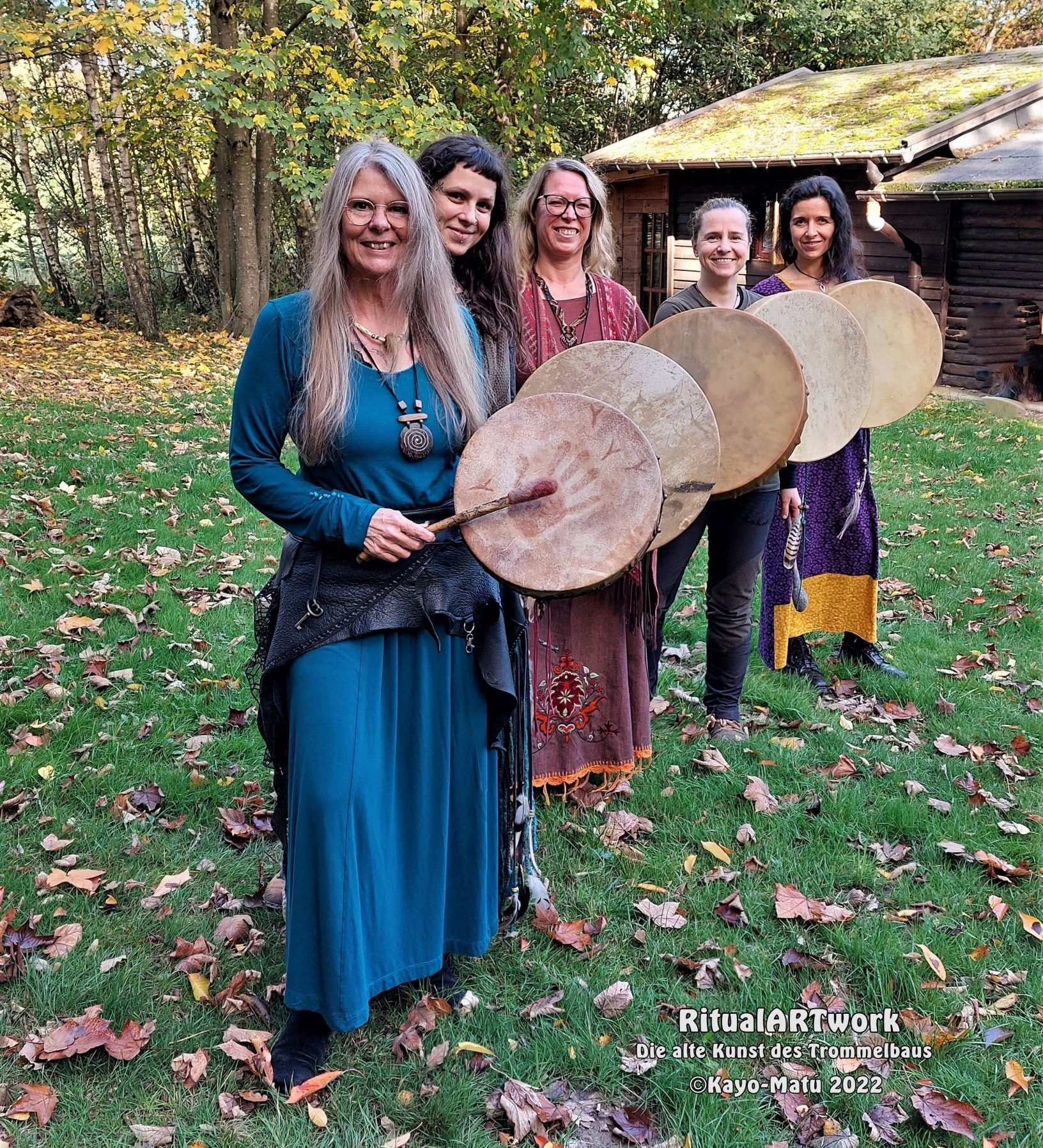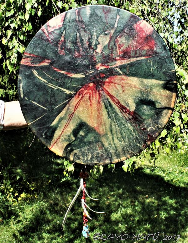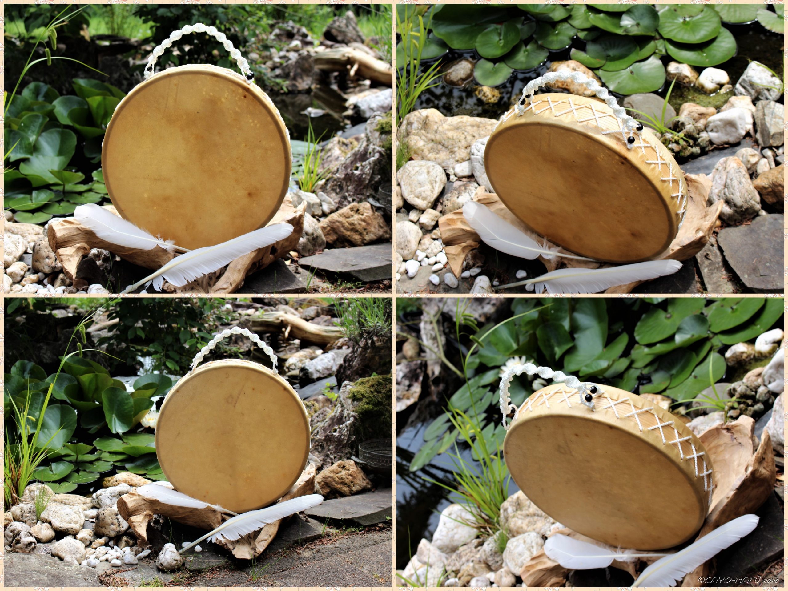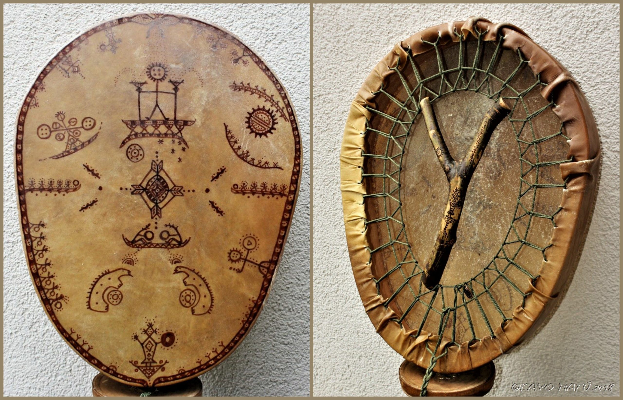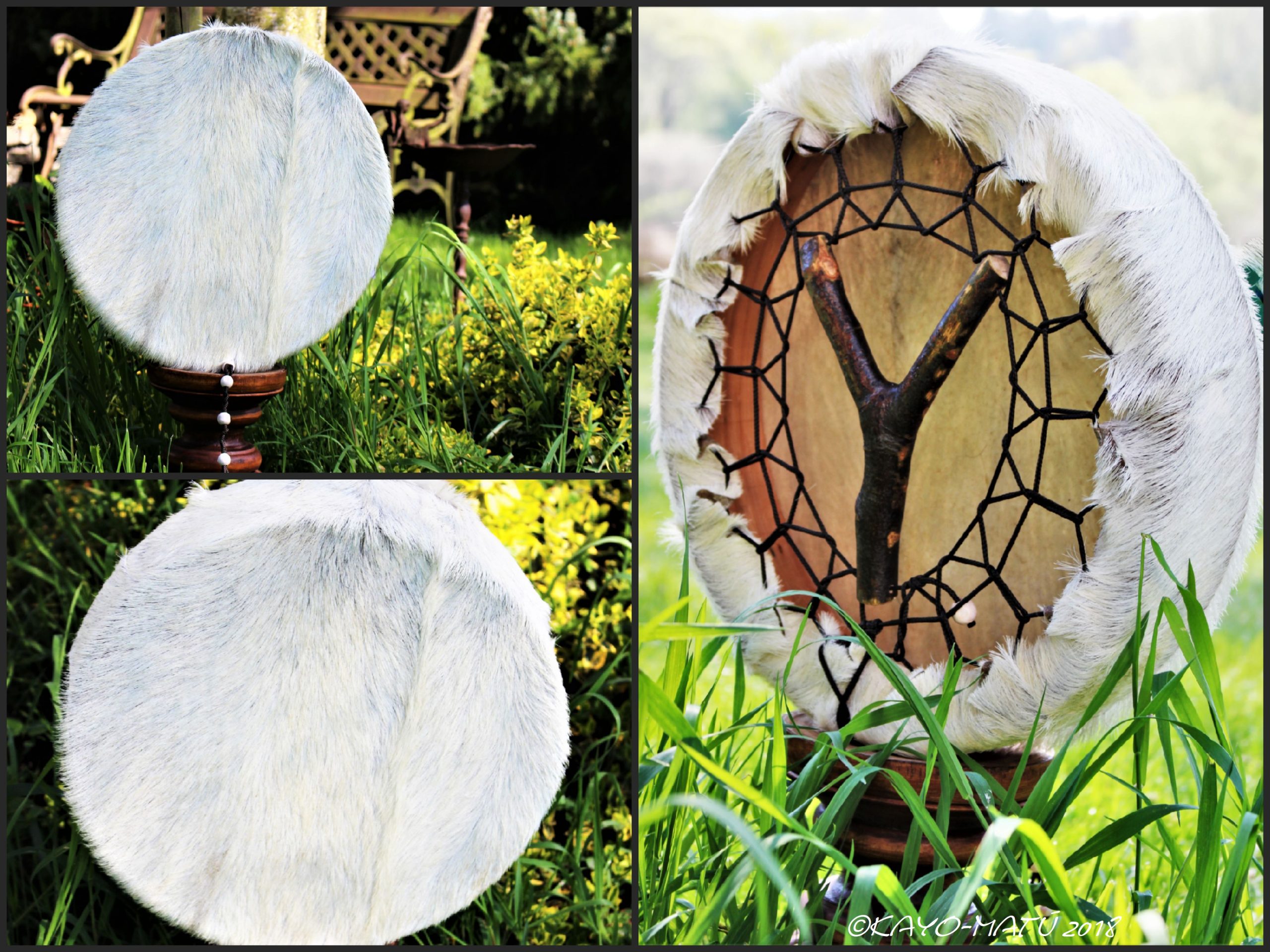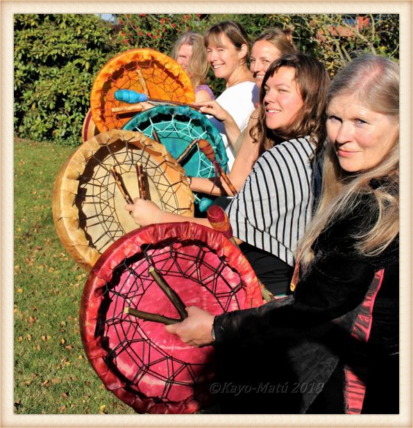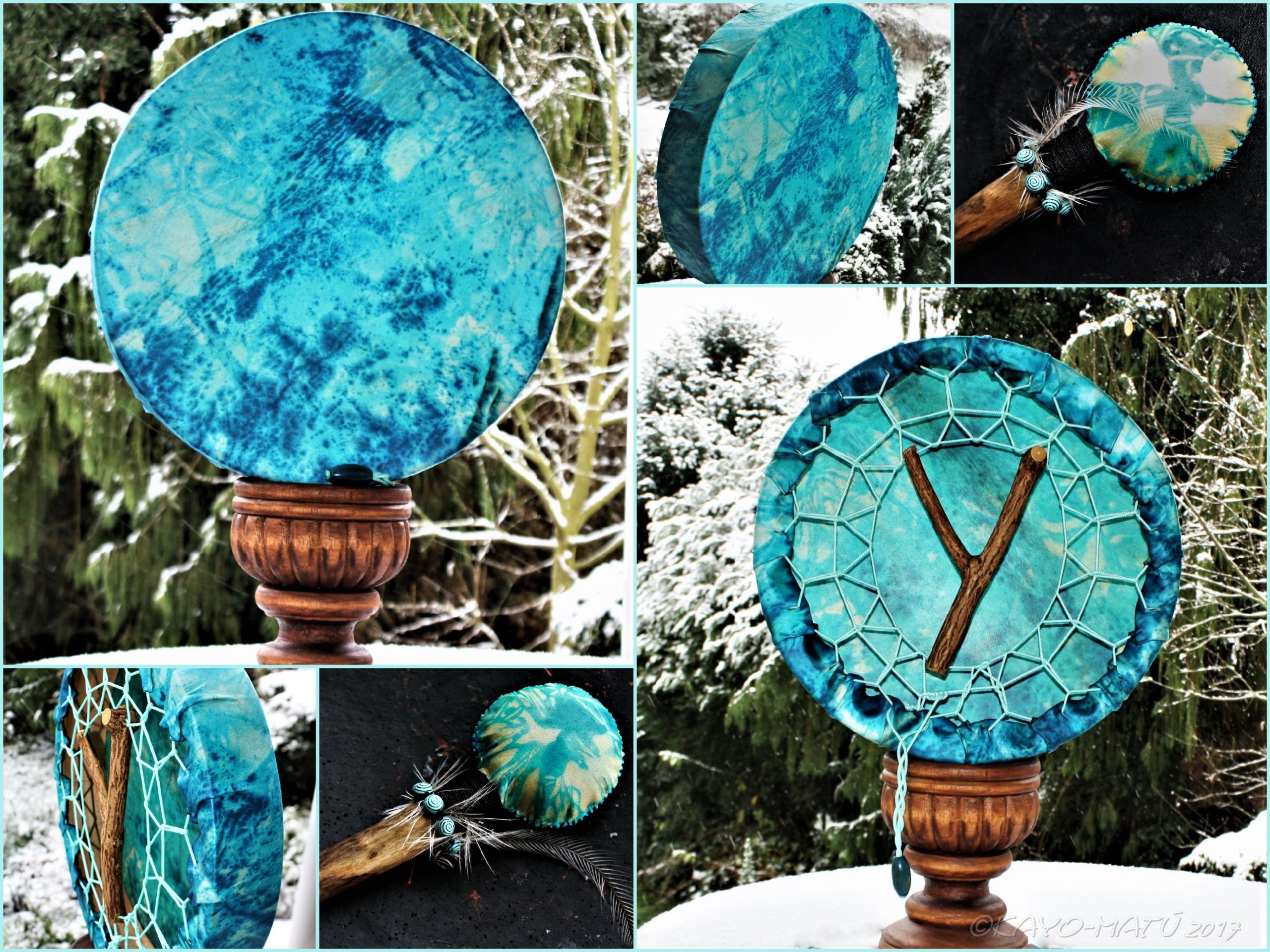 Im Laufe der vielen Jahre habe ich verschiedene Trommelmodelle gebaut. Hauptsächlich baue ich runde Trommeln mit Rahmen aus Weideholz von 35 – 40 und 45 cm im Durchmesser. Als Spannsystem verwende ich meine Ypsilon-Spannung und als Haltegriffe verwende ich naturgewachsene Astgabeln, die ebenfalls die Form eines Y haben. Spannsystem und Y-Form der Astgabel haben eine tiefe kosmologische Bedeutung in sich. Es kommt auch vor, dass ich Stenze, in sich gedrehtes Holz, als Haltegriffe verwende. Ich arbeite nur mit Nackt- rohhäuten vorzugsweise vom Hirsch, gelegentlich auch vom Pferd, da diese die besten Klangeigenschaften besitzen. Ca. 2010 entwickelte ich die Insubania-Färbetechnik (Sonnenbatik) auf der Tierhaut, das bedeutet, ein langer Such-und Ausprobier-Prozess, welche Naturfarbe auf Dauer auf Tierhäuten hält.