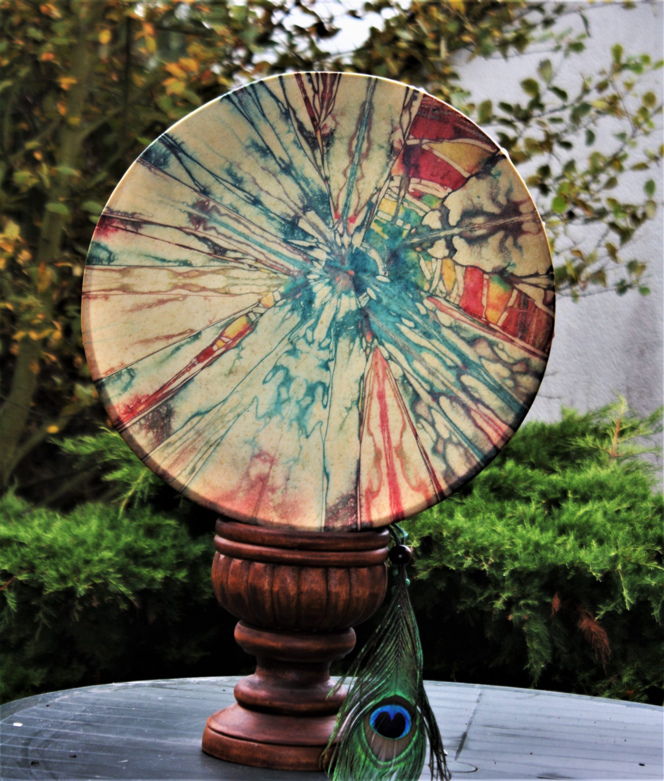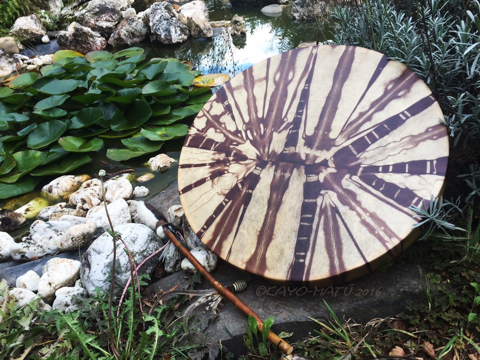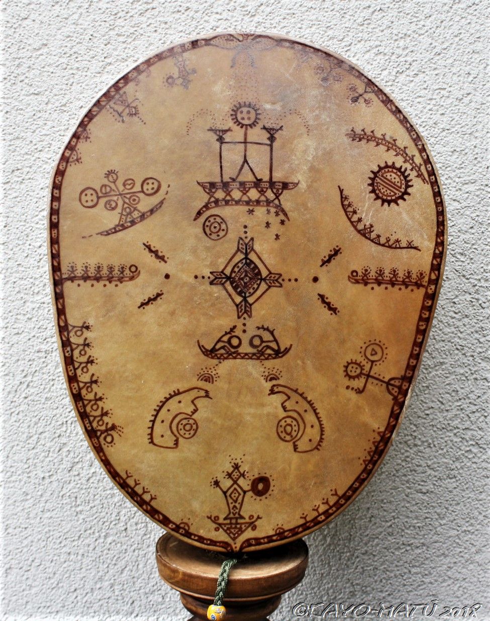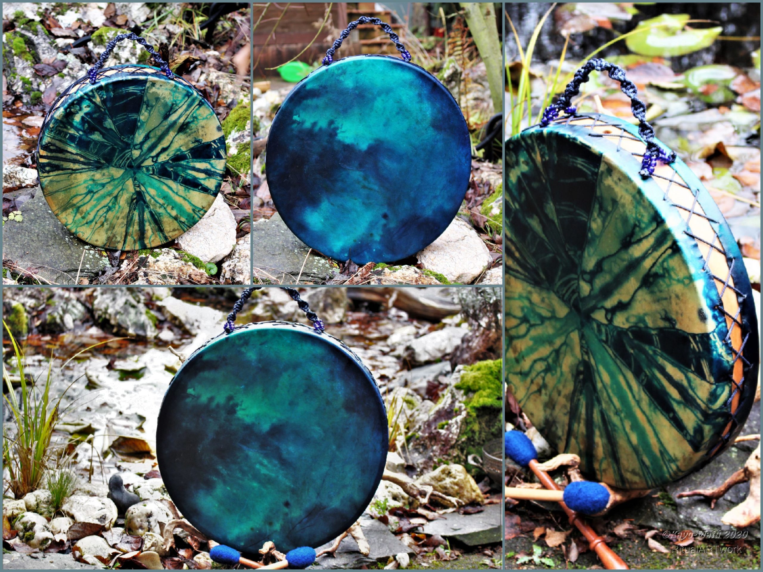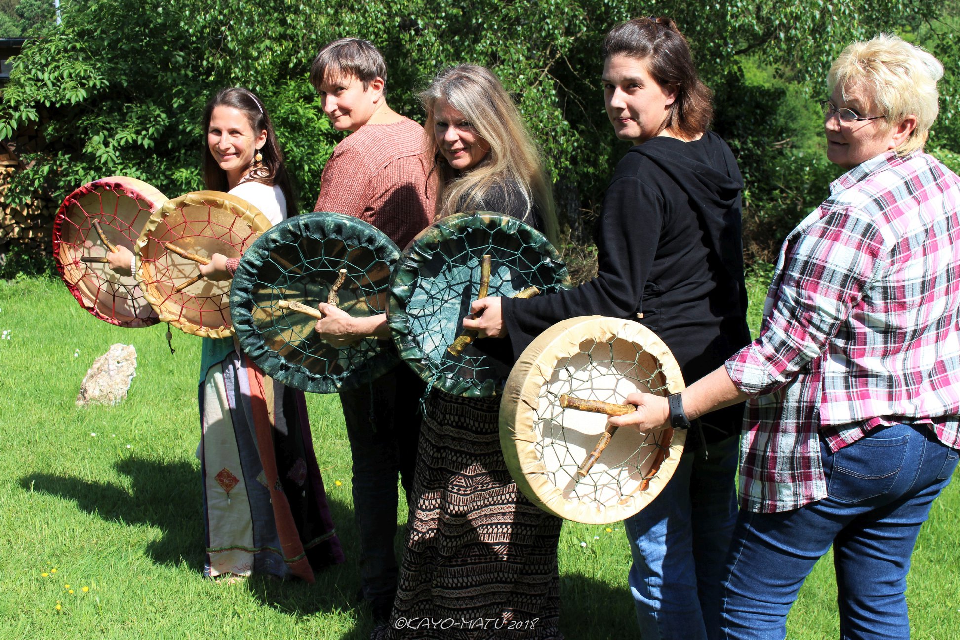 Im Laufe der vielen Jahre habe ich verschiedene Trommelmodelle gebaut. Hauptsächlich baue ich runde Trommeln mit Rahmen aus Weideholz von 35 – 40 und 45 cm im Durchmesser. Als Spannsystem verwende ich meine Ypsilon-Spannung und als Haltegriffe verwende ich naturgewachsene Astgabeln, die ebenfalls die Form eines Y haben. Spannsystem und Y-Form der Astgabel haben eine tiefe kosmologische Bedeutung in sich. Es kommt auch vor, dass ich Stenze, in sich gedrehtes Holz, als Haltegriffe verwende. Ich arbeite nur mit Nackt- rohhäuten vorzugsweise vom Hirsch, gelegentlich auch vom Pferd, da diese die besten Klangeigenschaften besitzen. Ca. 2010 entwickelte ich die Insubania-Färbetechnik (Sonnenbatik) auf der Tierhaut, das bedeutet, ein langer Such-und Ausprobier-Prozess, welche Naturfarbe auf Dauer auf Tierhäuten hält.